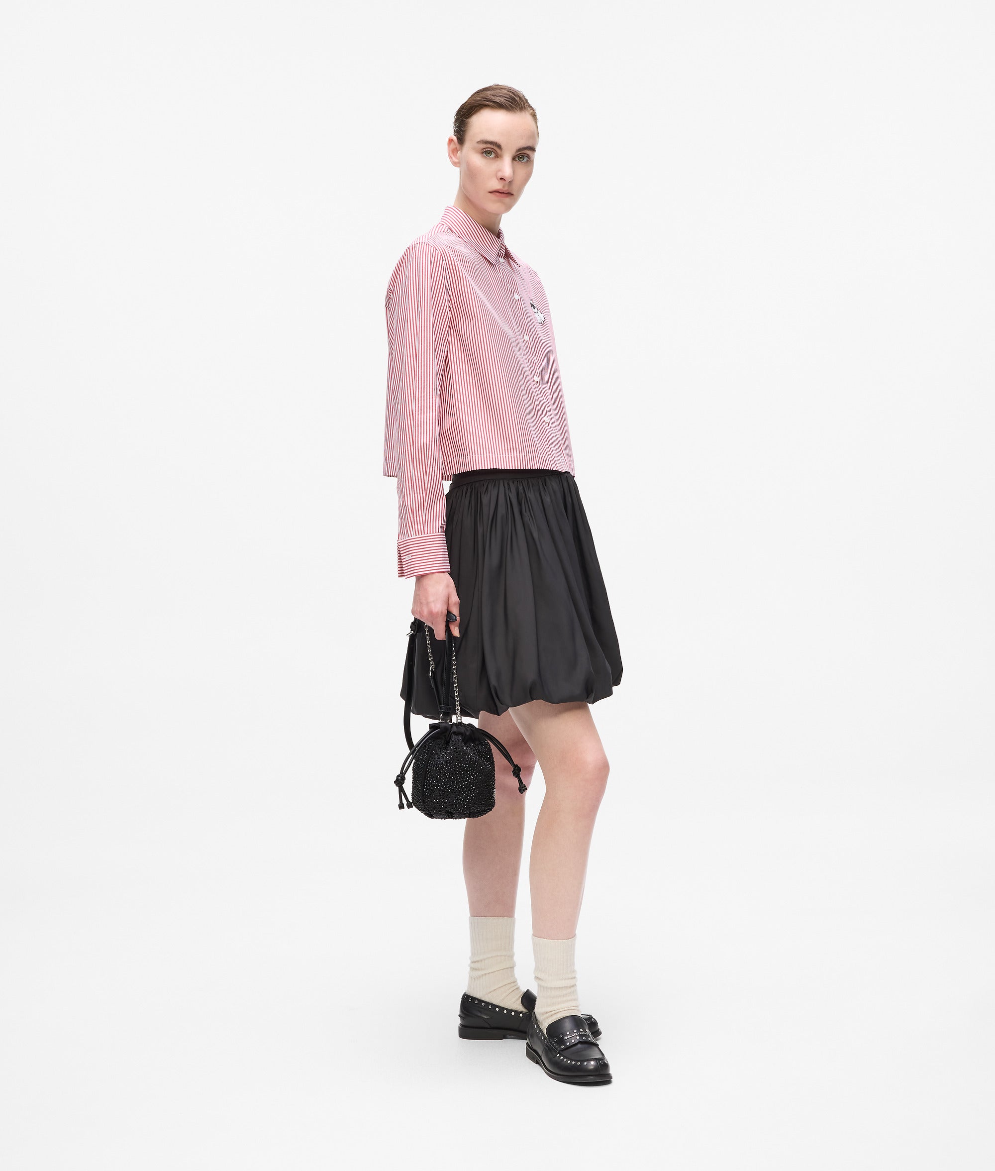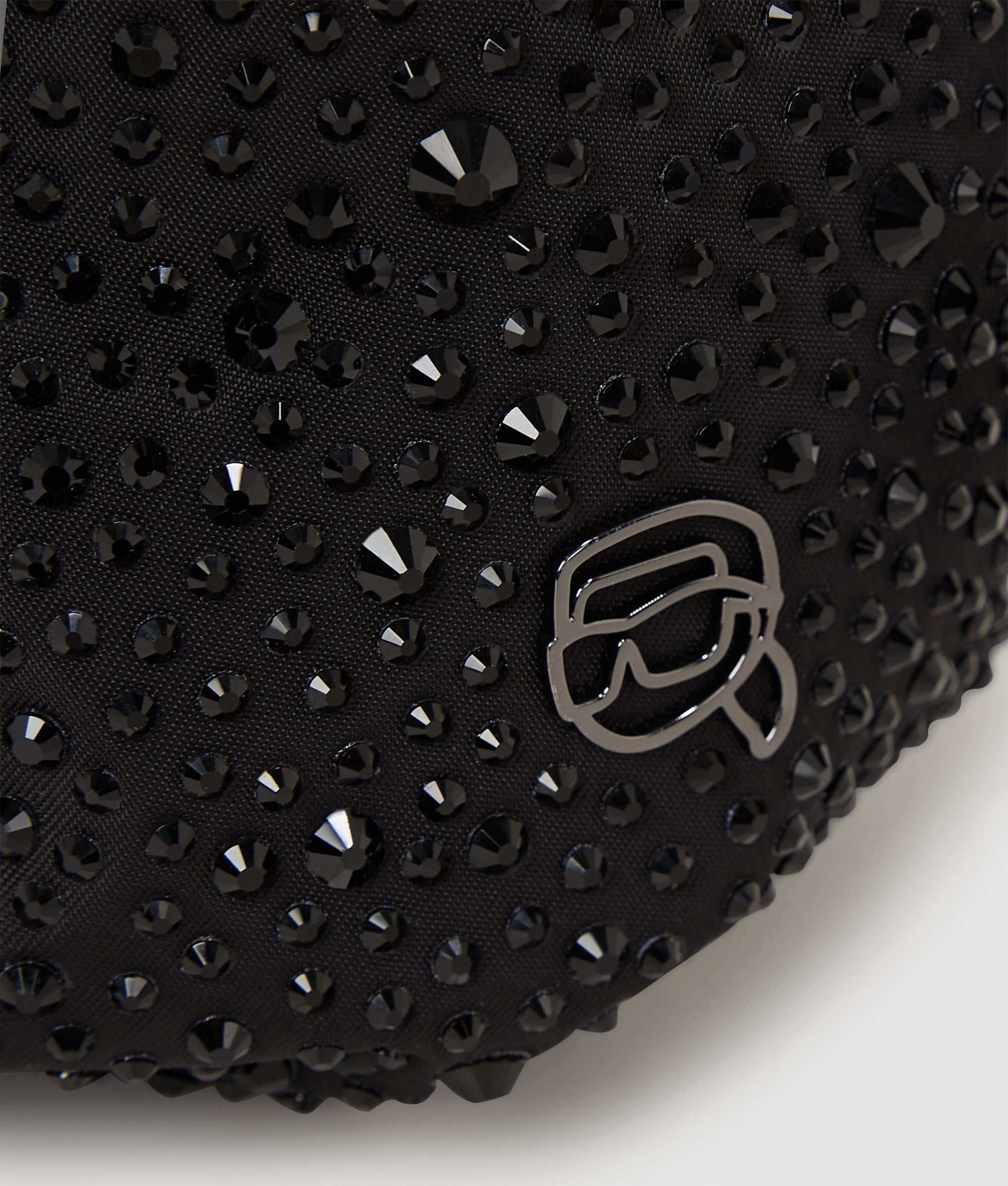 全体にあしらわれたきらめくラインストーンと遊び心のあるIKONカールのピンが遊び心あふれるエレガントさを醸し出す小ぶりなバケットバッグ。ドローストリングとマグネットの開閉部と、取り外し可能なクロスボディストラップは、スタイルと実用性を兼備。
