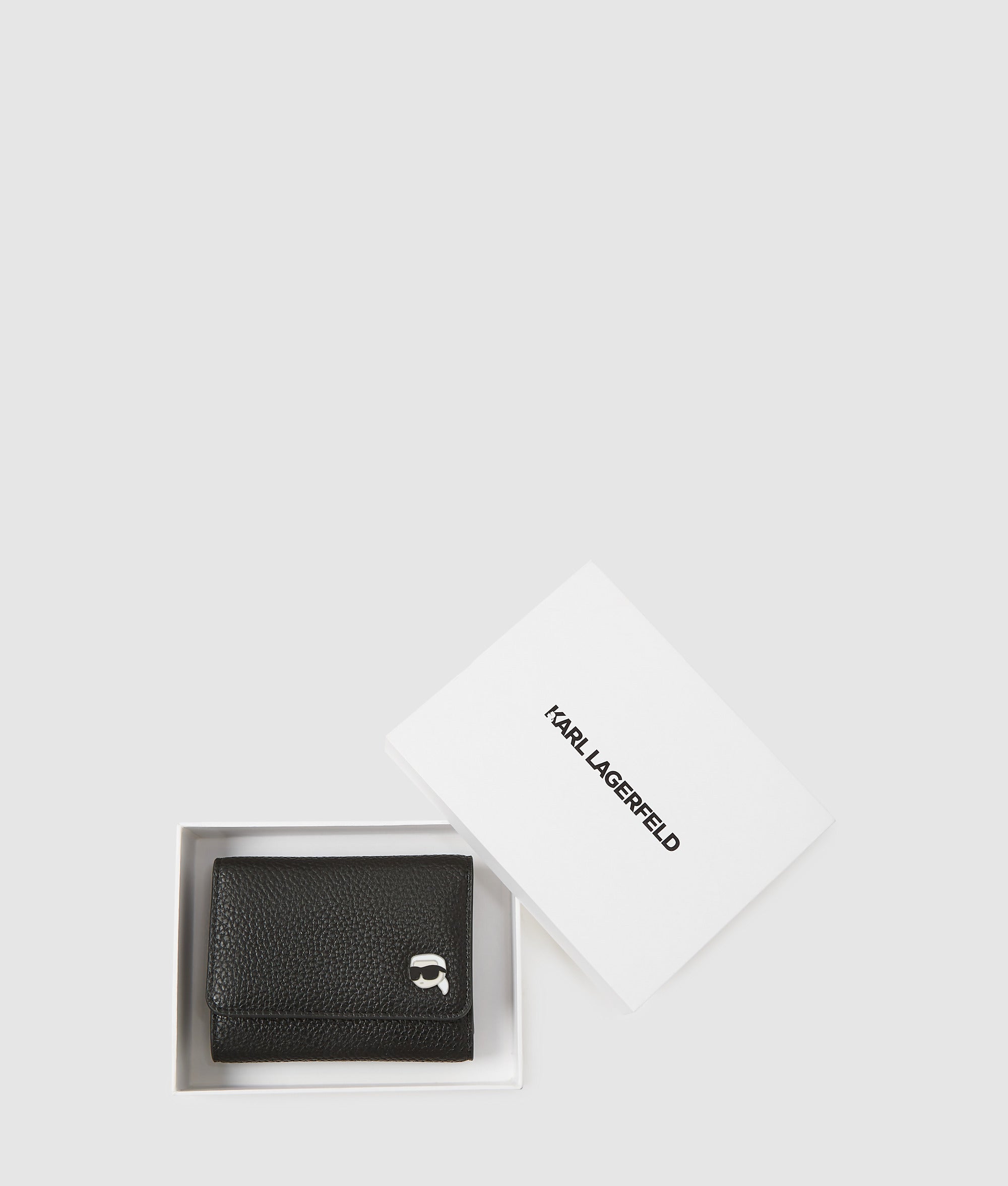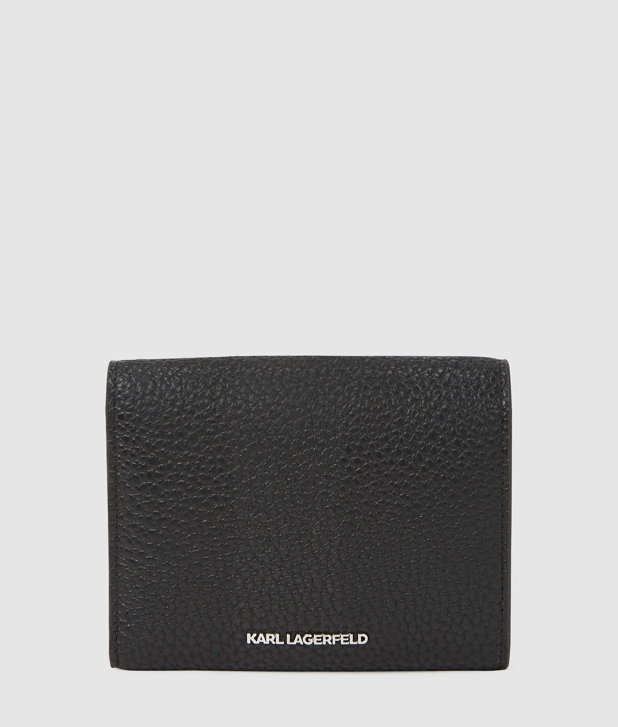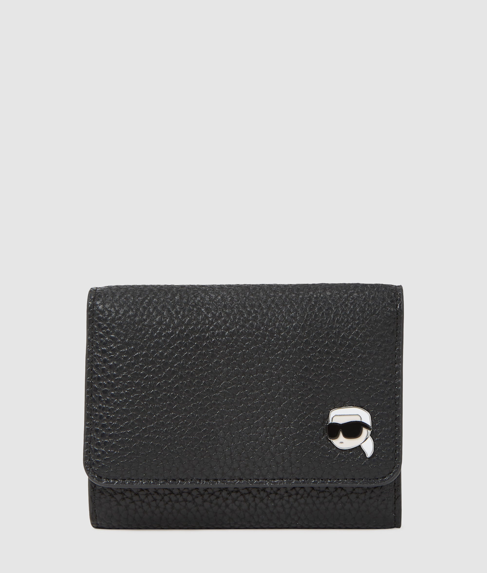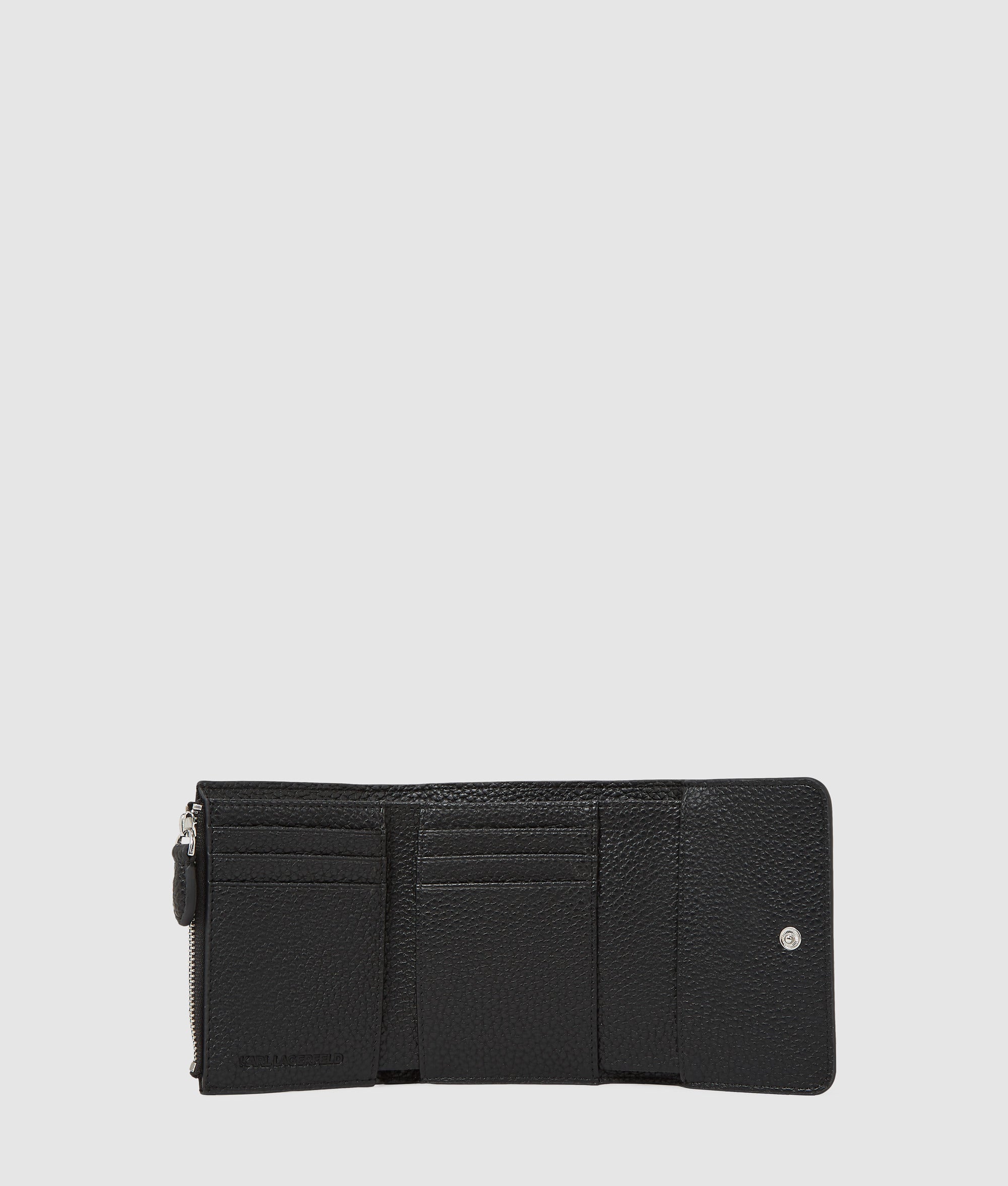 複数のスロットとジッパー付きコンパートメント、小石の質感のある三つ折りサイフ。実用的な収納が可能。