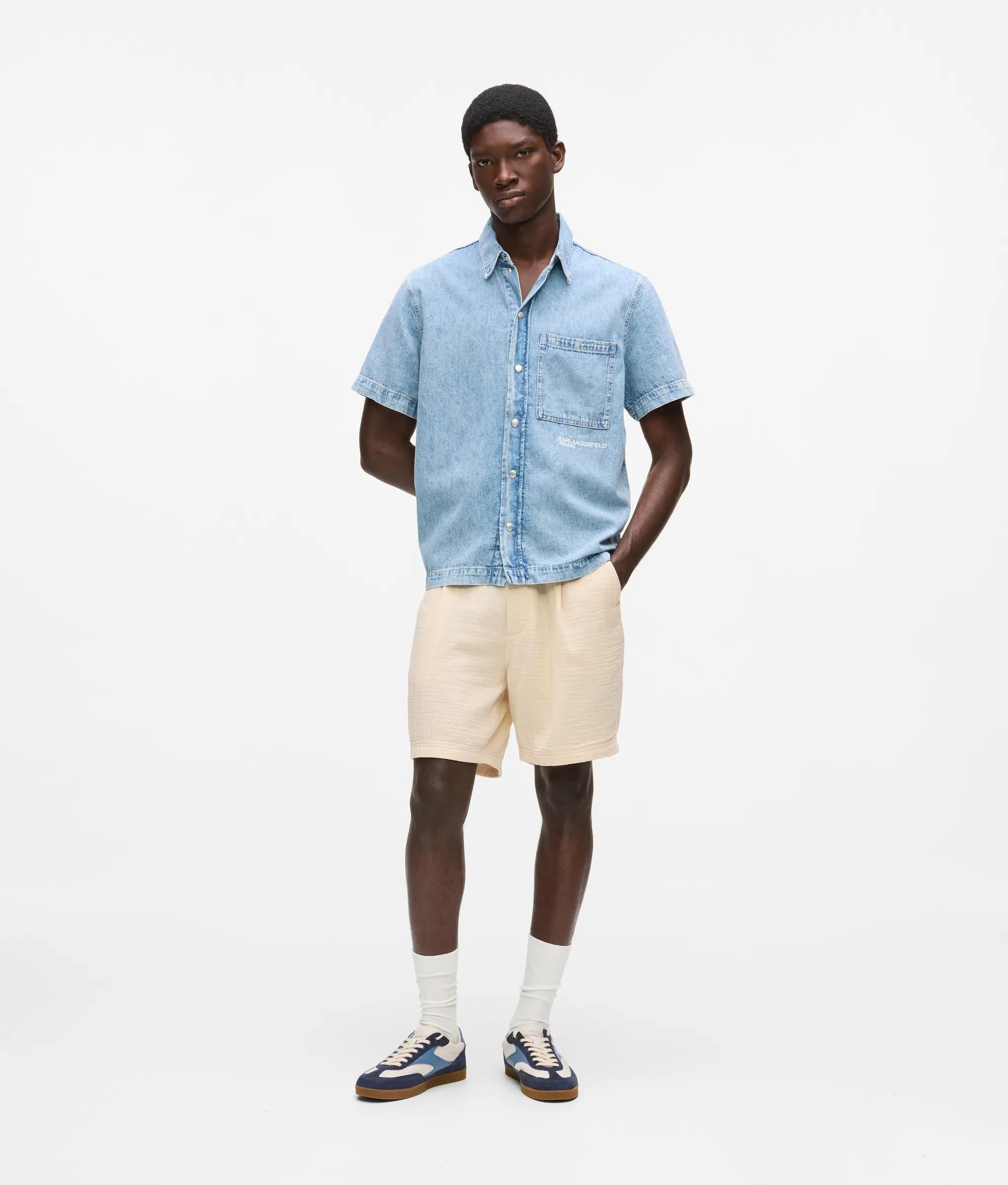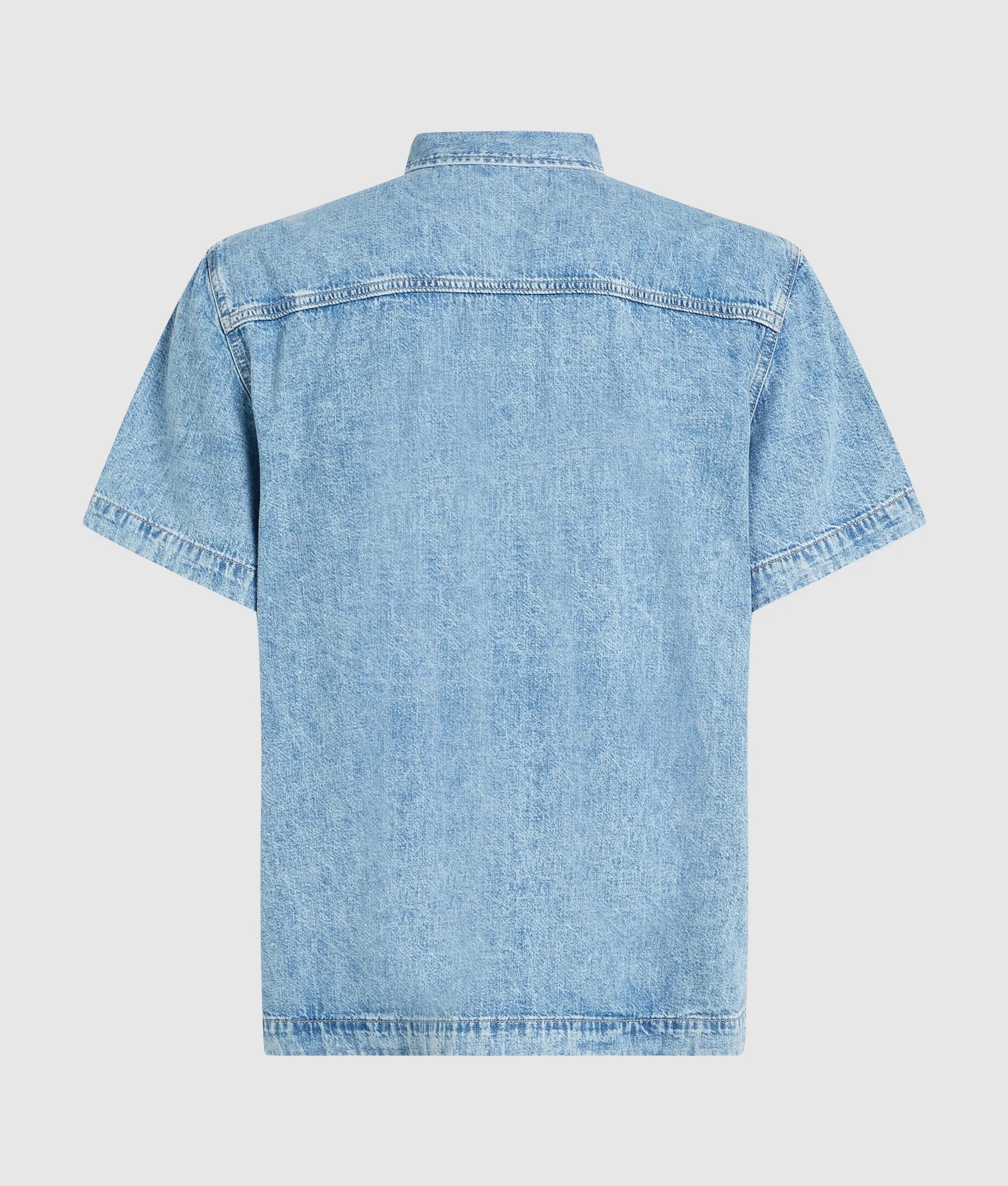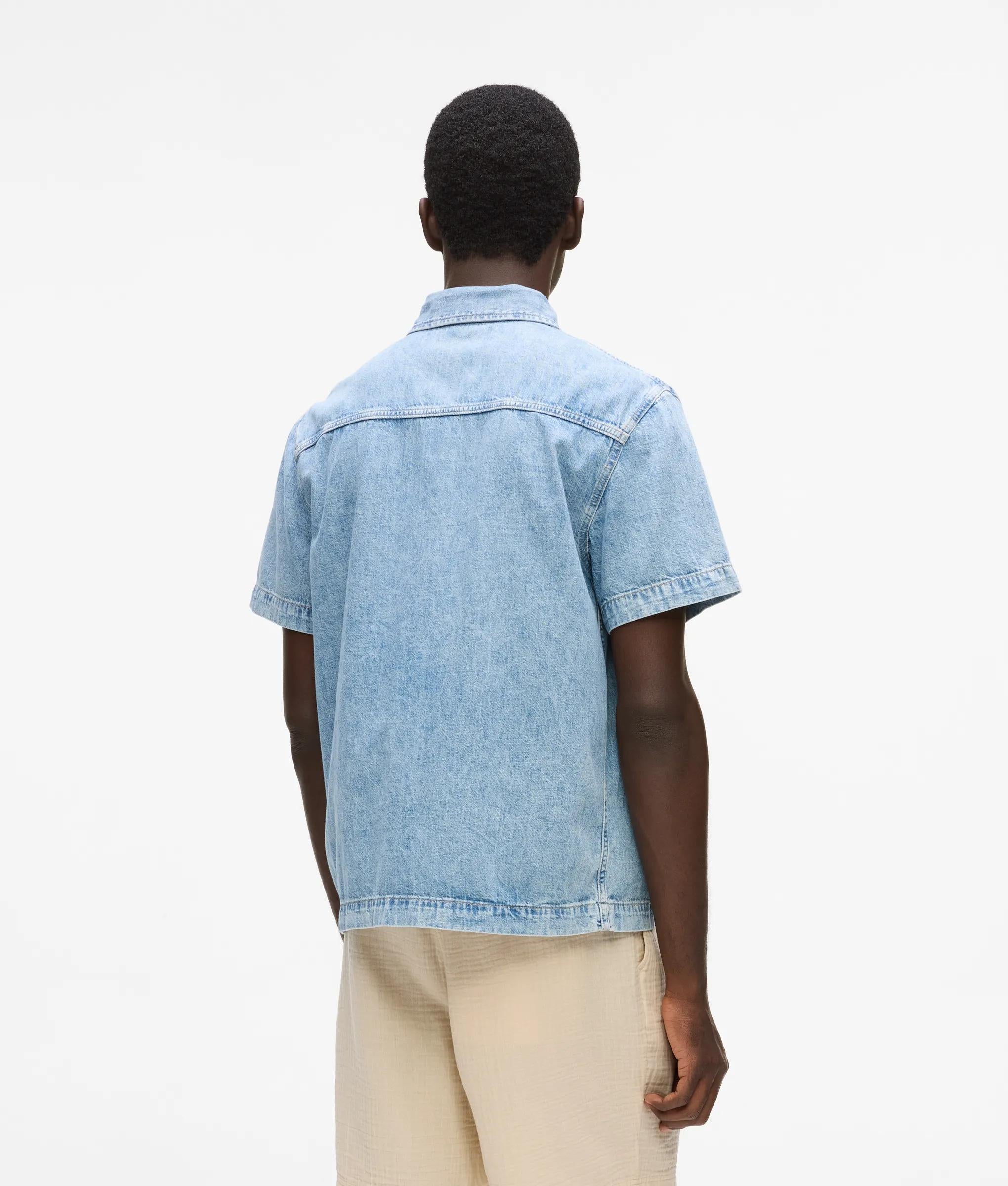 アシッドウォッシュのデニムで作られた半袖シャツは、夏のワードローブに退色加工を施した、着古したような雰囲気のアイテム。一枚で着たり、タンクトップの上に重ね着したりすれば、気軽に楽しめるオフの日のスタイルに。