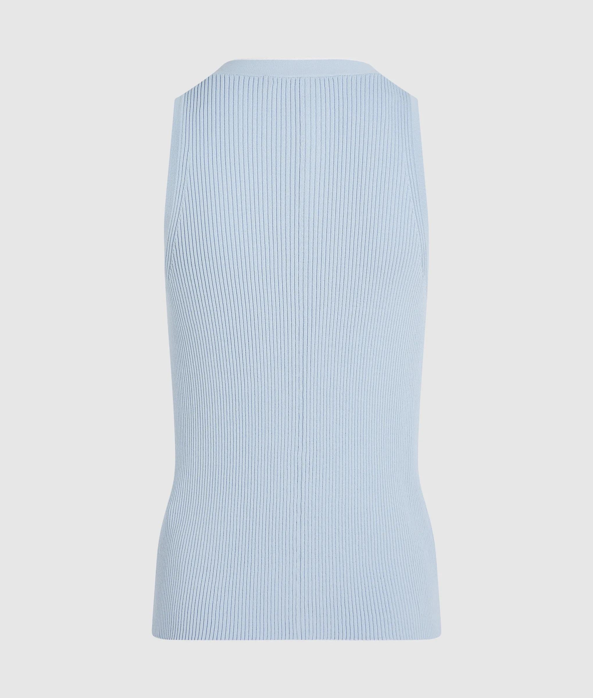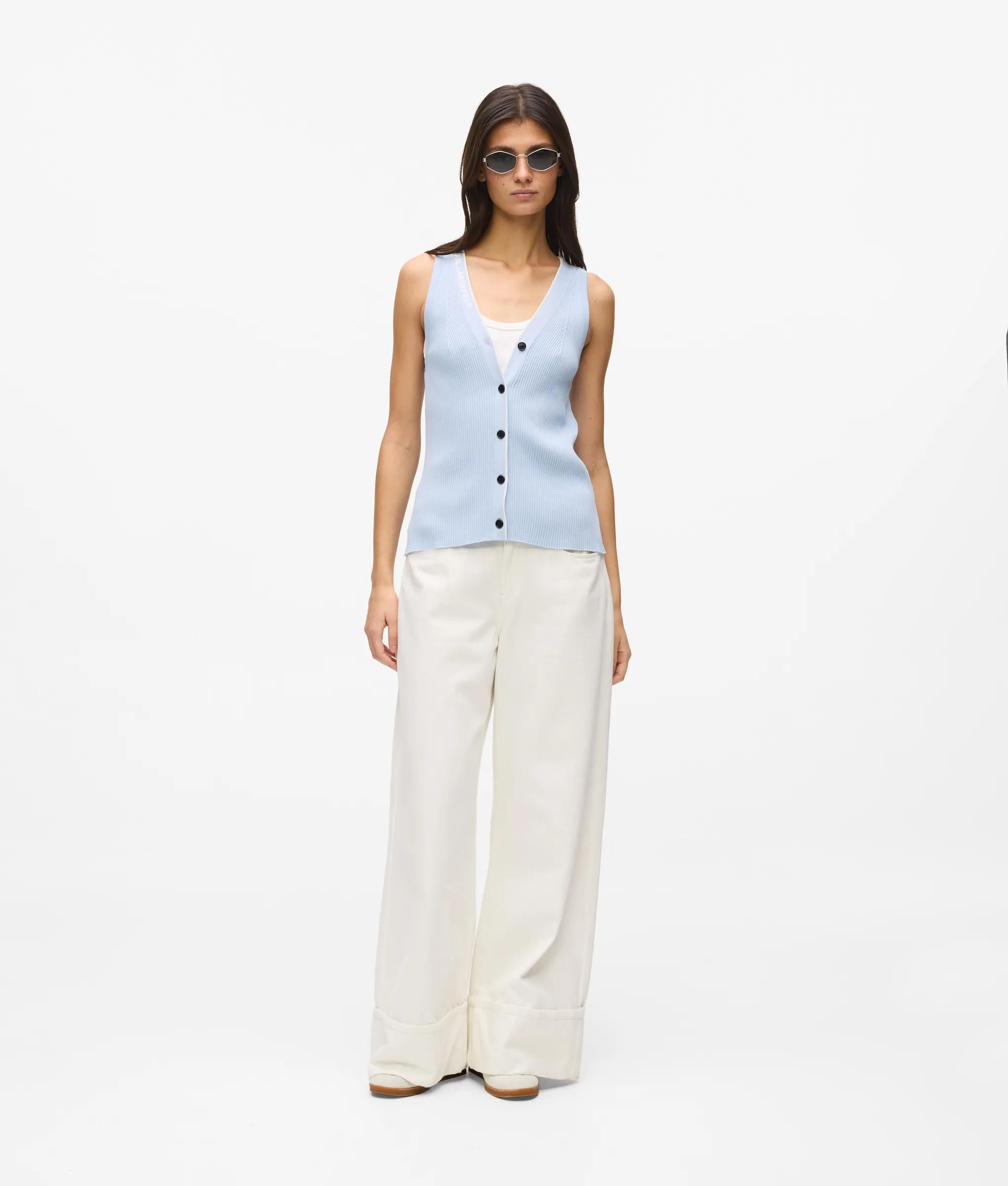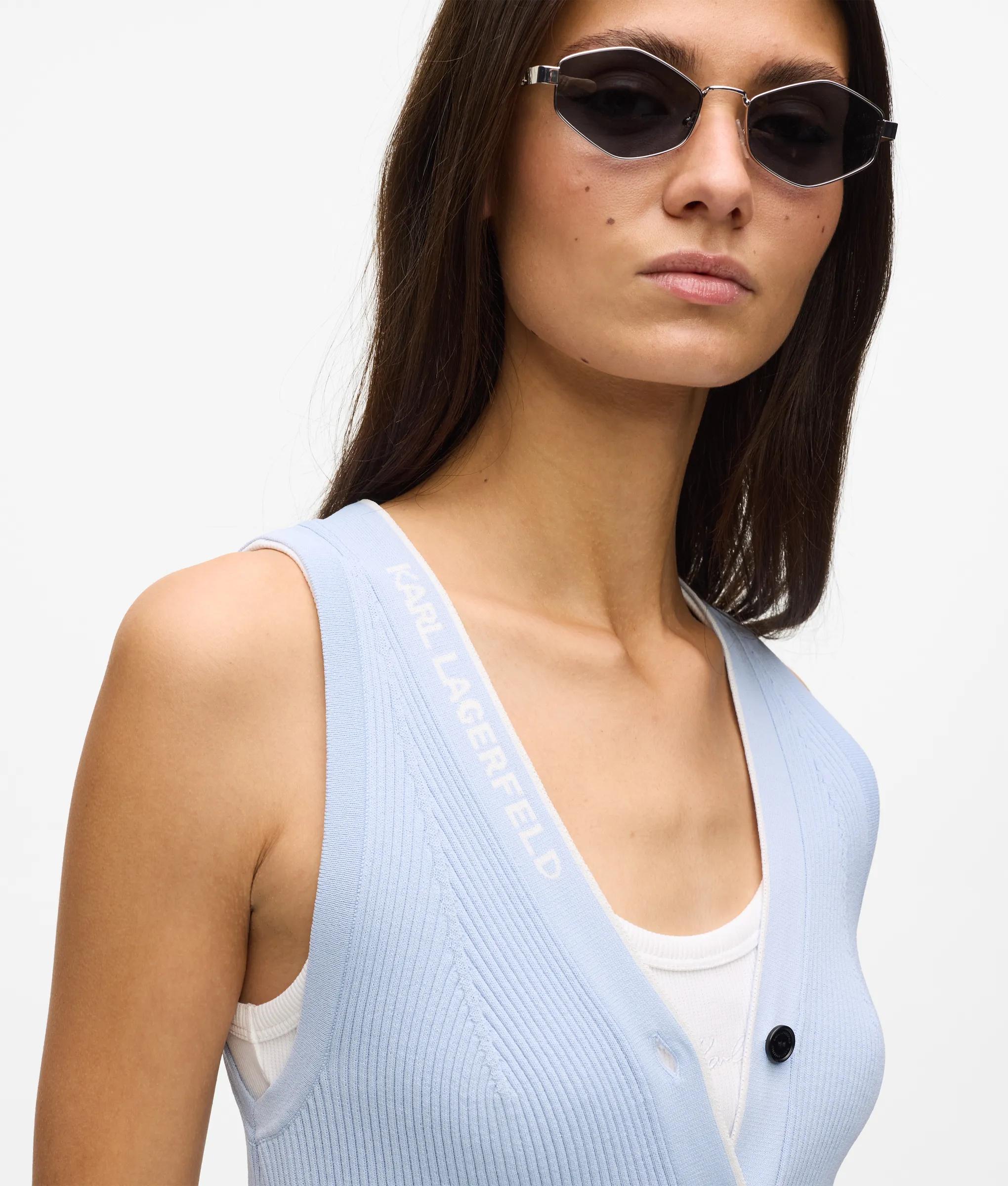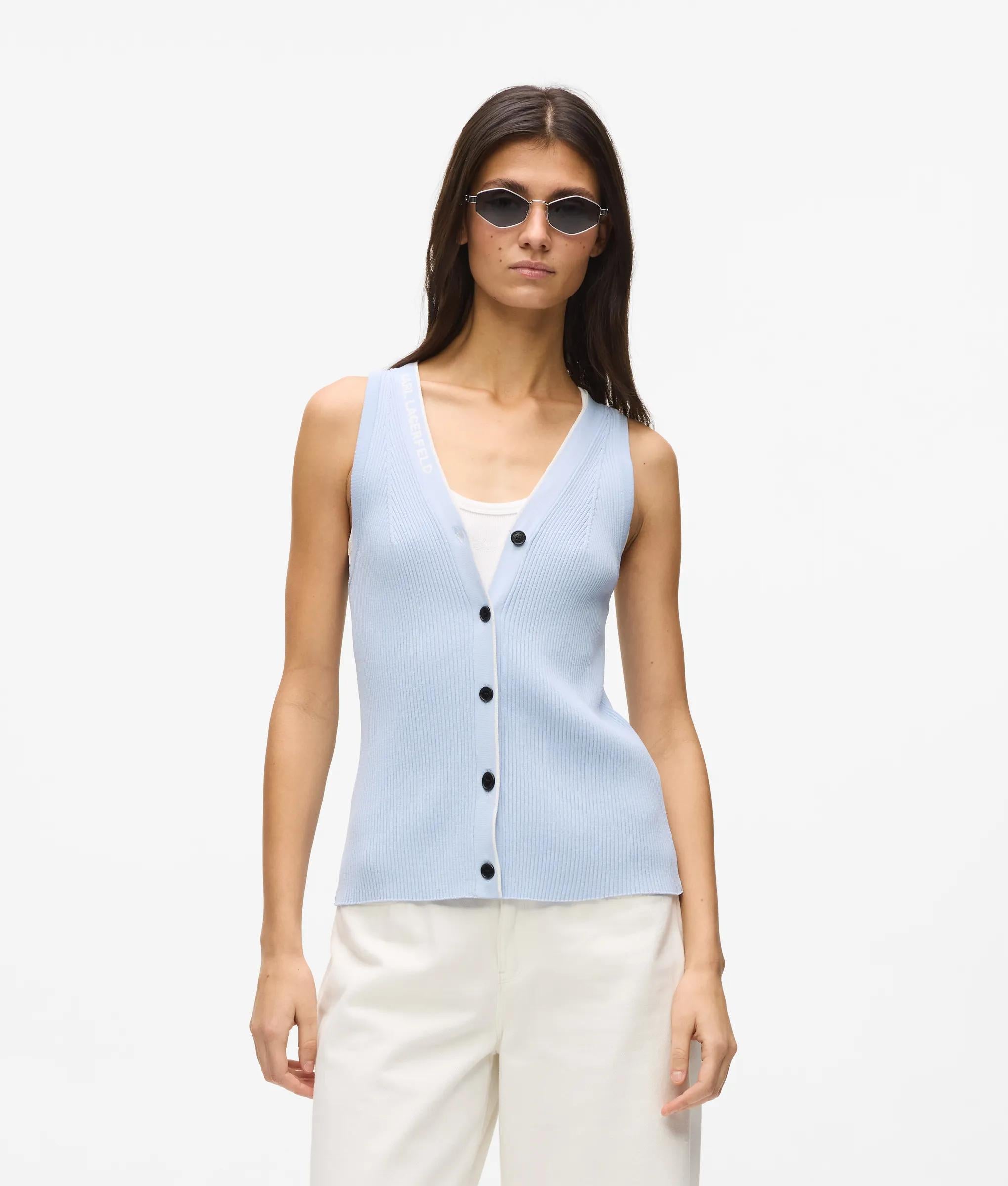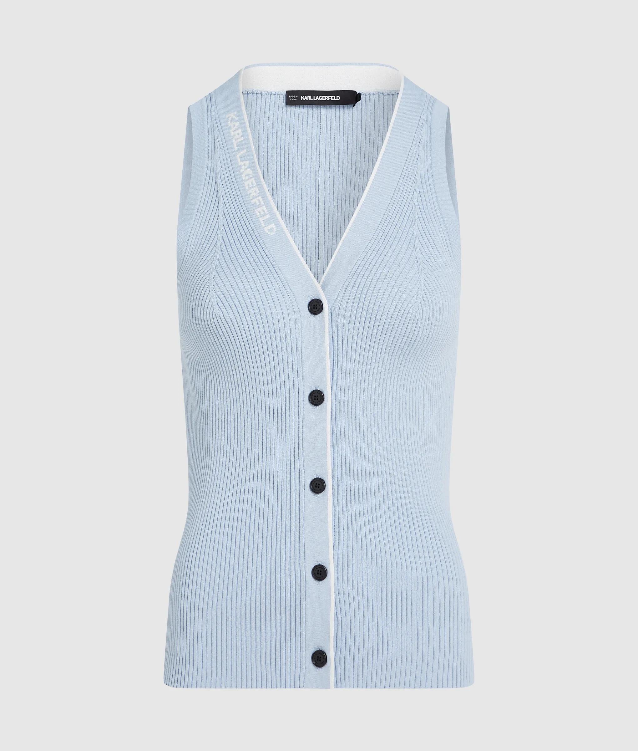 リブ編みの質感があるノースリーブのニットトップスは、コントラストの効いたパイピングと存在感のあるKARL LAGERFELDのロゴが特徴。