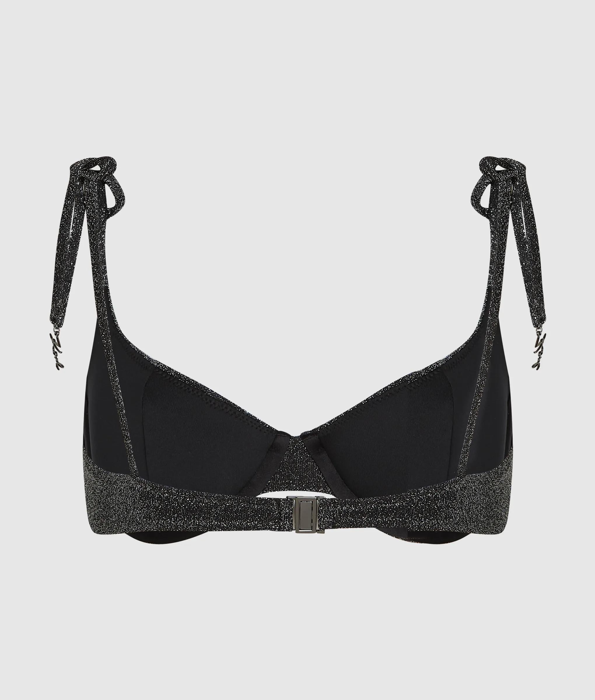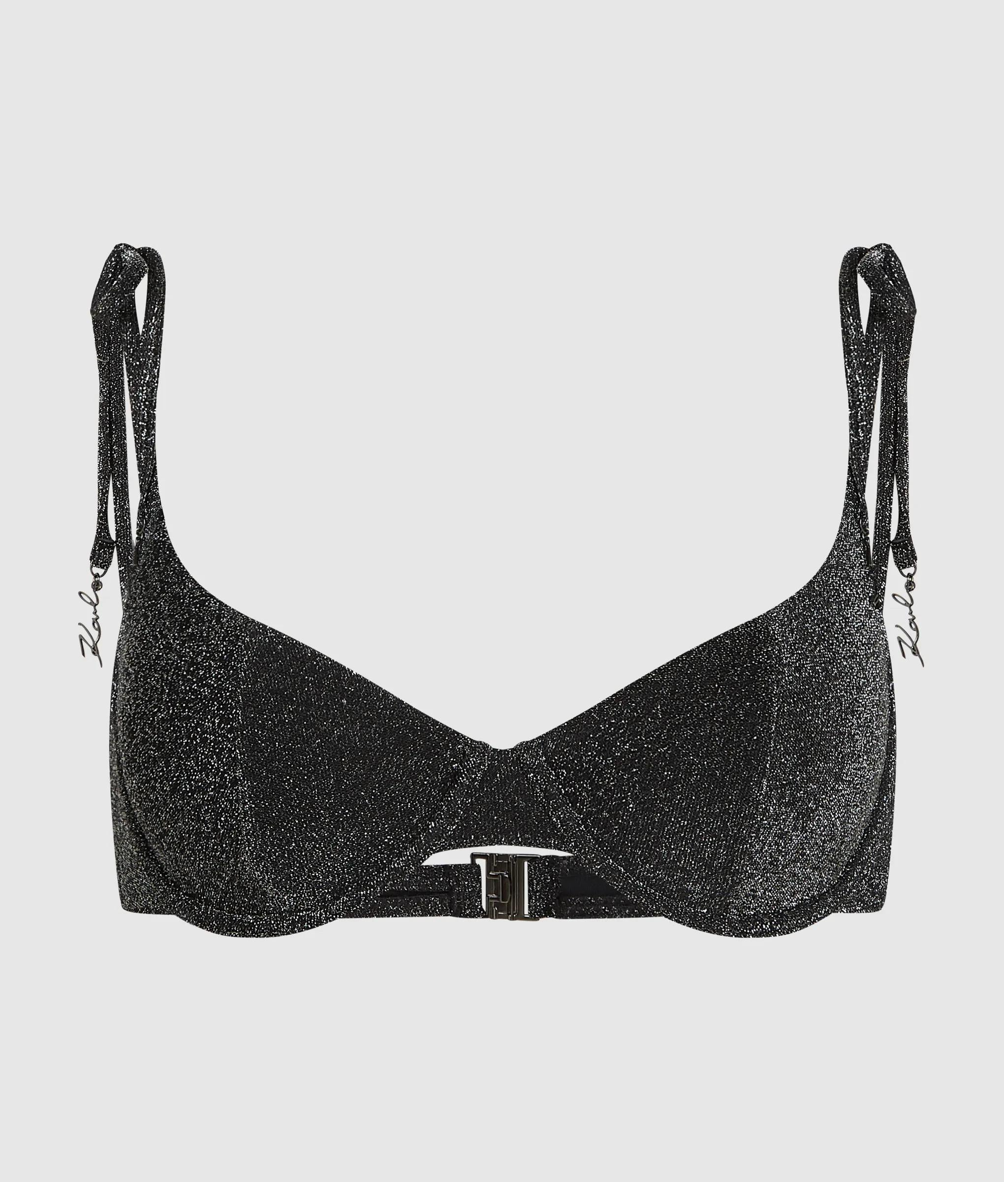 メタリックな輝きが光を捉えるワイヤー入りビキニトップス。セルフタイストラップと背面にフックのデザインで、 洗練された輝きを放つスタイルを演出。