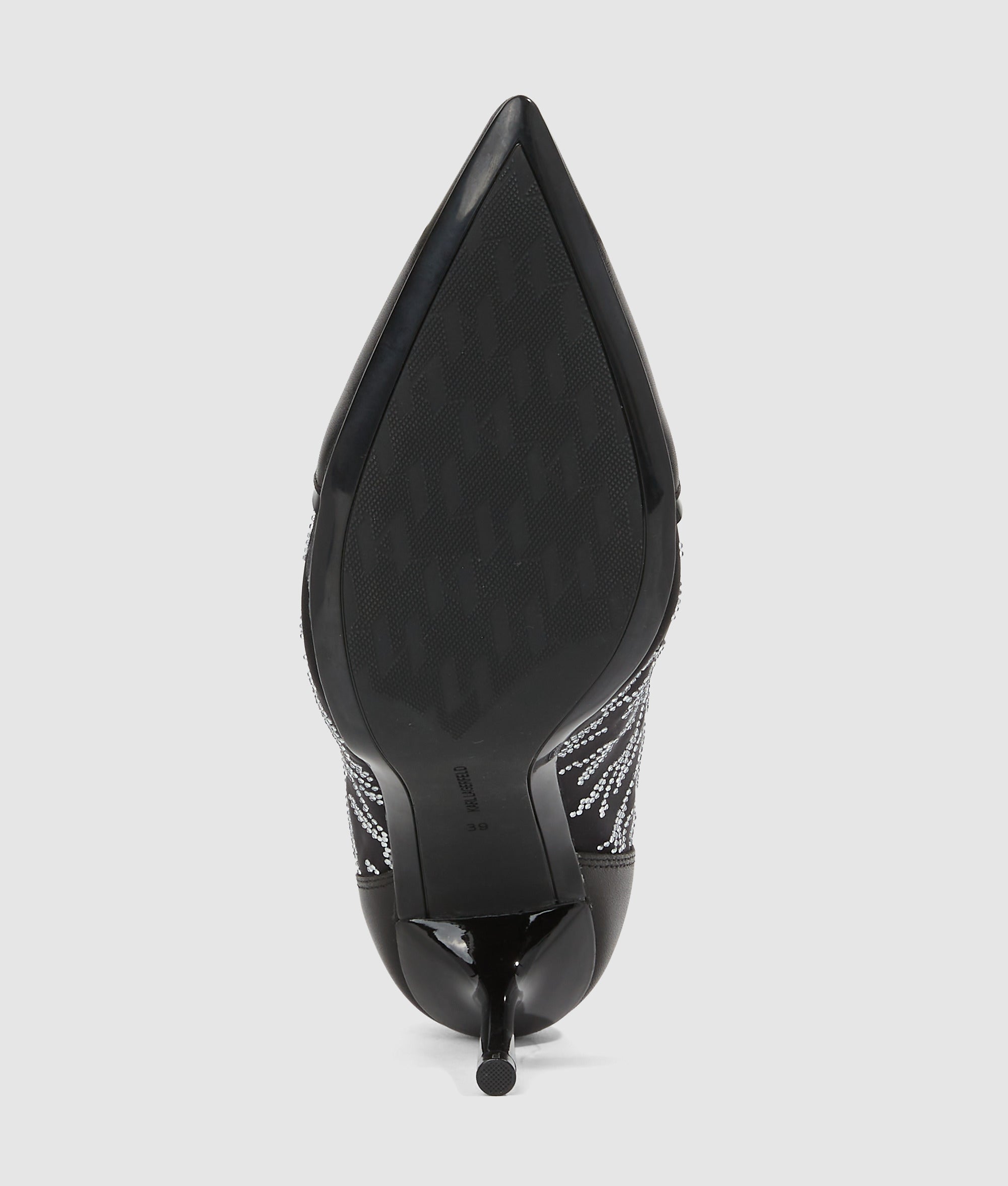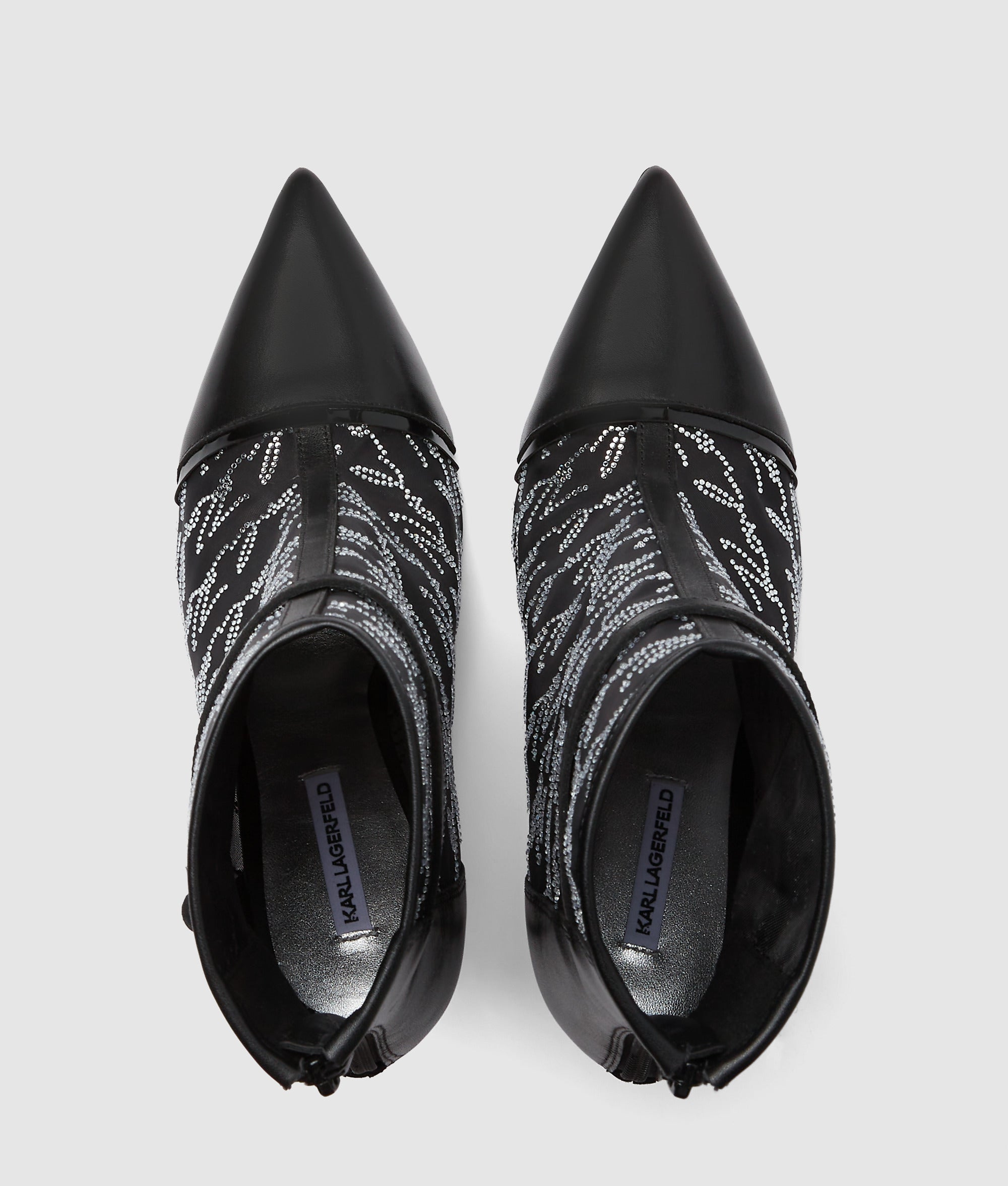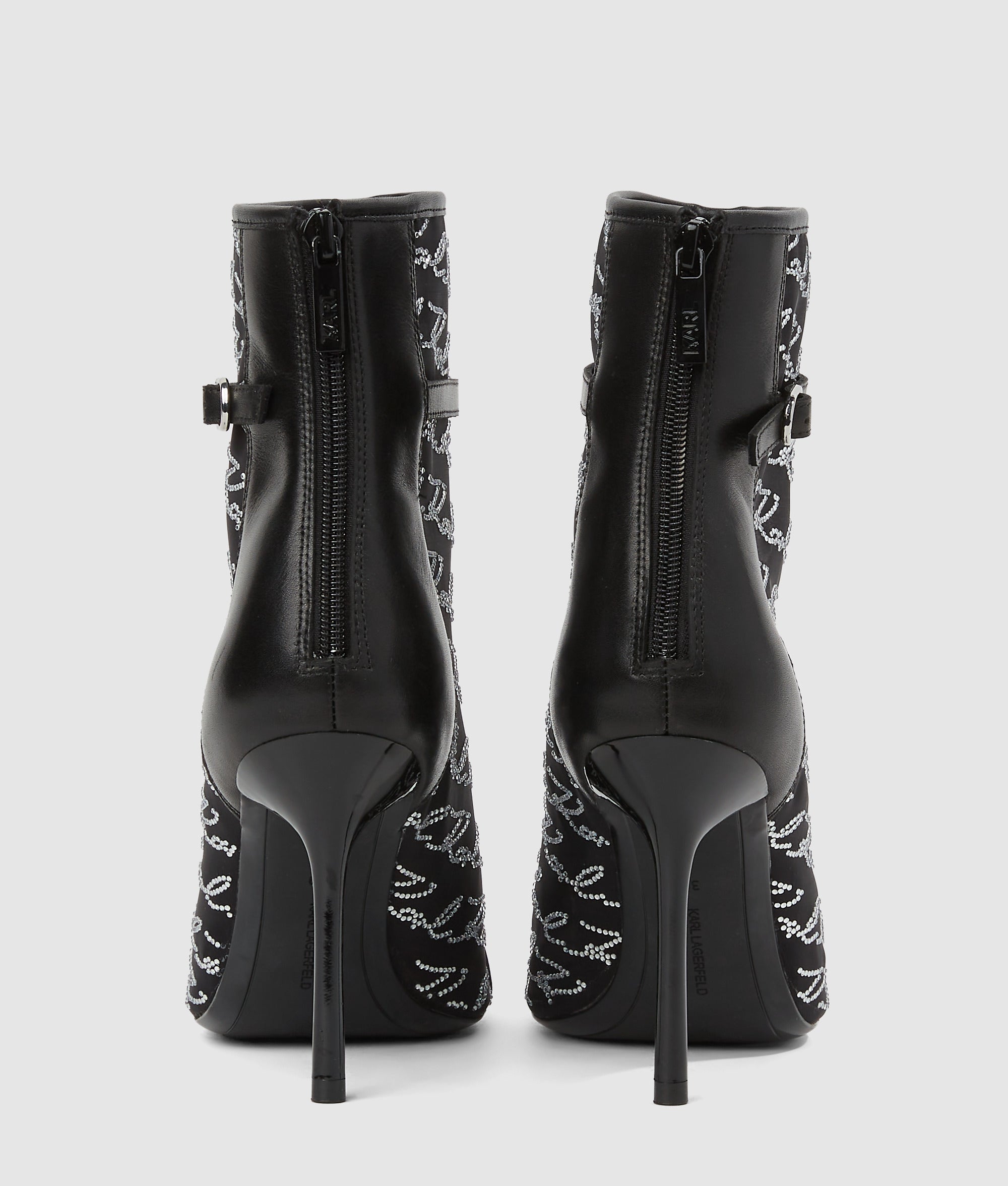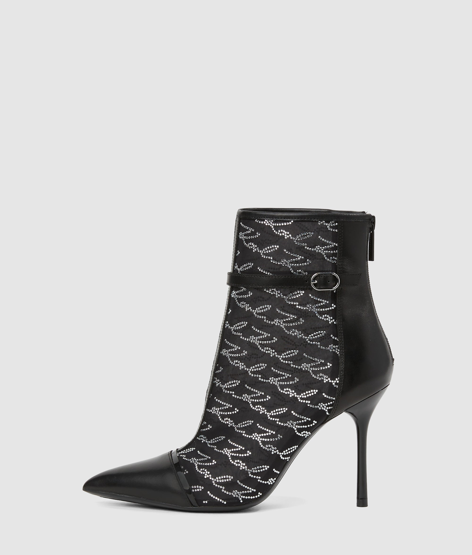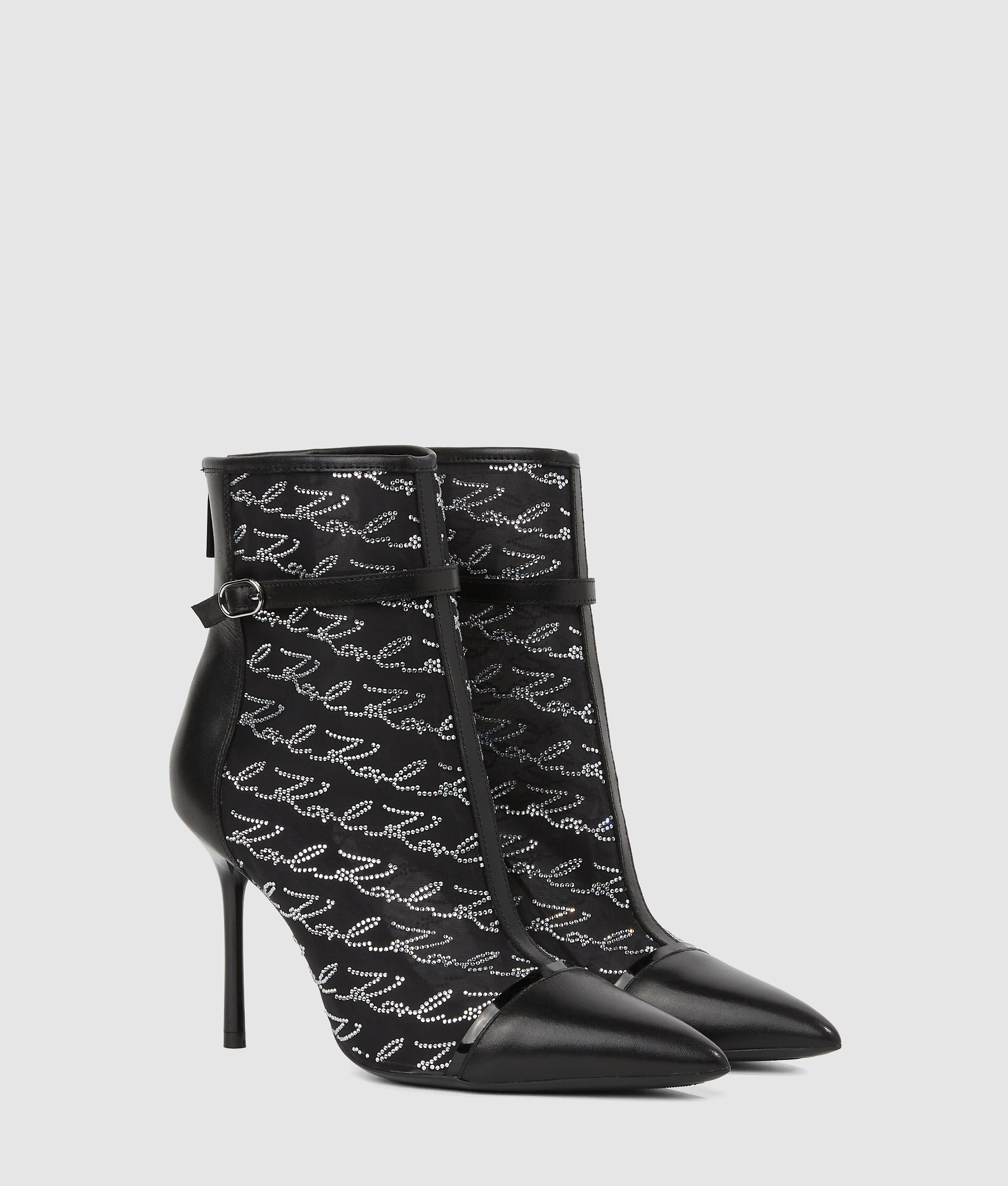 繊細なメッシュ素材を使用し、全体にきらめくラインストーンでKarl Signatureのロゴを施した、スタイリッシュなアンクルブーツ。エレガントなスティレットヒール、ポインテッドトゥ、バックルのディテールが洗練されたテイストをプラス。