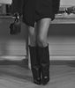 このロングブーツは、エレガントなKARL SIGNATUREとエッジの効いたスタッズのディテールがあしらわれた、大胆な折り返しのディテールが特徴。洗練されたポインテッドトゥとフレアヒールで、堂々とした見た目が完成。