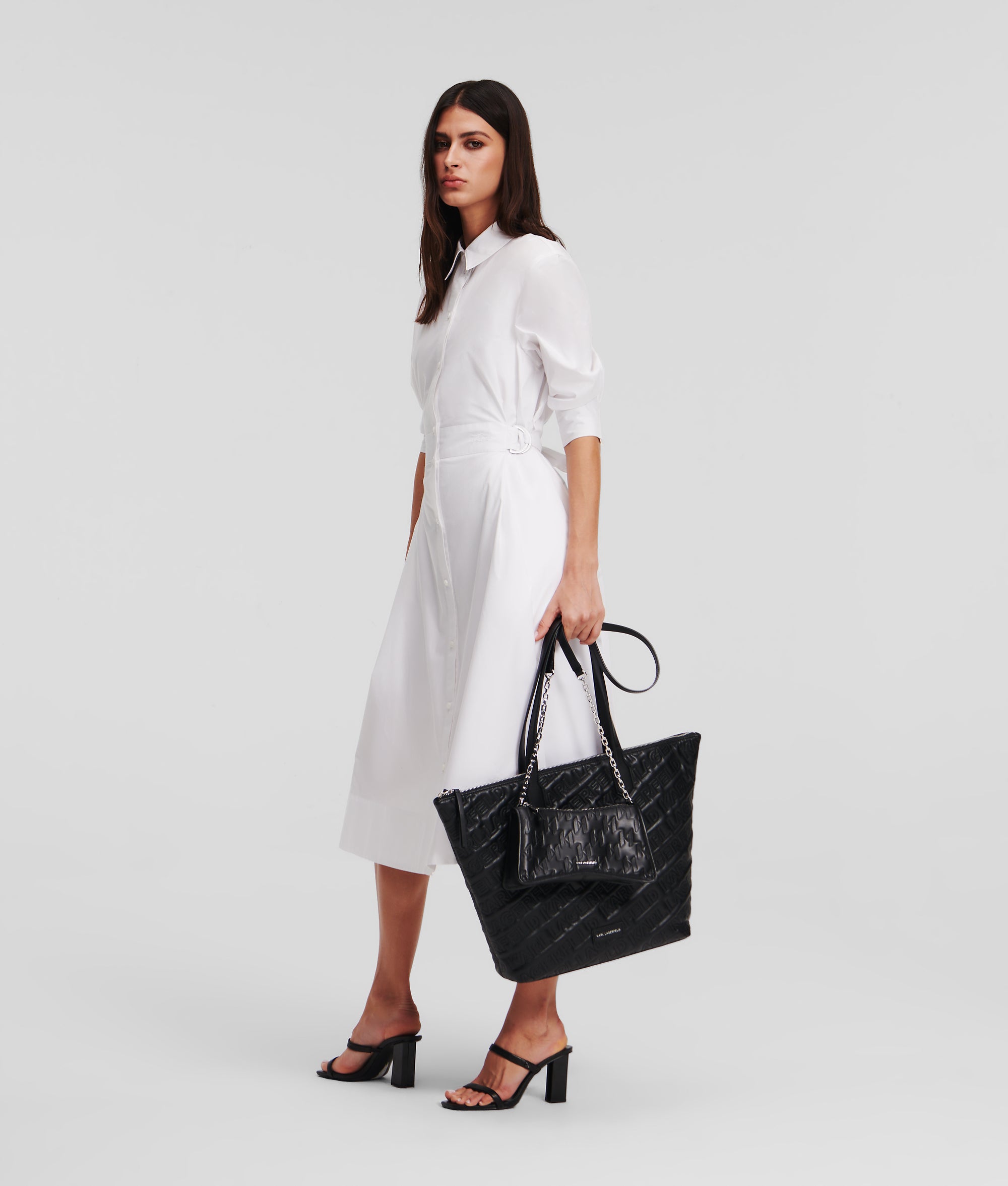 Deze chique midi-jurk van luchtig, biologisch katoenen poplin in een elegant fit-and-flare model is onmisbaar in de zomer. Parelmoeren knopen met KARL-logo geven de kraag en mouwboorden een exclusieve touch, terwijl glanzende metalen D-ringen de taille accentueren en zorgen voor een moderne maar tijdloze look.