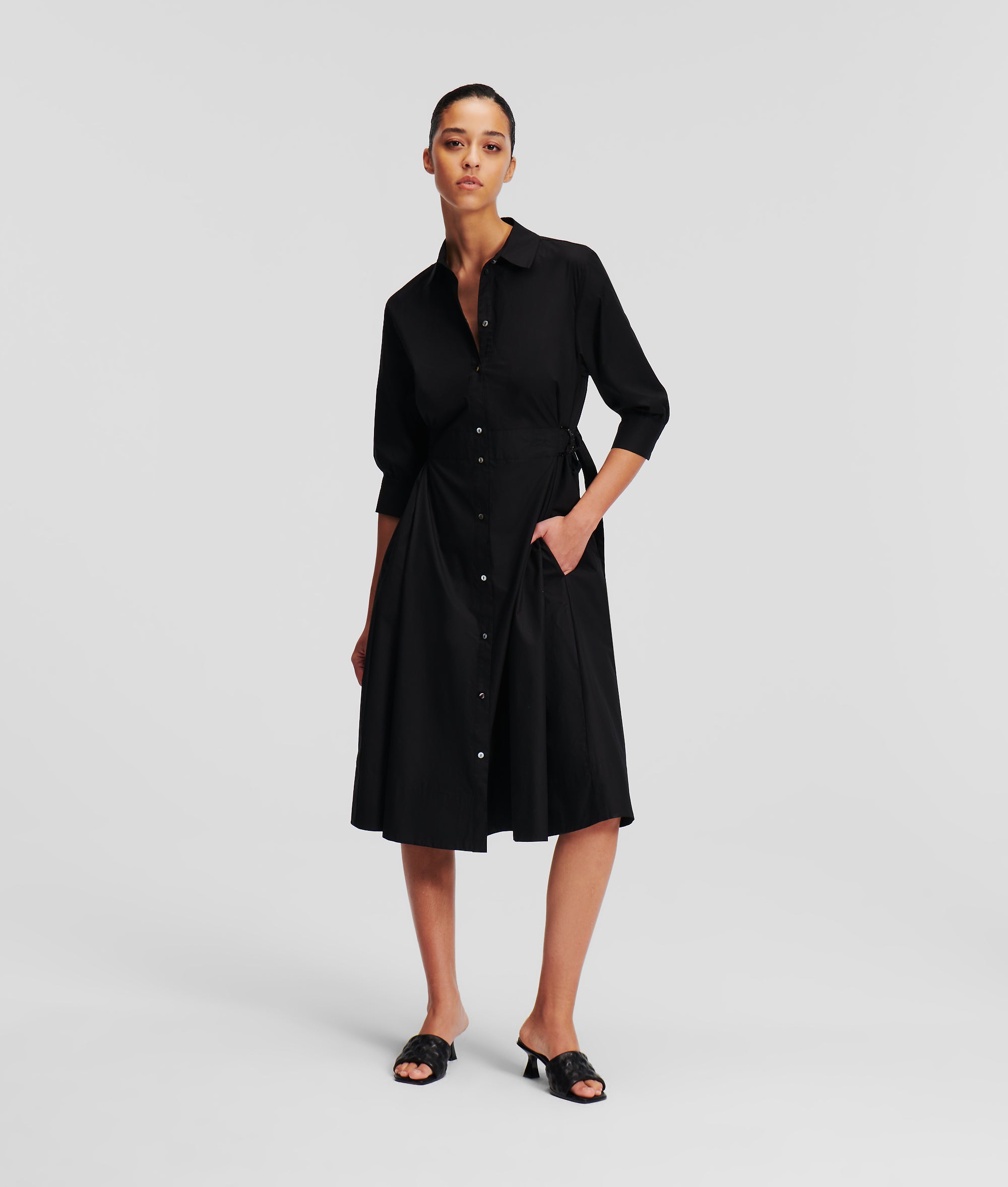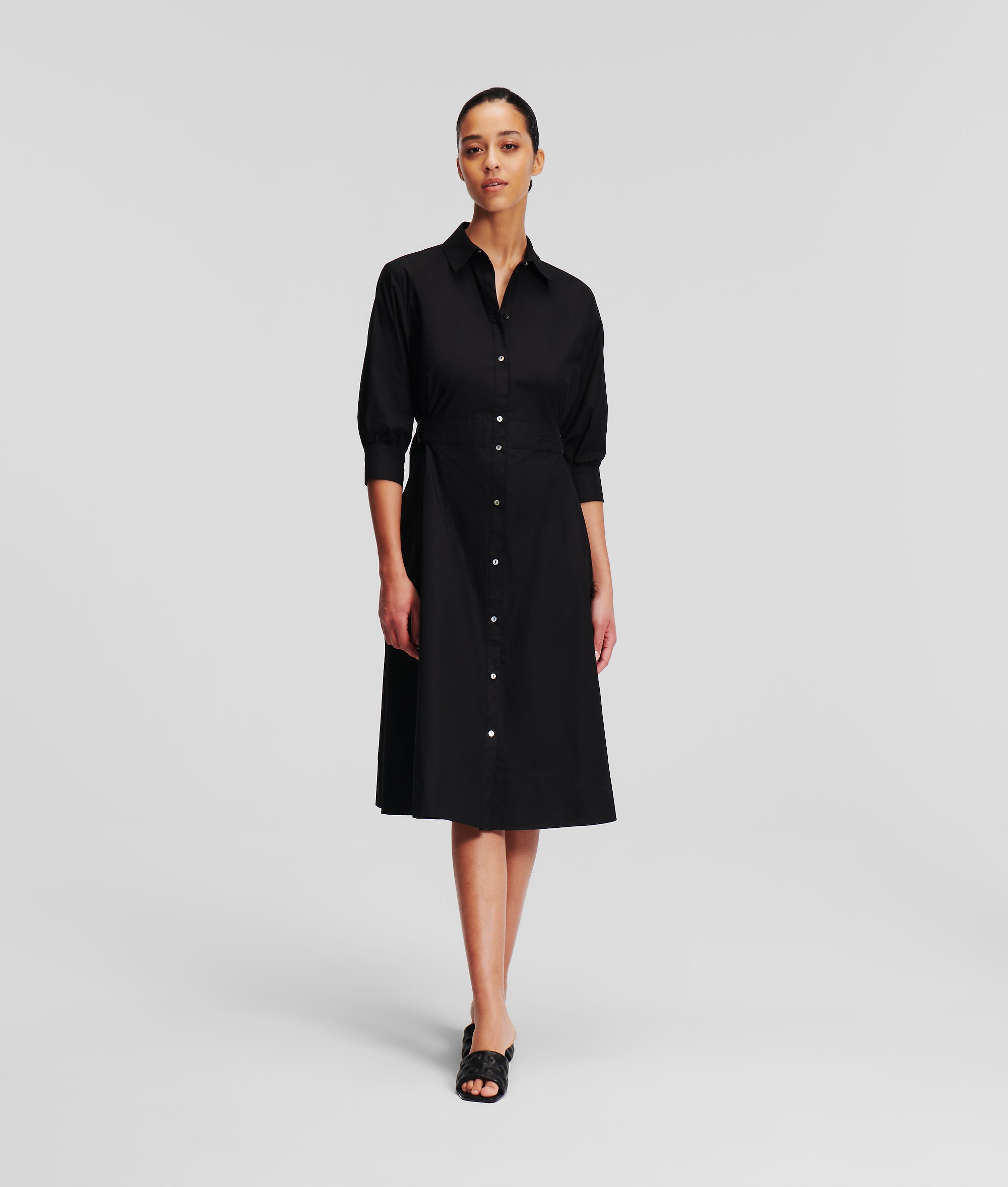 Deze chique midi-jurk van luchtig, biologisch katoenen poplin in een elegant fit-and-flare model is onmisbaar in de zomer. Parelmoeren knopen met KARL-logo geven de kraag en mouwboorden een exclusieve touch, terwijl glanzende metalen D-ringen de taille accentueren en zorgen voor een moderne maar tijdloze look.