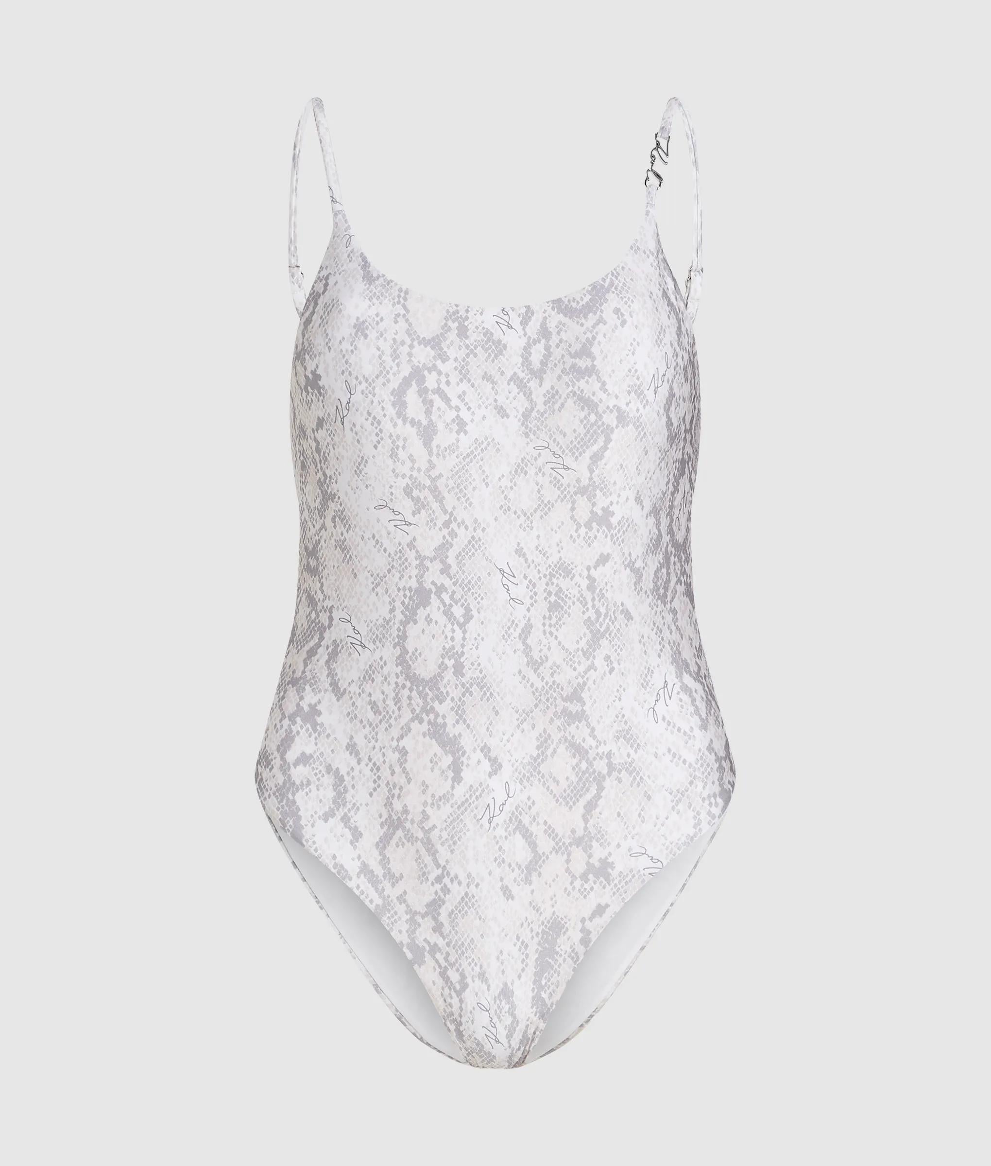 Duik de zomer in met dit klassieke badpak met een flatterende ronde hals en rug, aangevuld met verstelbare schouderbandjes voor de perfecte pasvorm. Het ontwerp met hoge benen biedt een brutale dekking en is versierd met een KARL Signature-bedel voor een elegant accent.