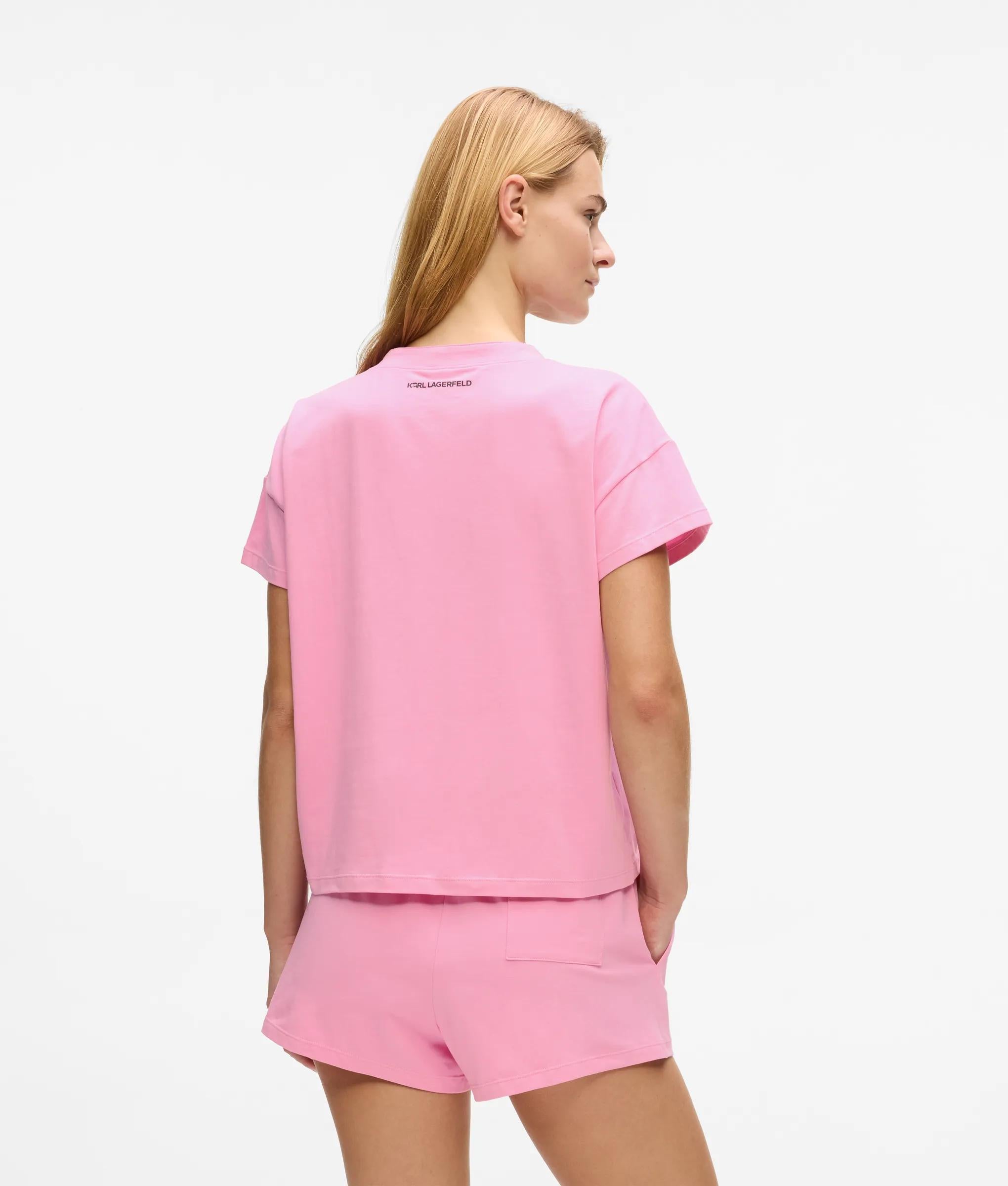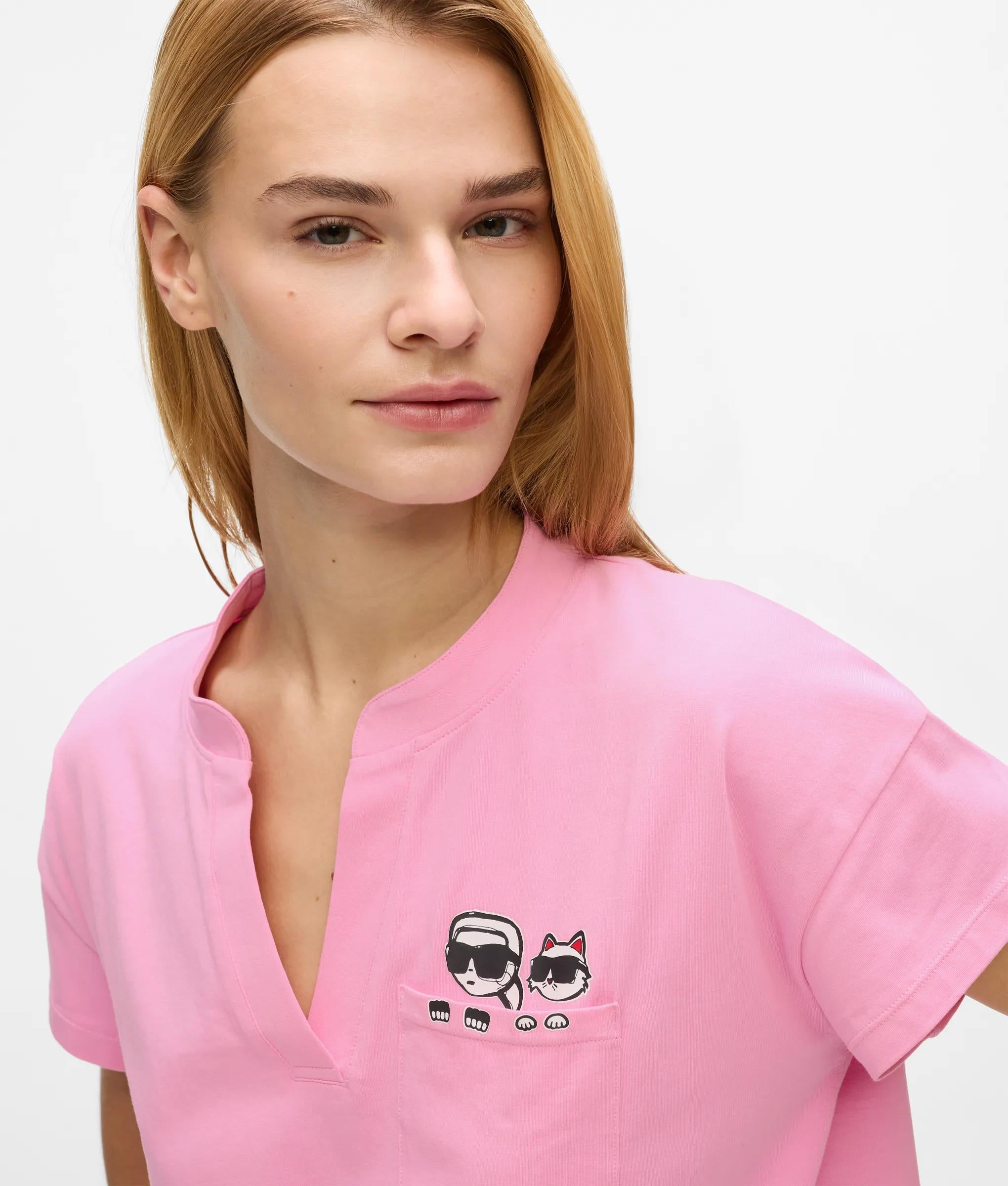 De strepen kabbelen zachtjes over deze korte pyjamaset met een ontspannen T-shirt met V-hals en een korte broek met elastische taille en zakken. Het Ikon kunstwerk voegt een speelse, onverwachte toets toe.