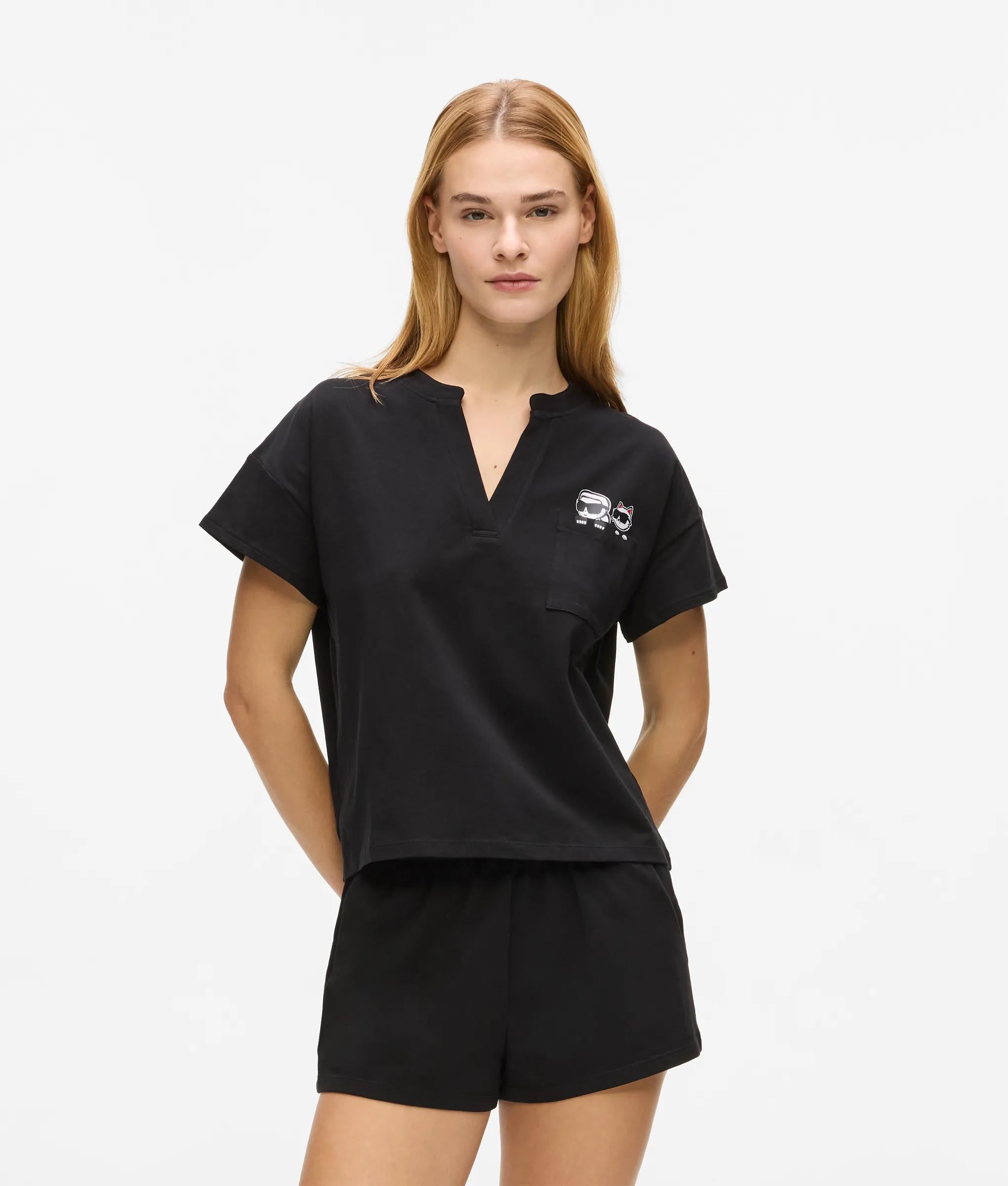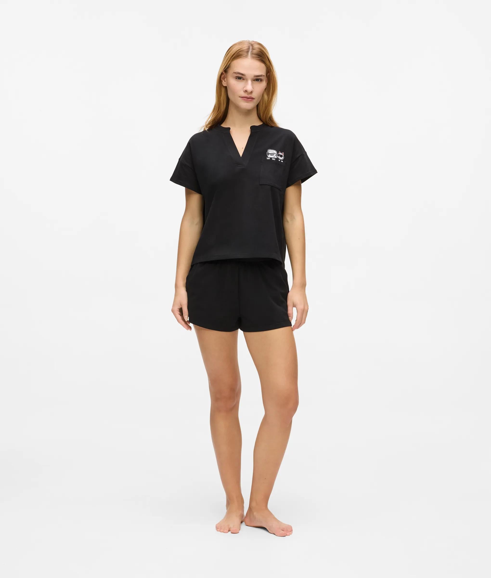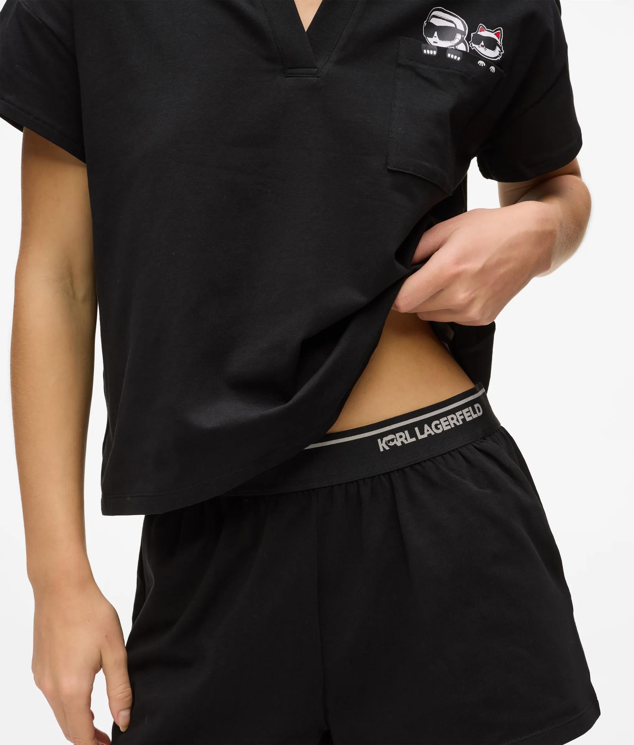 De strepen kabbelen zachtjes over deze korte pyjamaset met een ontspannen T-shirt met V-hals en een korte broek met elastische taille en zakken. Het Ikon kunstwerk voegt een speelse, onverwachte toets toe.