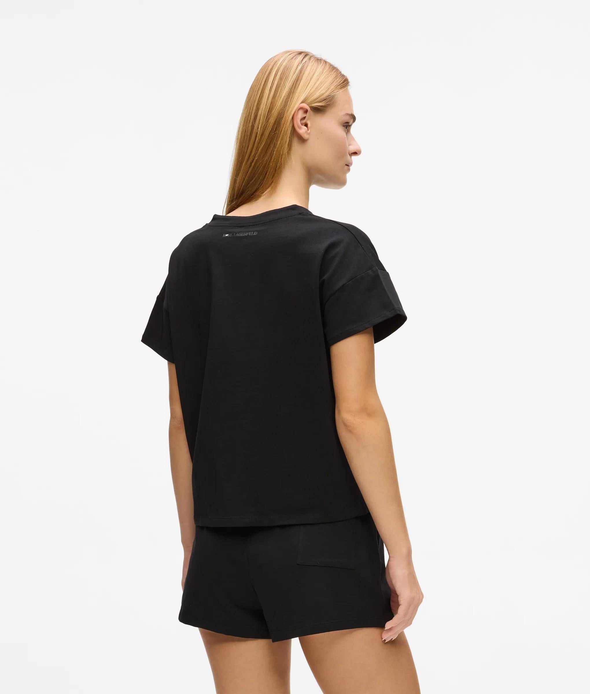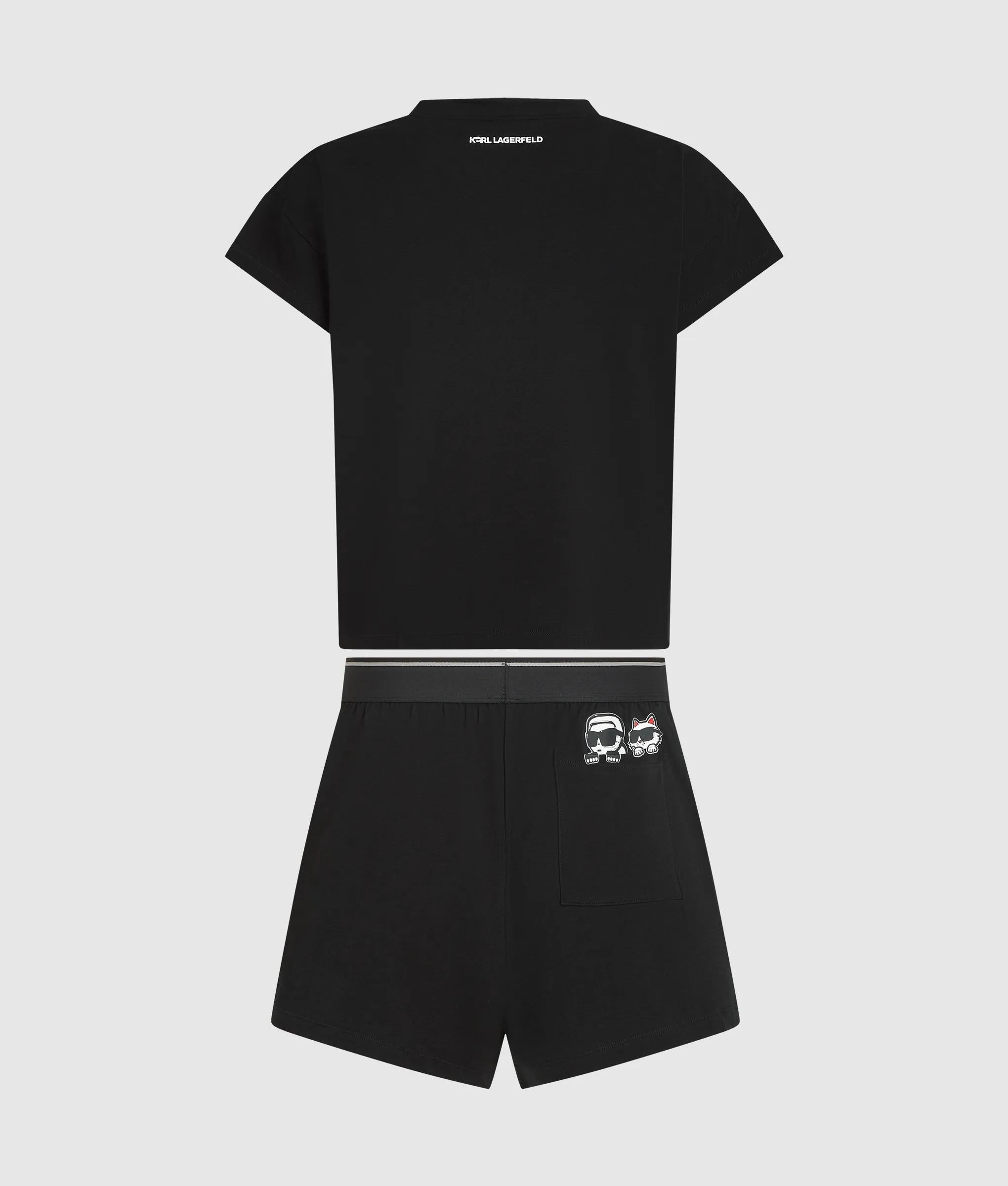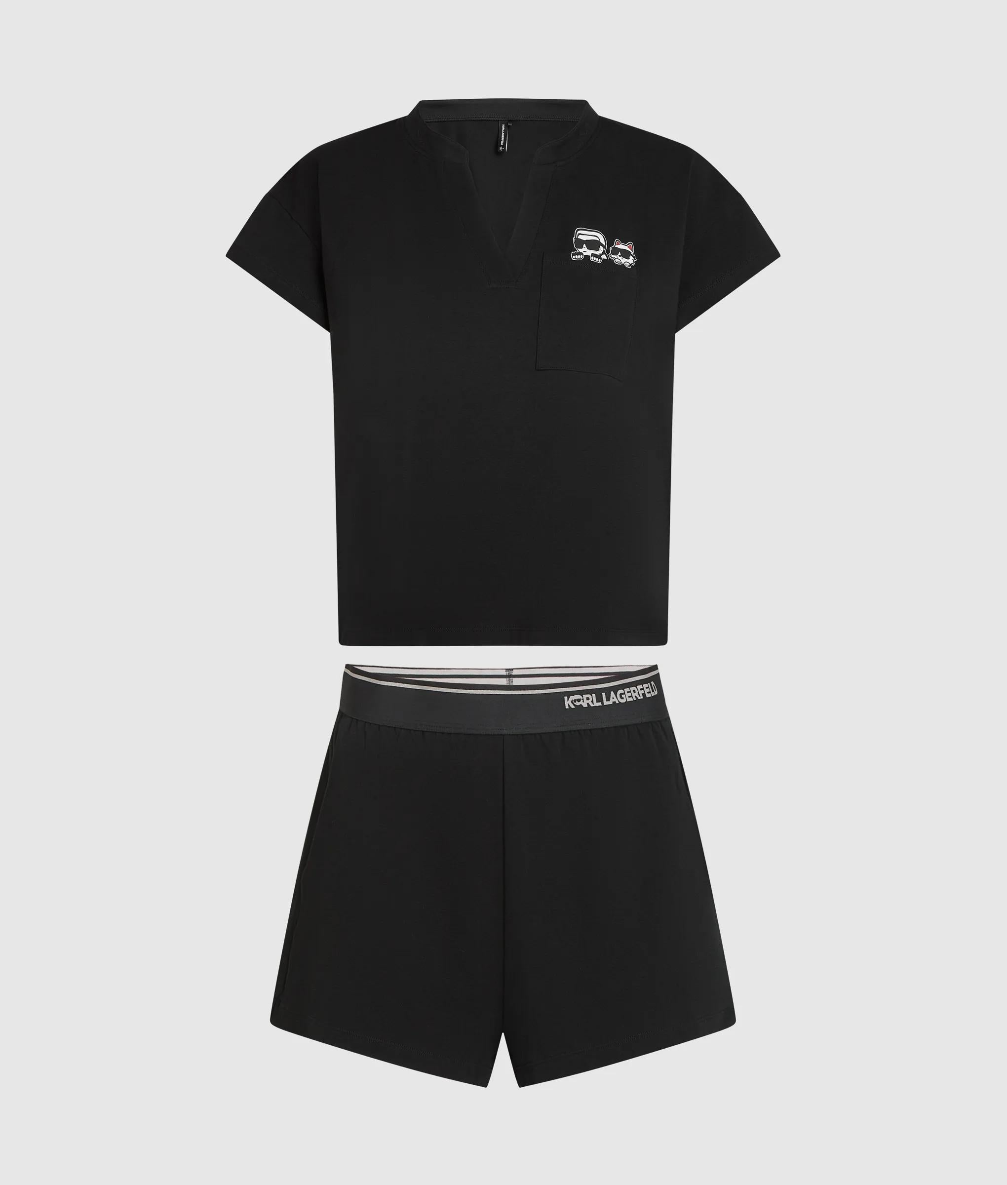 De strepen kabbelen zachtjes over deze korte pyjamaset met een ontspannen T-shirt met V-hals en een korte broek met elastische taille en zakken. Het Ikon kunstwerk voegt een speelse, onverwachte toets toe.