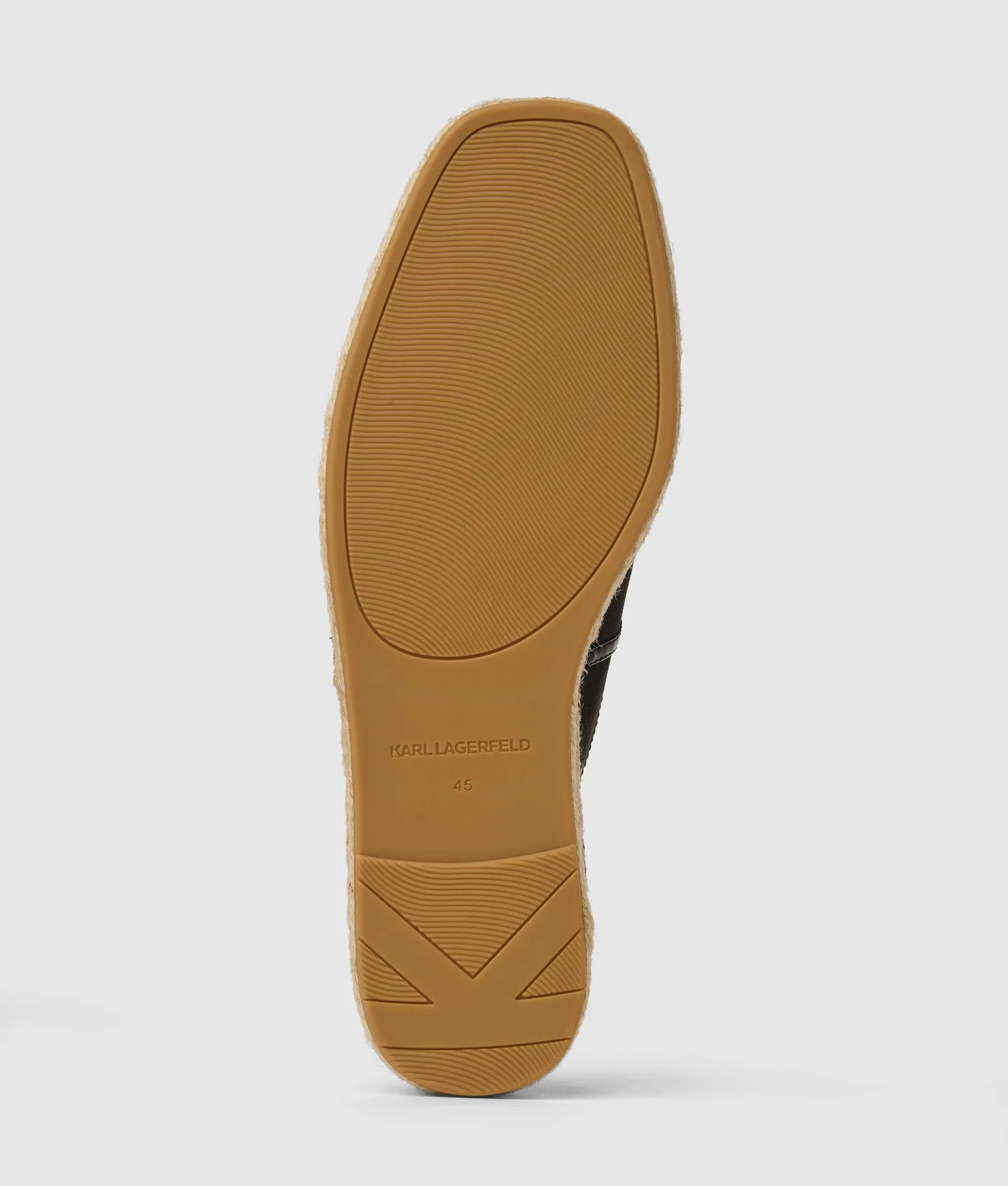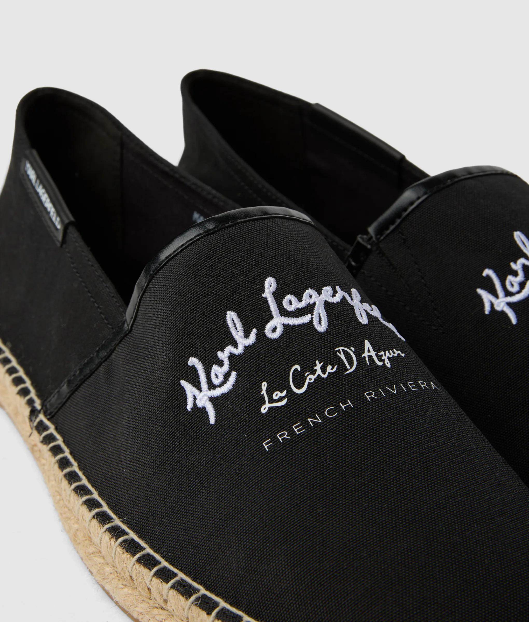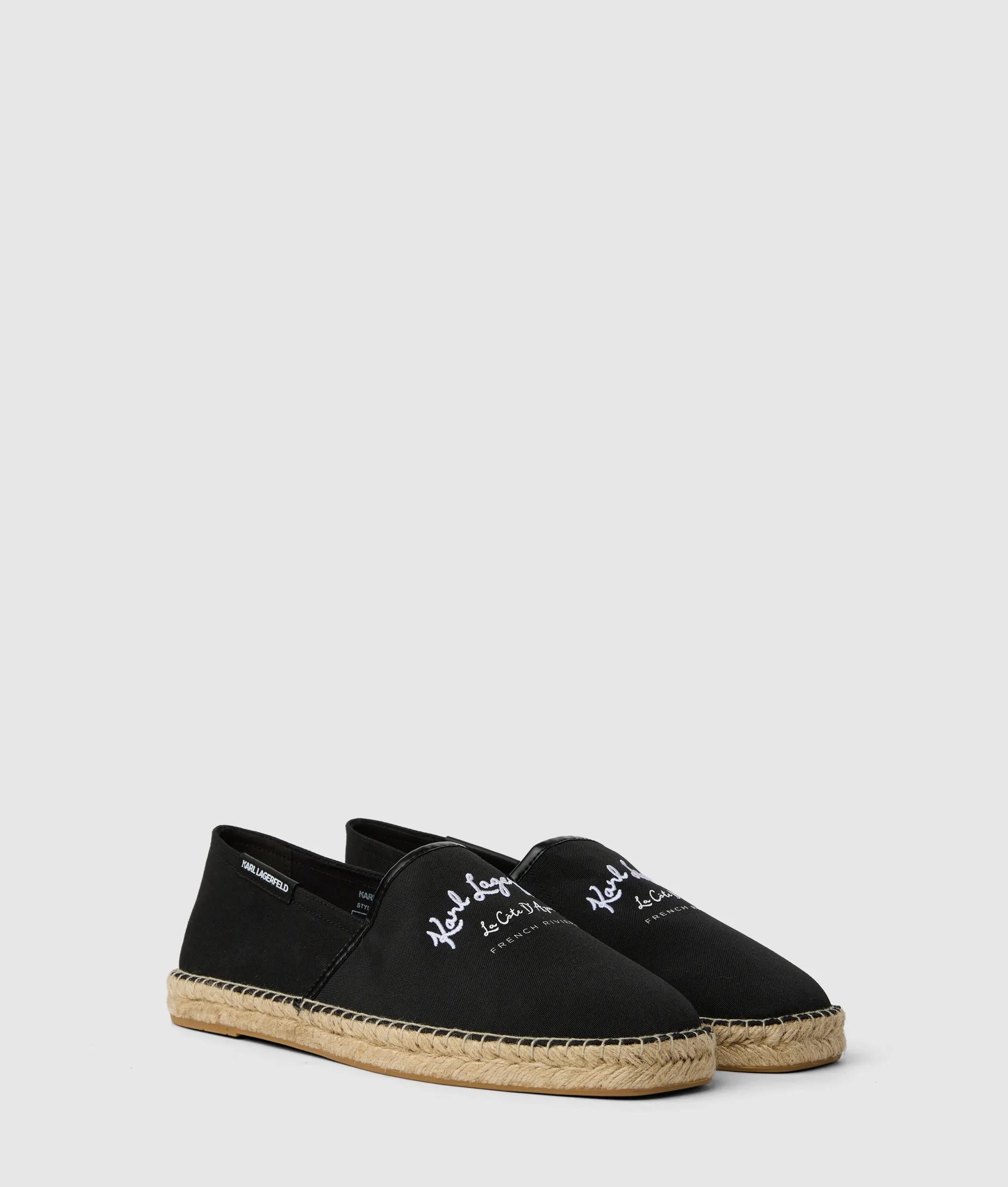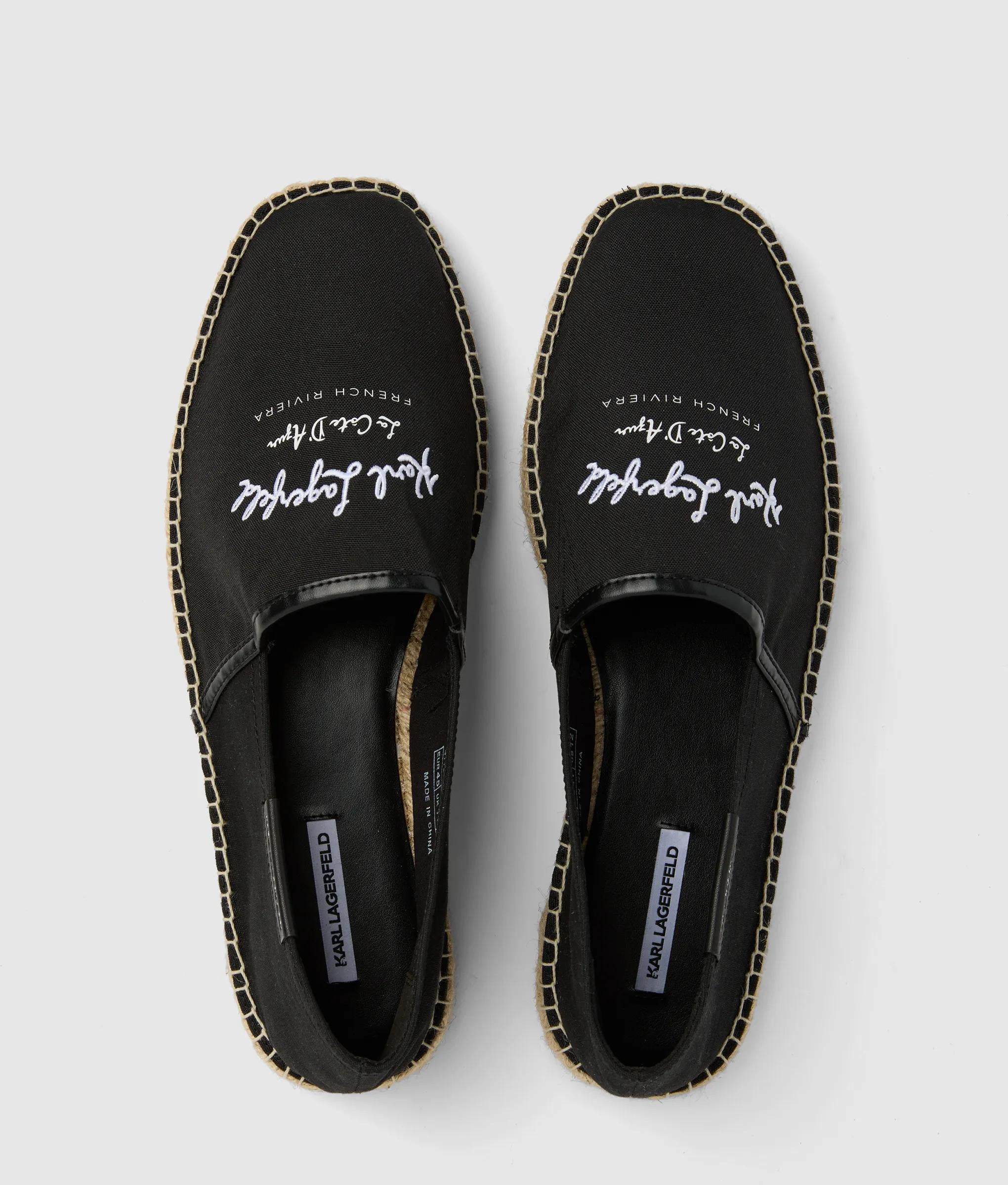 Deze verfijnde platte schoenen definiëren casual elegantie met een slank slip-on silhouet en zomerse geweven details. Ademend canvas is versierd met het Karl Riviera-logo, perfect voor zonovergoten vakanties.