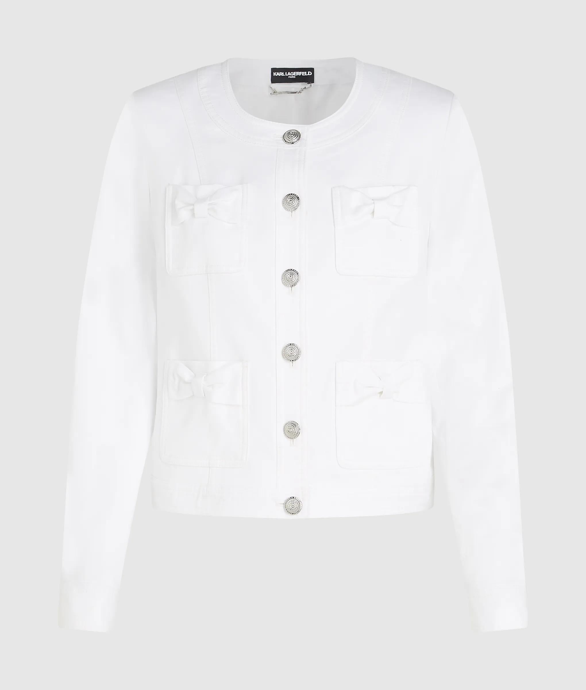 Dit jack van katoenmix is fris en verfijnd en voegt een gestroomlijnde stijl toe aan je zomerse look. Opvallende merkknopen en meerdere patchzakken vormen de blikvangers, terwijl monochrome strikjes het kraagloze silhouet verzachten.