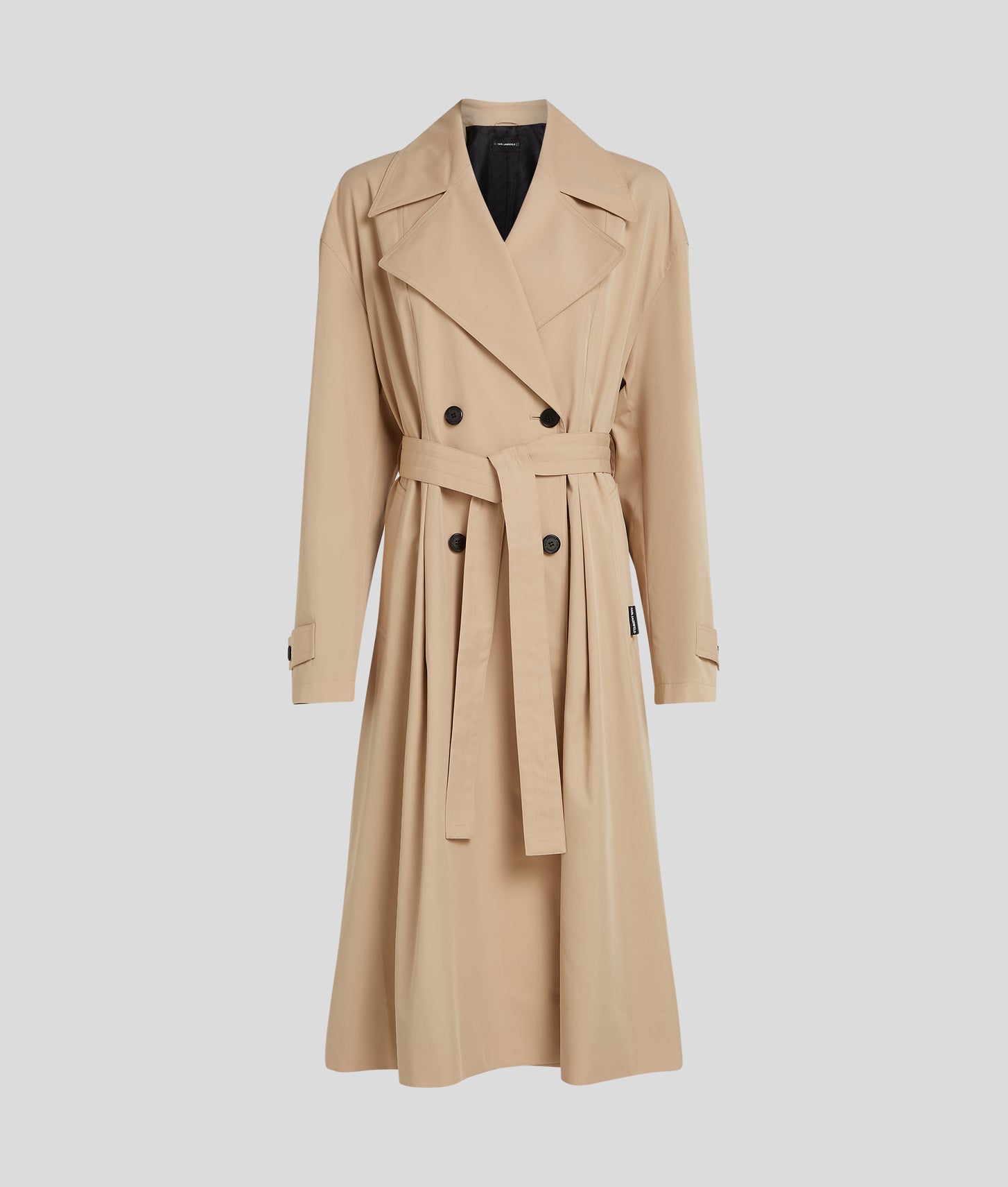 Een tijdloos silhouet met dubbele knopenrij kenmerkt deze trenchcoat, met contrasterende merkknopen en een riem die je zelf kunt afstellen voor een persoonlijke pasvorm.
