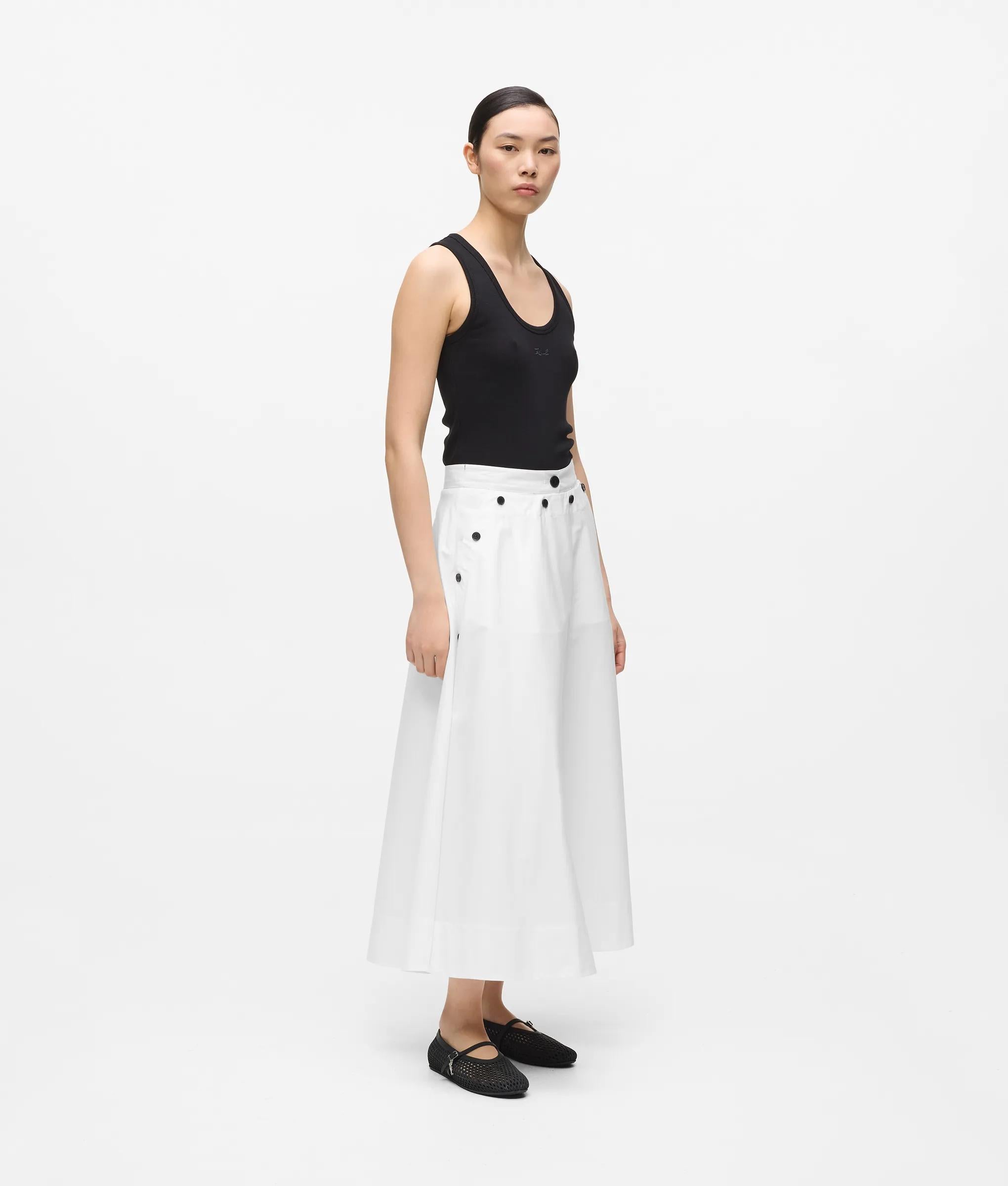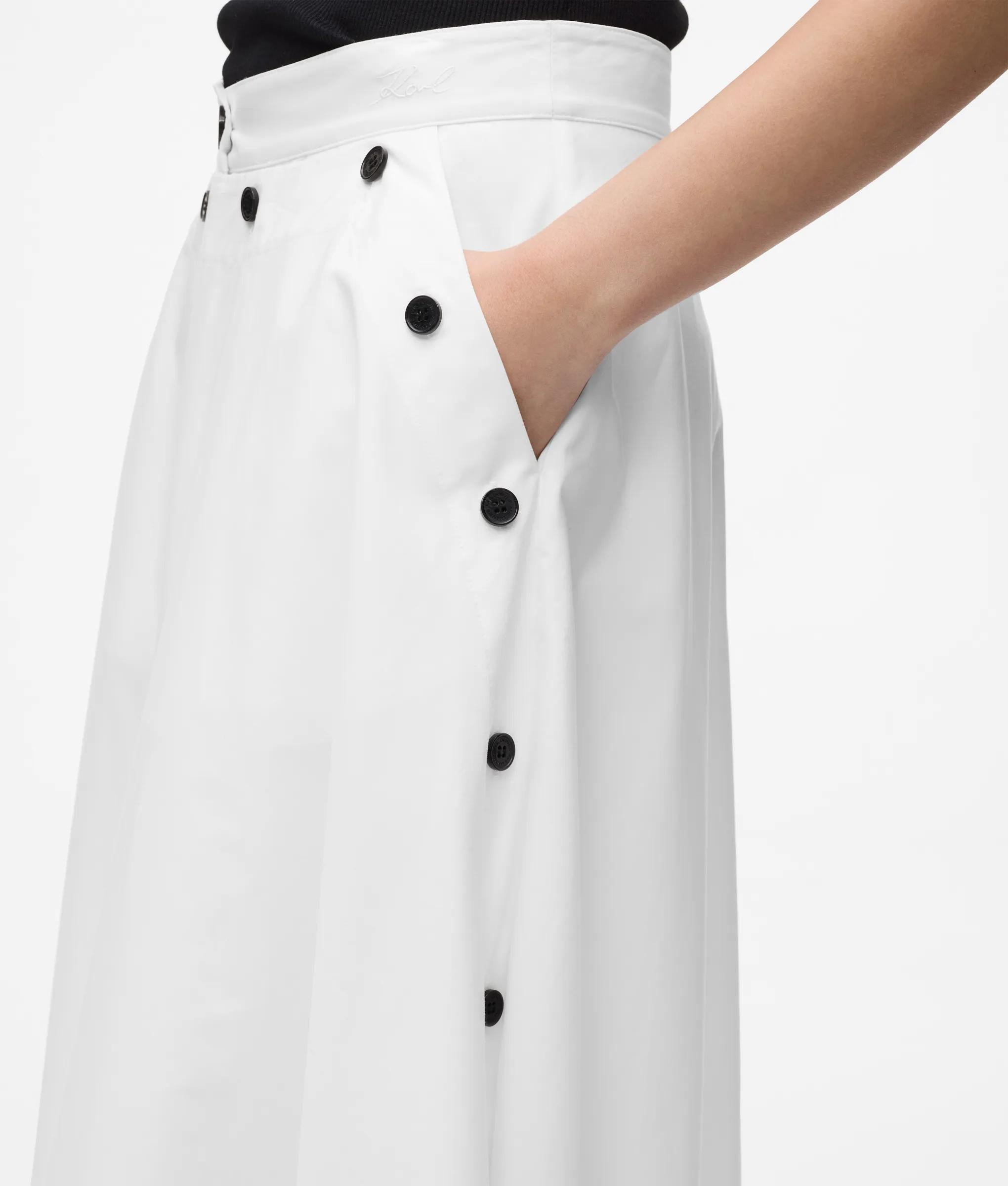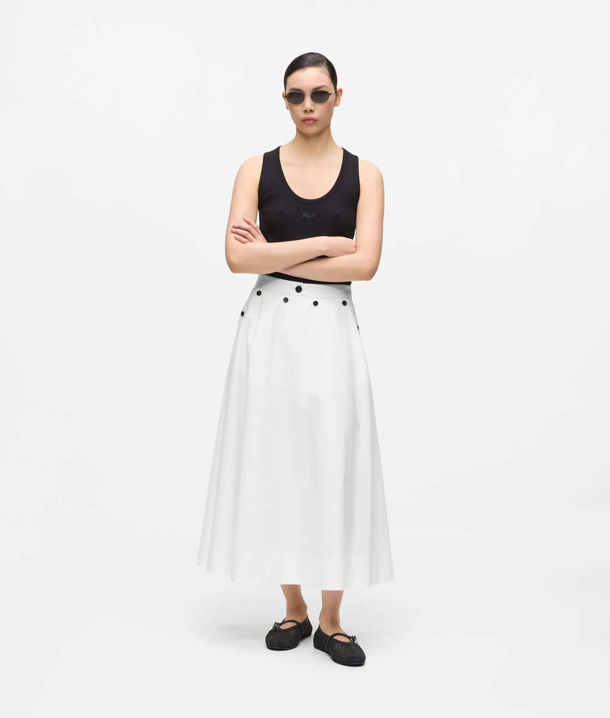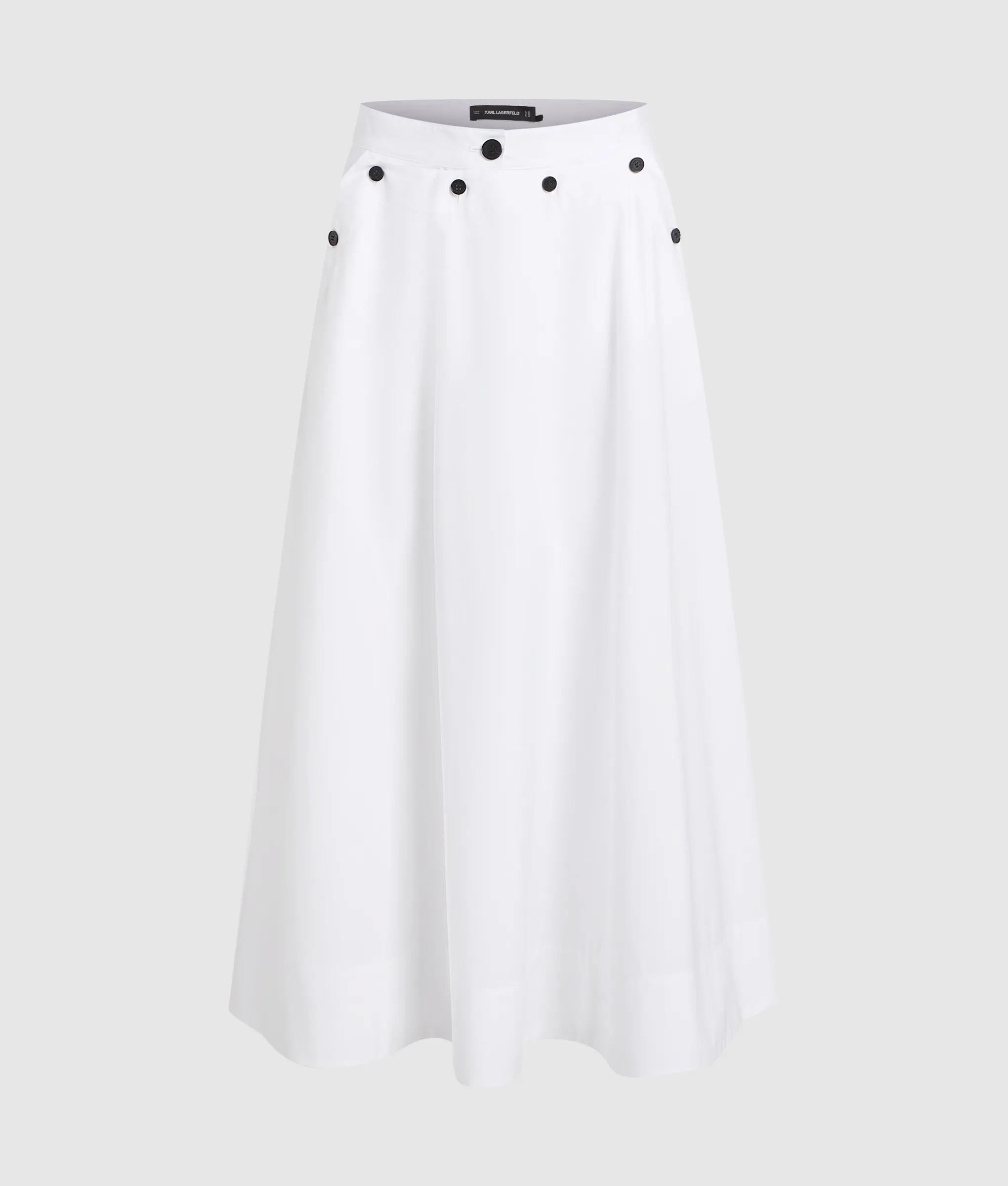 Crisp organic cotton brings structure and movement to this A-line skirt. The voluminous silhouette is topped with contrasting buttons for a statement KARL LAGERFELD finish.