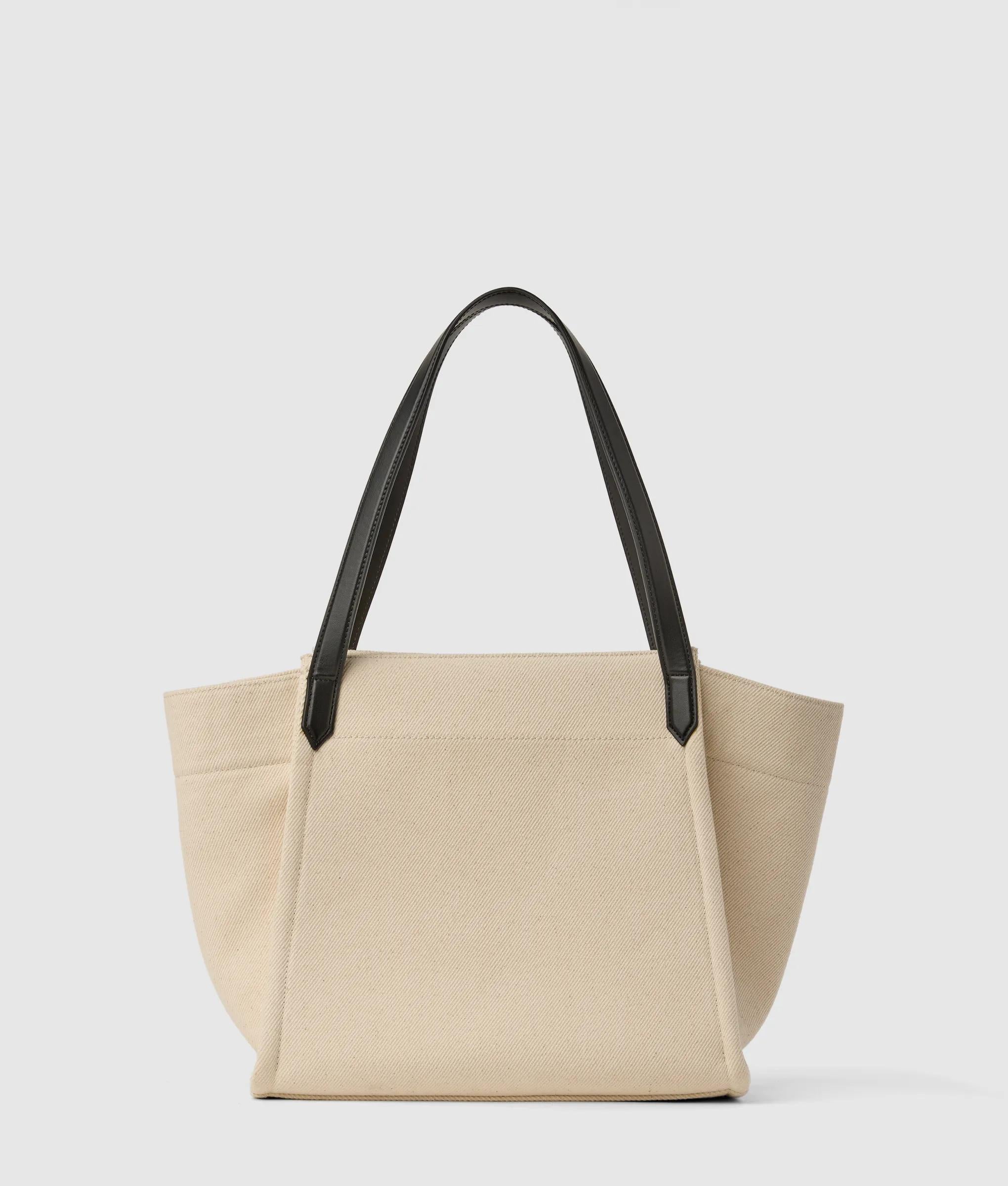 Przestronna, tkana torba na zakupy, miękka i przyjemna w dotyku, o skrzydlatym fasonie. Magnetyczne zapięcie i solidne skórzane uchwyty sprawiają, że jest to szykowny dodatek do codziennego życia w mieście.