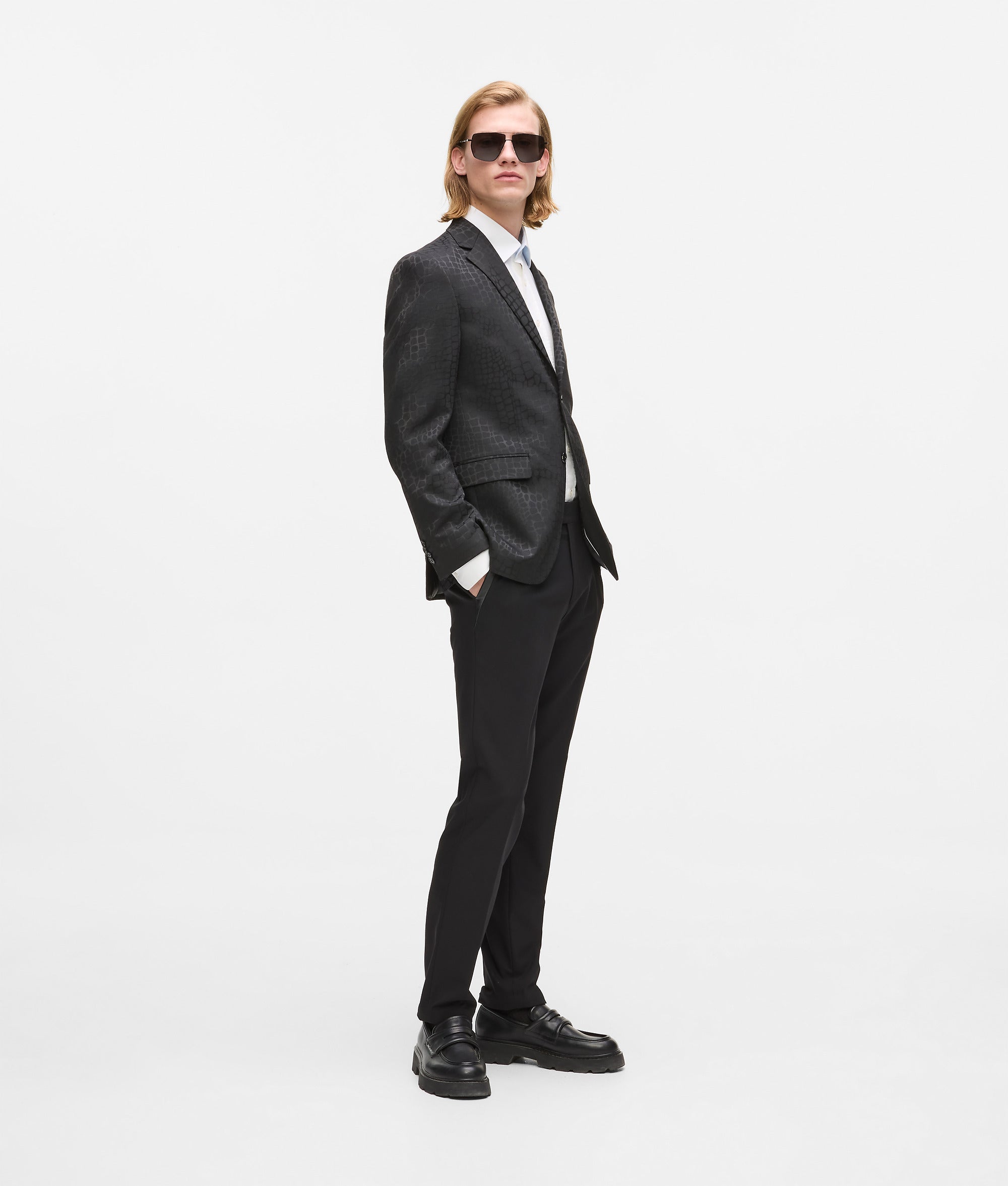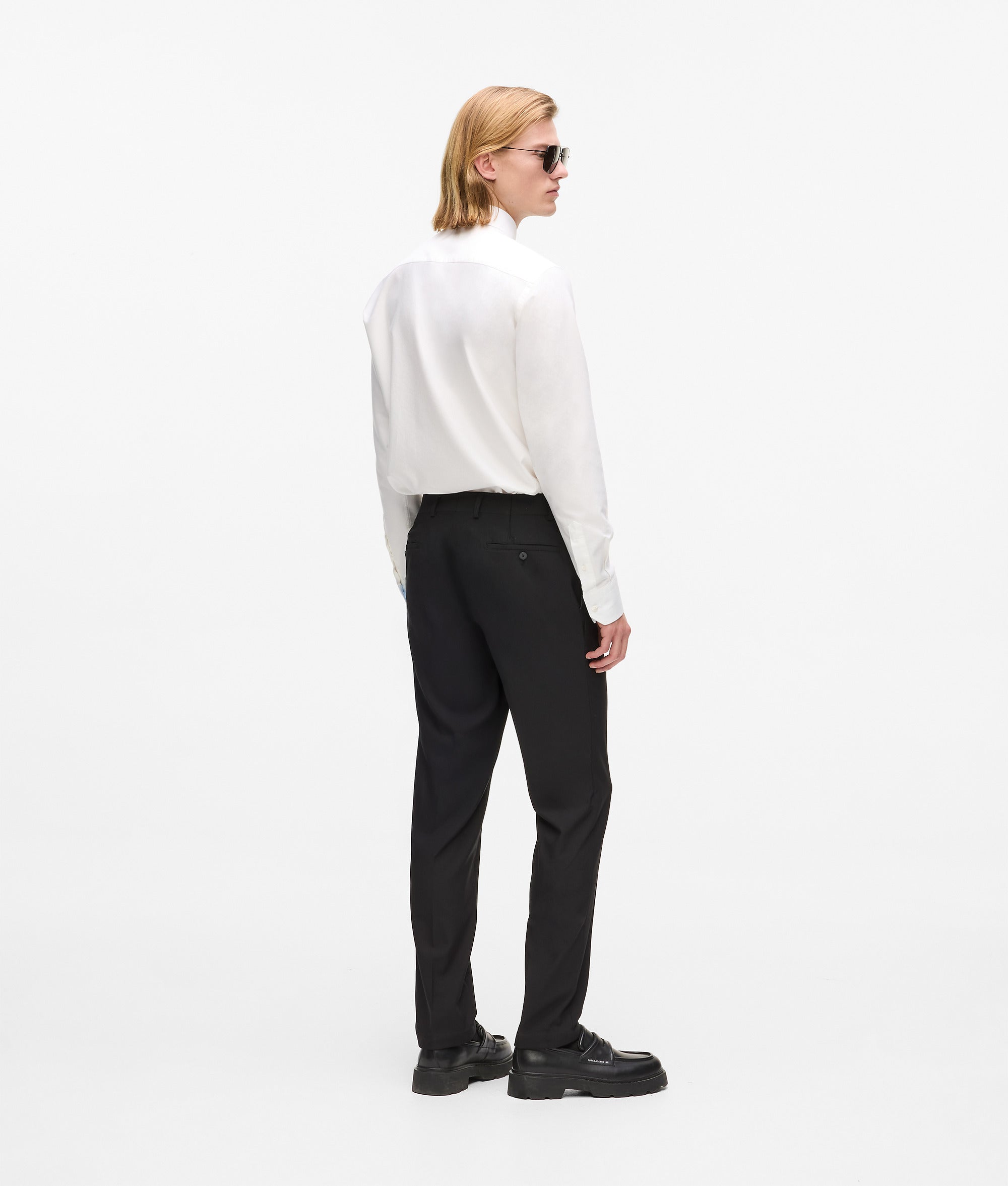Dopasowana sylwetka z detalami ze sztucznej skóry to rockowe podejście do garnituru. Te spodnie o miękkiej strukturze dodają spokojnej pewności siebie każdemu krokowi.