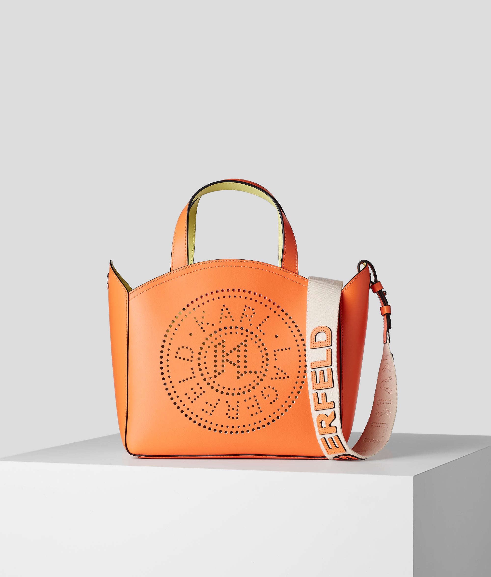 For functional accessorizing with a contemporary edge, this petite tote bag features a modern silhouette embellished with perforated KARL Circle artwork. The casual yet chic accessory is enhanced in practicality by a detachable KARL logo webbing strap.
