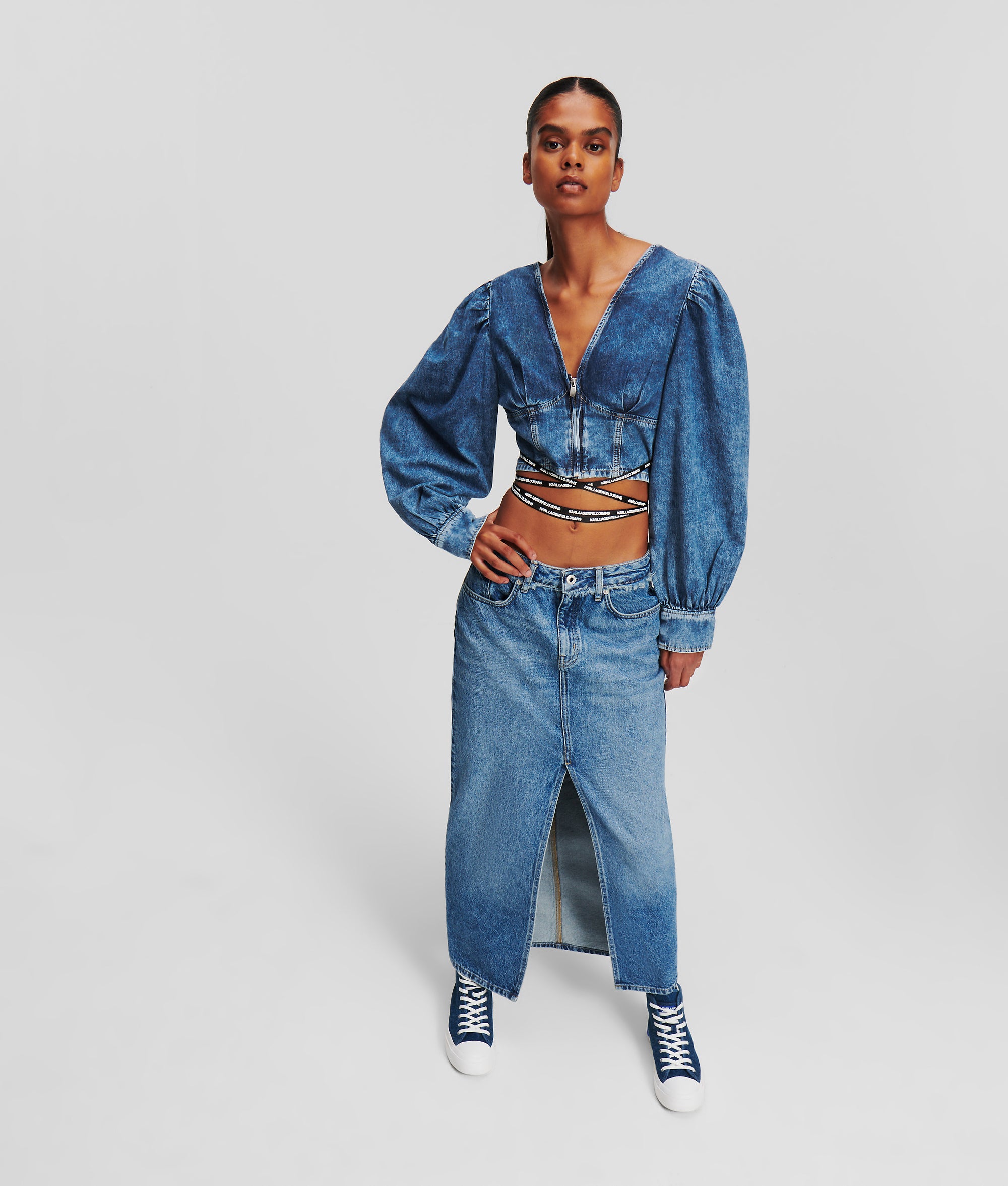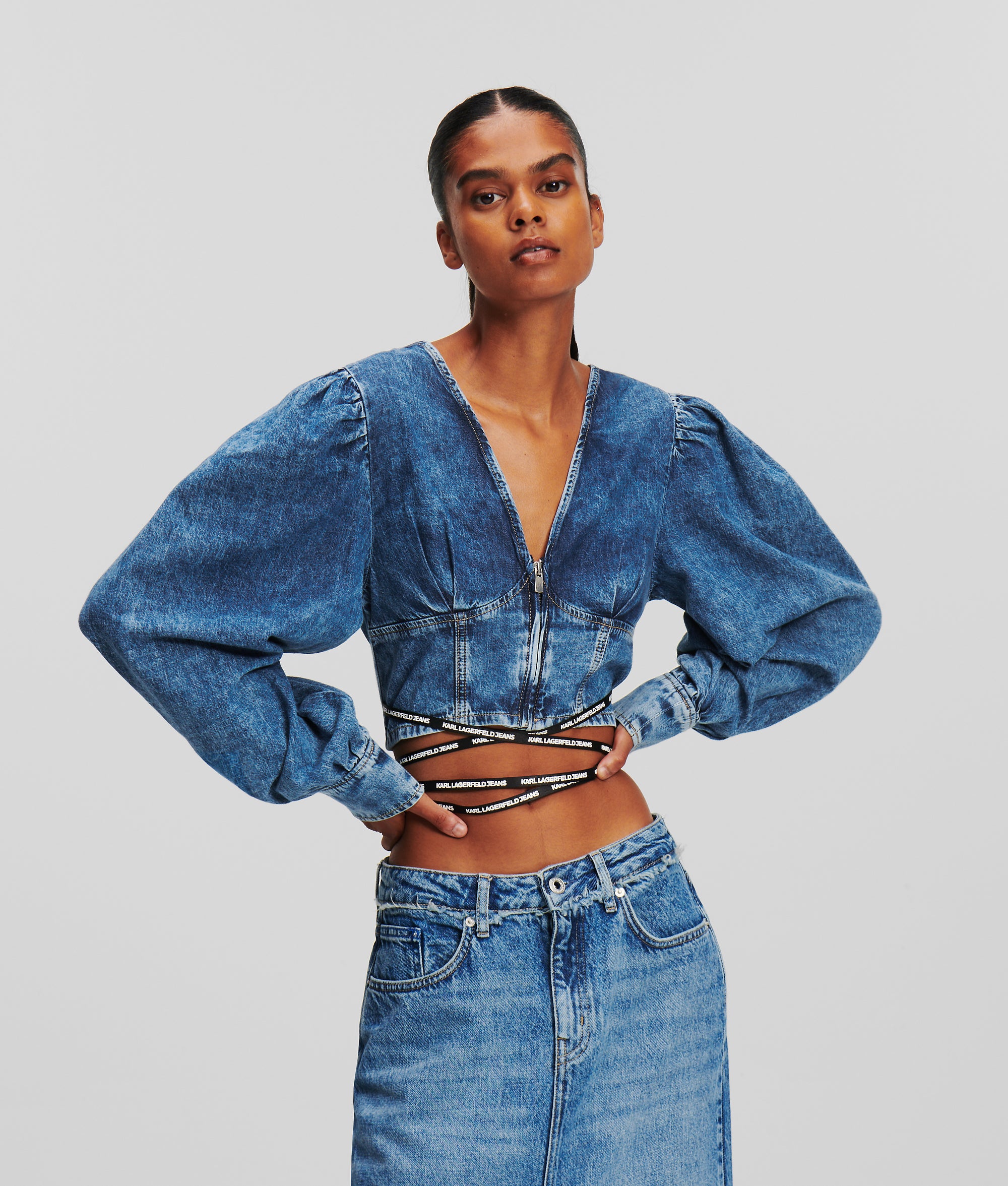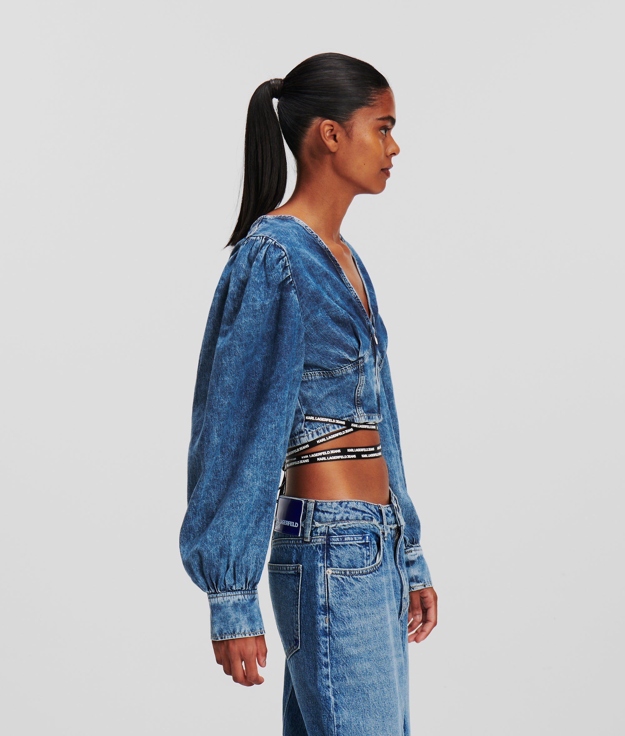 The classic denim shirt is reinvented in a cinched silhouette with crisscrossing waist tie detailing. The cropped style pairs seamlessly with high-waisted skinny jeans for a statement denim-on-denim look.
