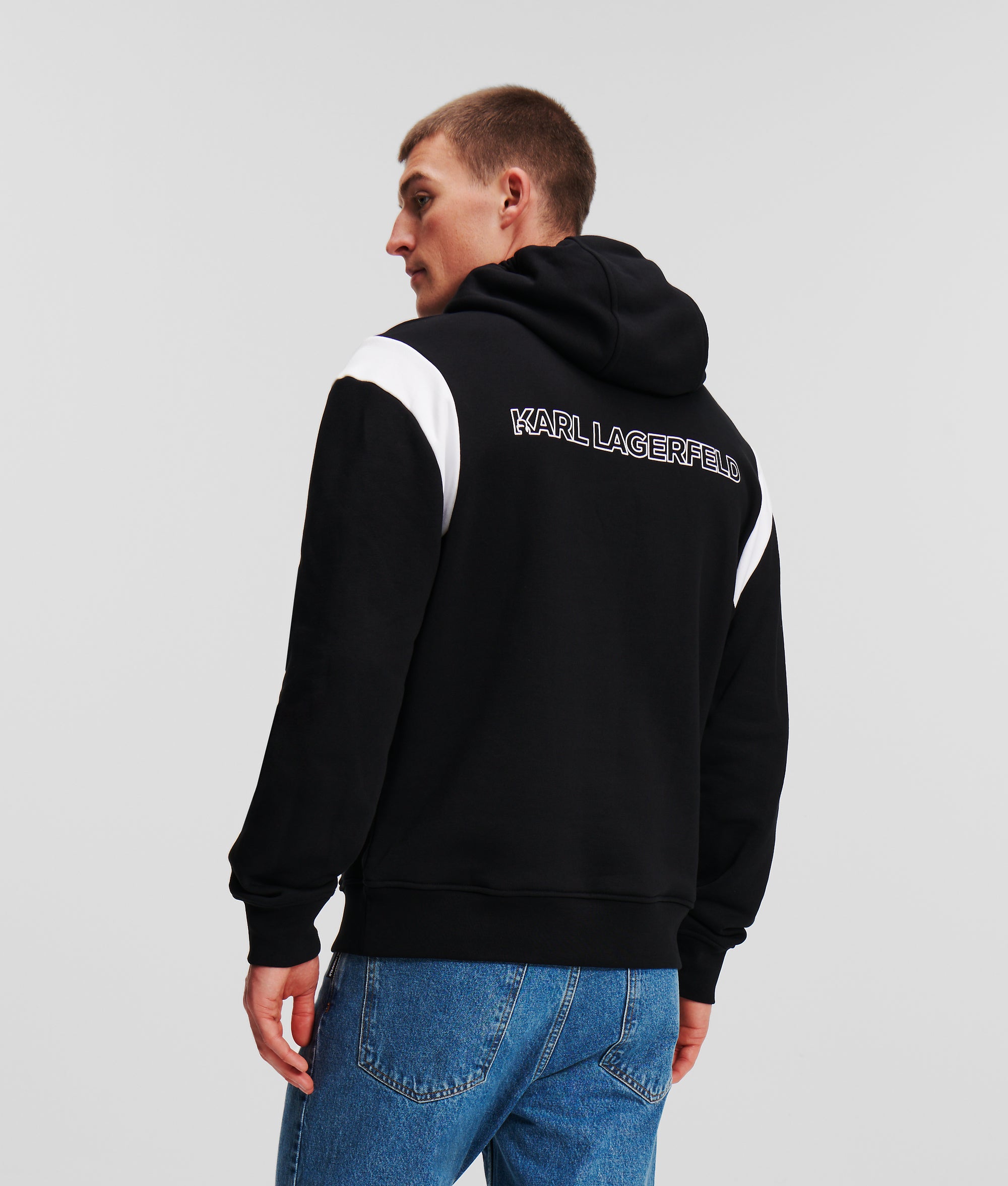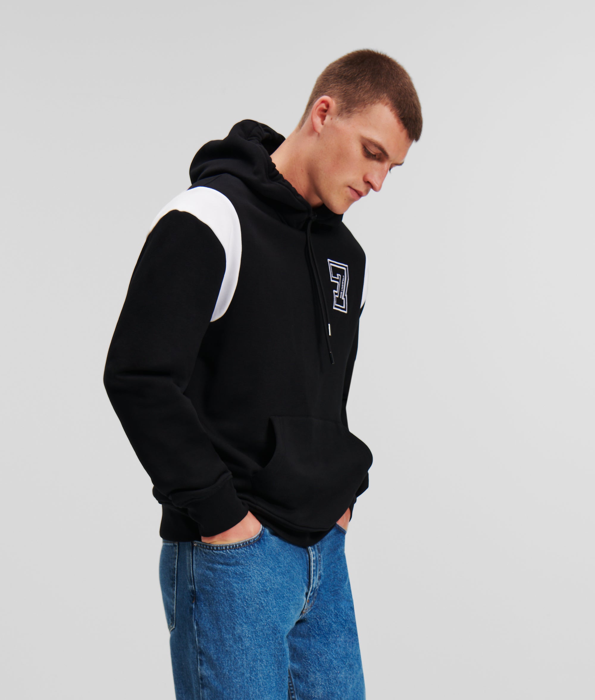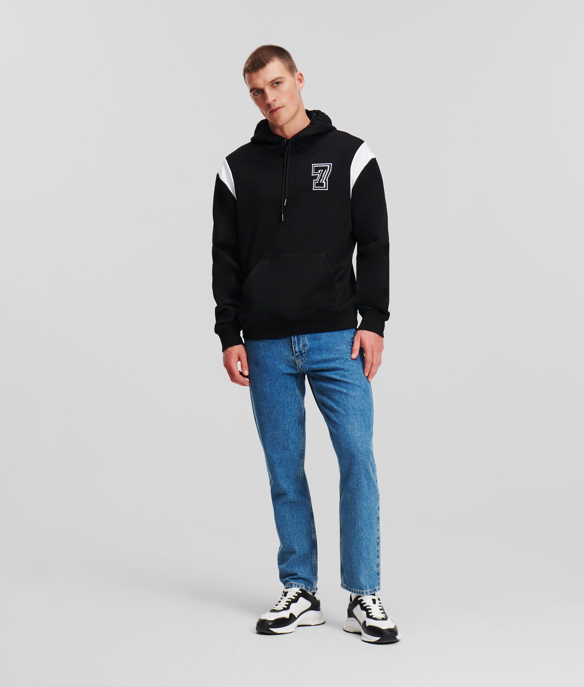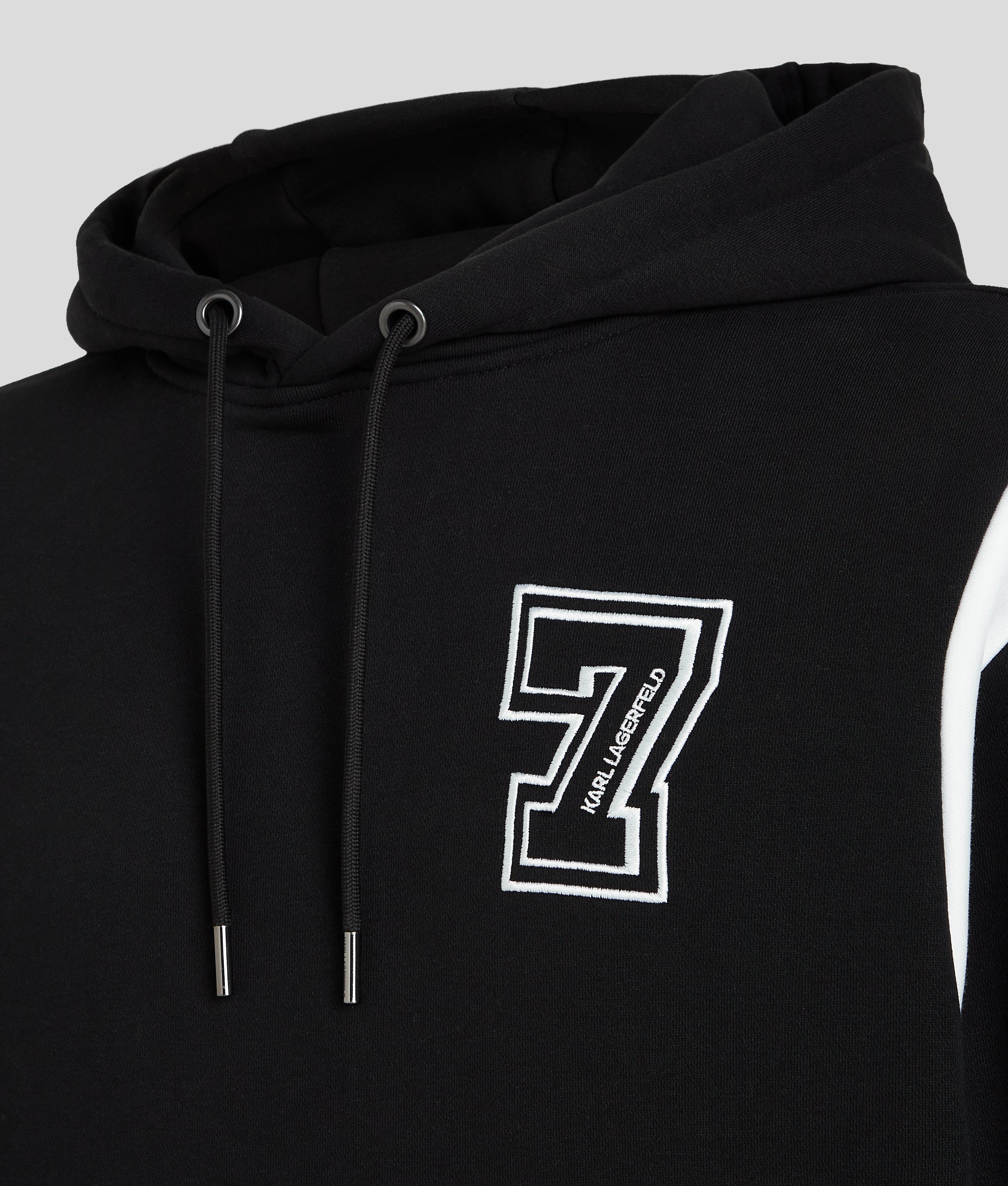 Varsity-inspired detailing transforms this lowkey staple with eye-catching impact. This relaxed-fit hoodie is embroidered with Karl Lagerfeld’s lucky number 7, bold logo artwork across the back and contrasting shoulder inserts.