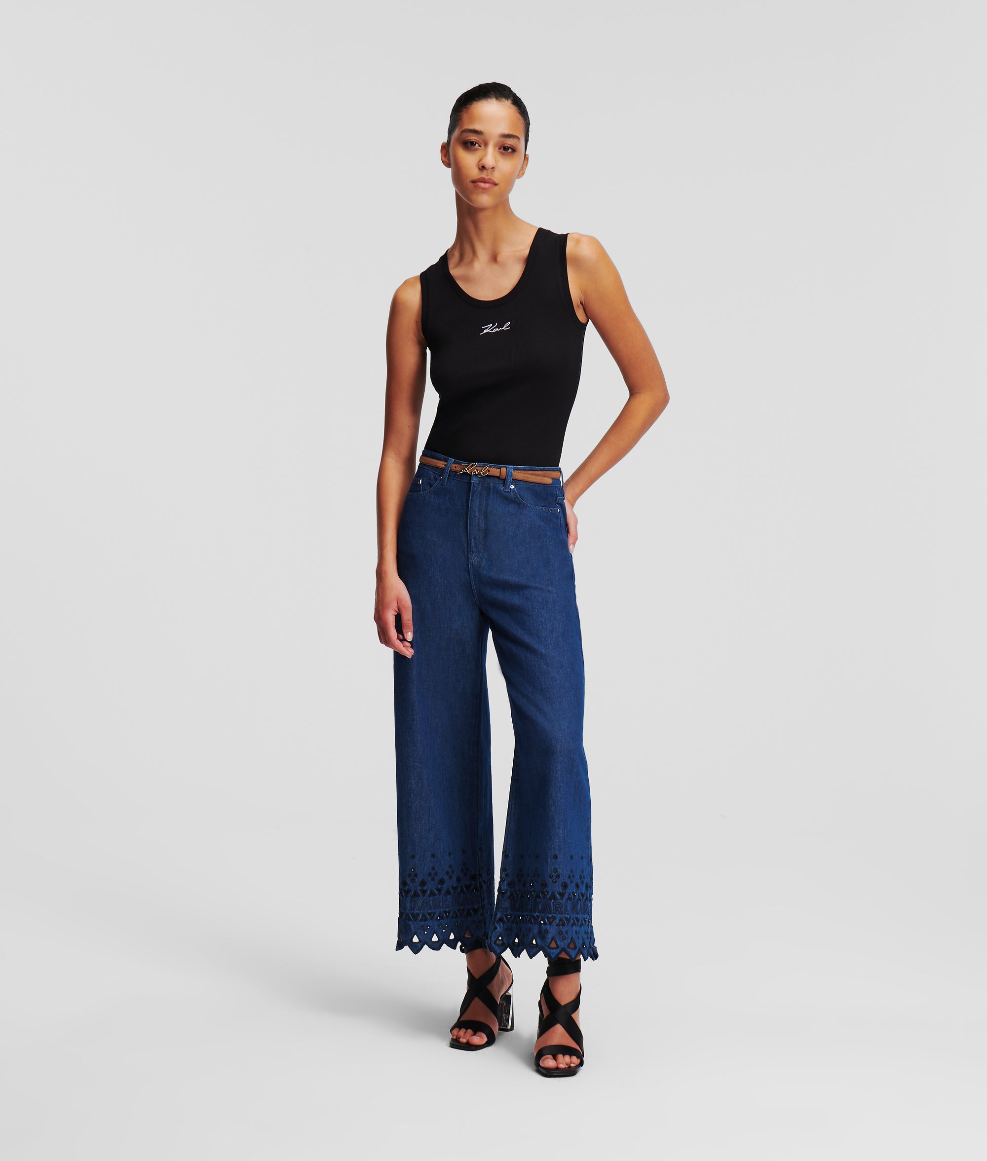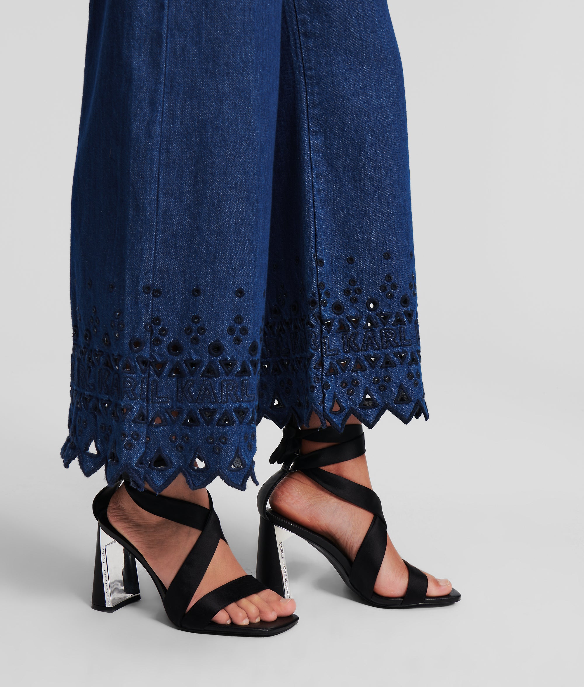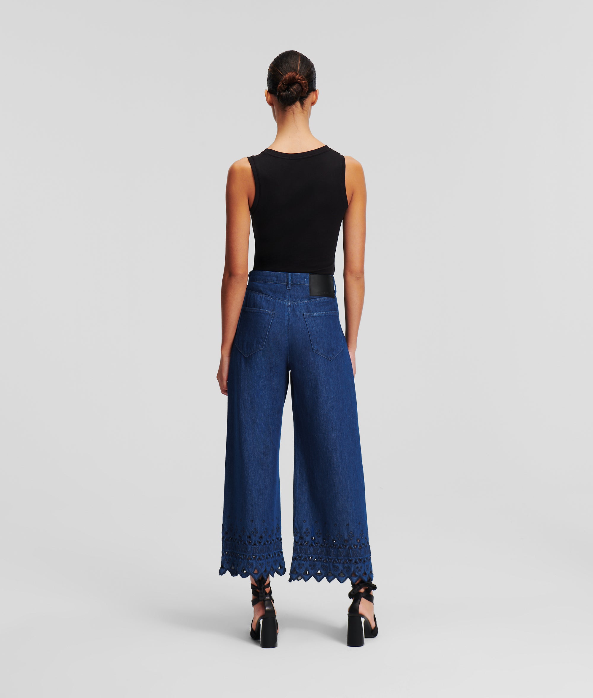 Indulge in the fusion of classic denim and artisanal flair with these cotton jeans, featuring distinctive broderie anglaise detailing at the hem, a modern culotte cut, and timeless five-pocket design.