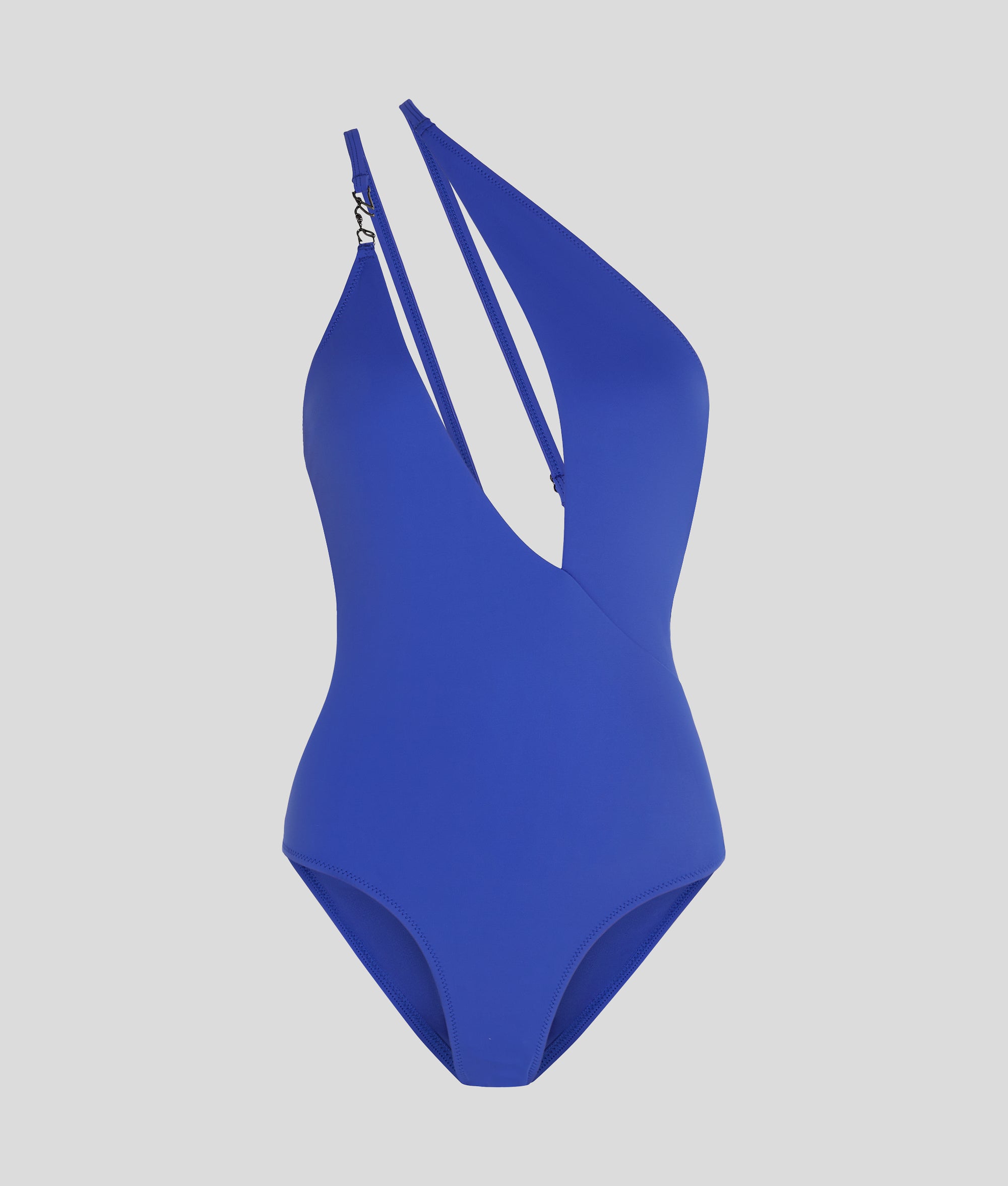 This striking swimsuit offers a modern asymmetric, crossover design, enhanced by a sleek plunging neckline. Adjustable shoulder straps ensure a tailored fit, while a KARL Signature metal charm adds a touch of sophistication.