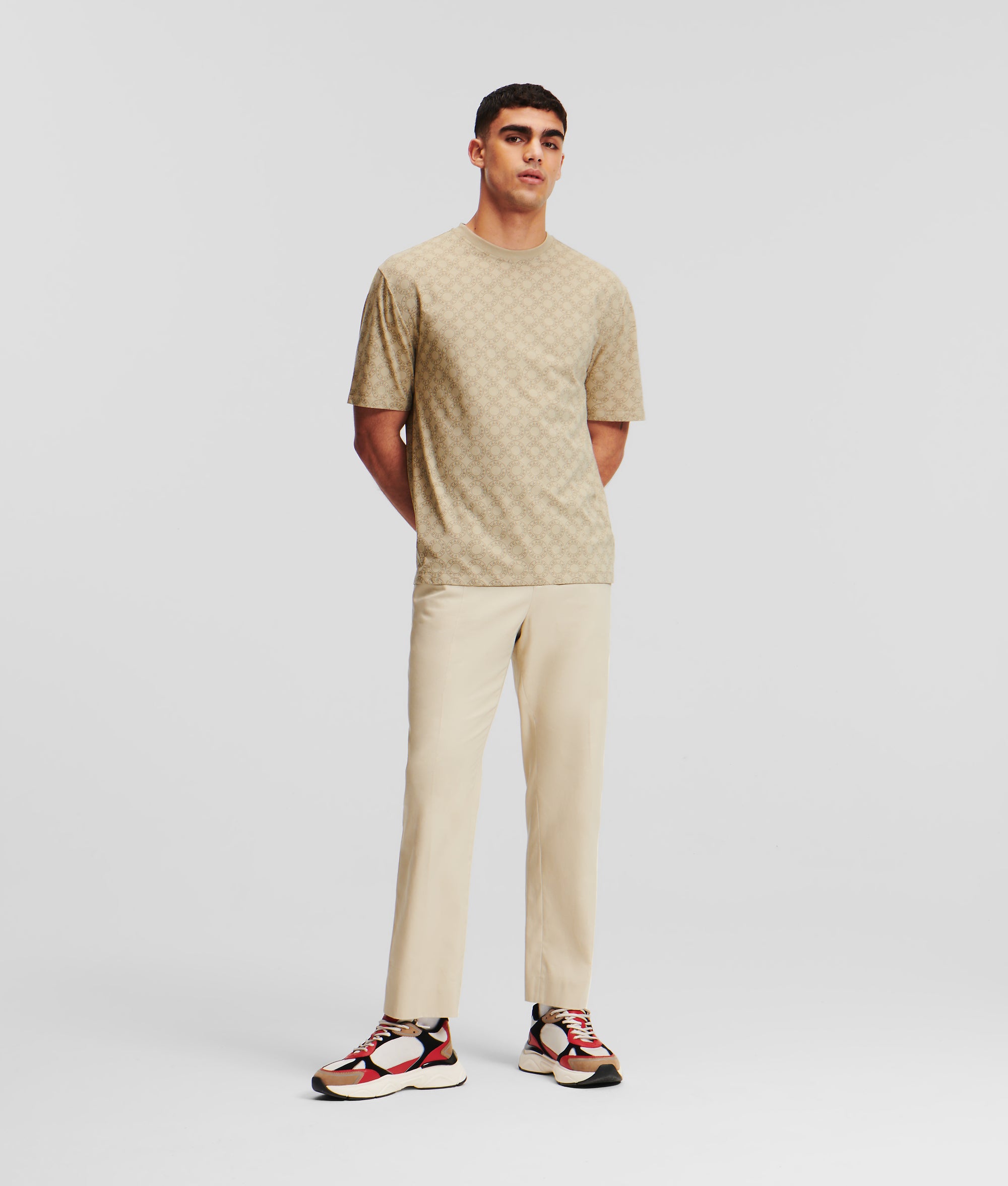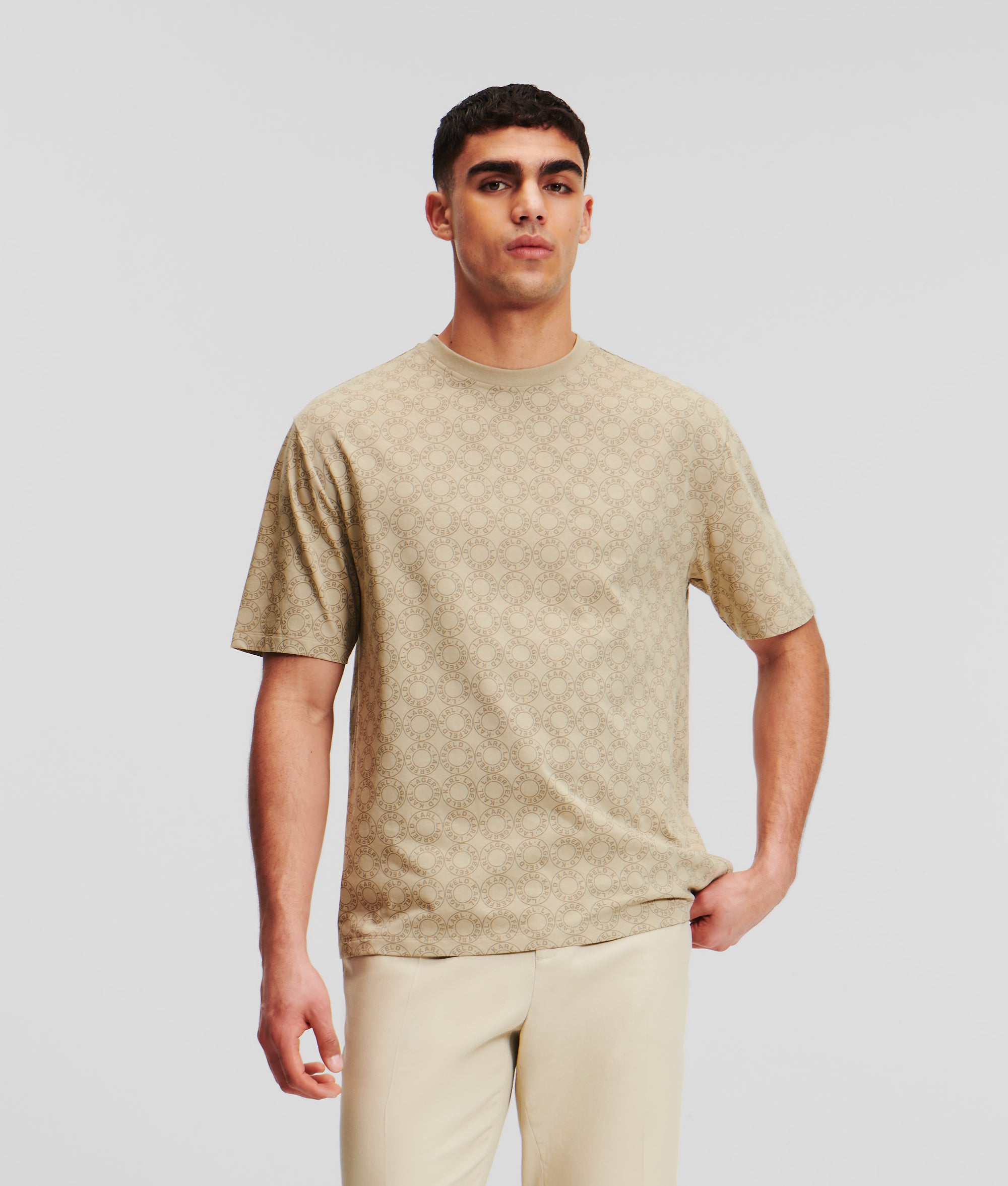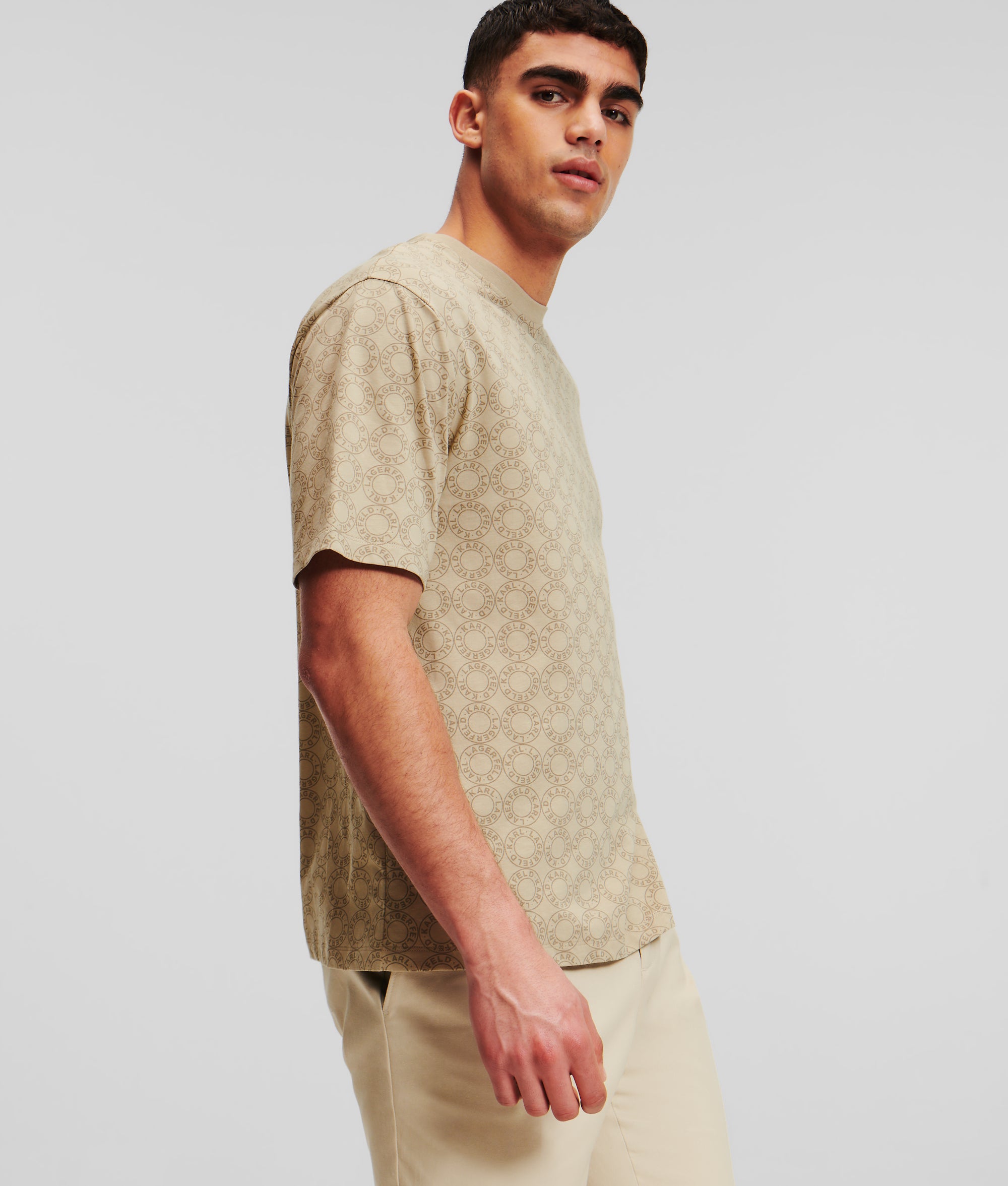 Embrace refined ease with this organic cotton T-shirt, boasting a ribbed crew neck and short sleeves, adorned with an all-over KARL LAGERFELD circular logo for a touch of modern luxury.