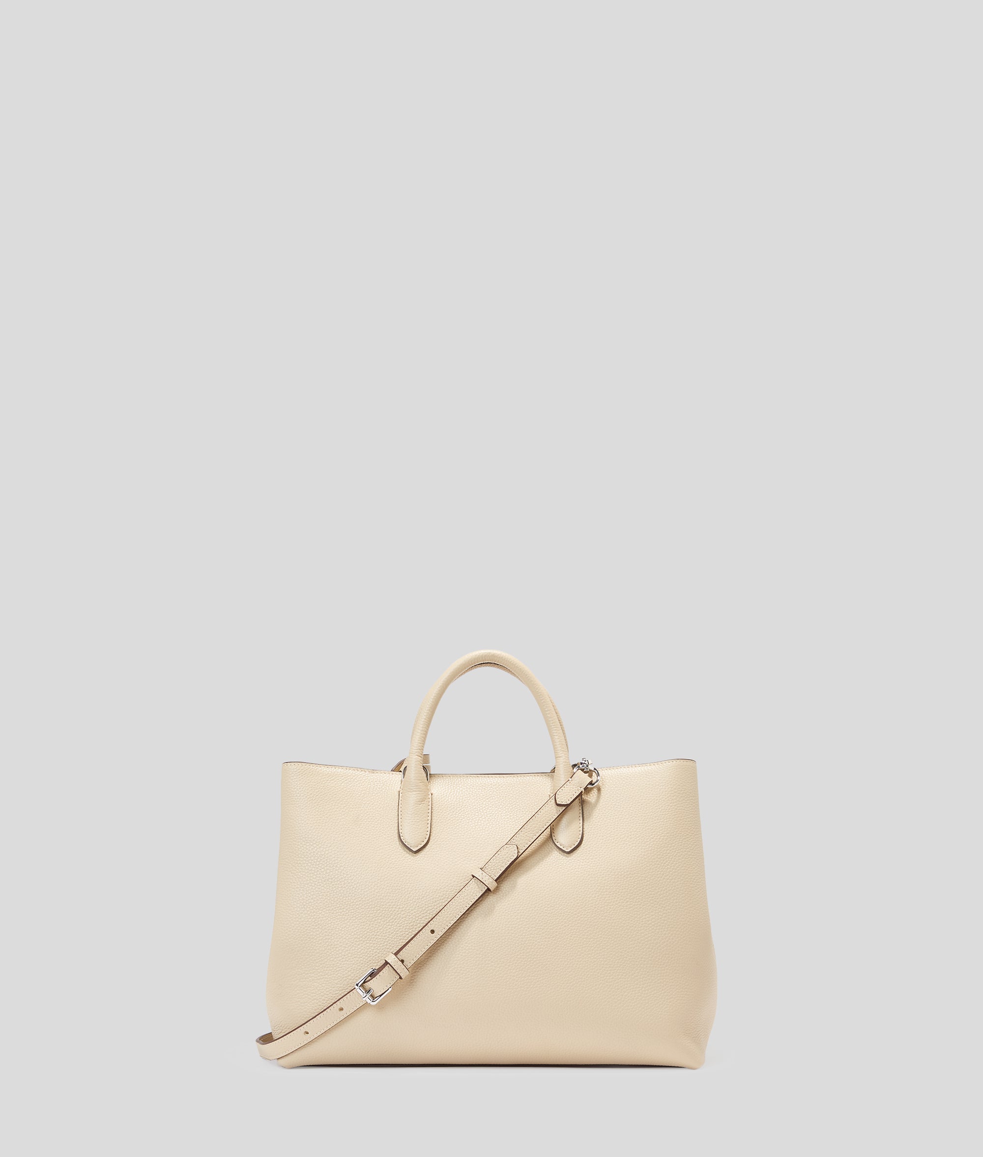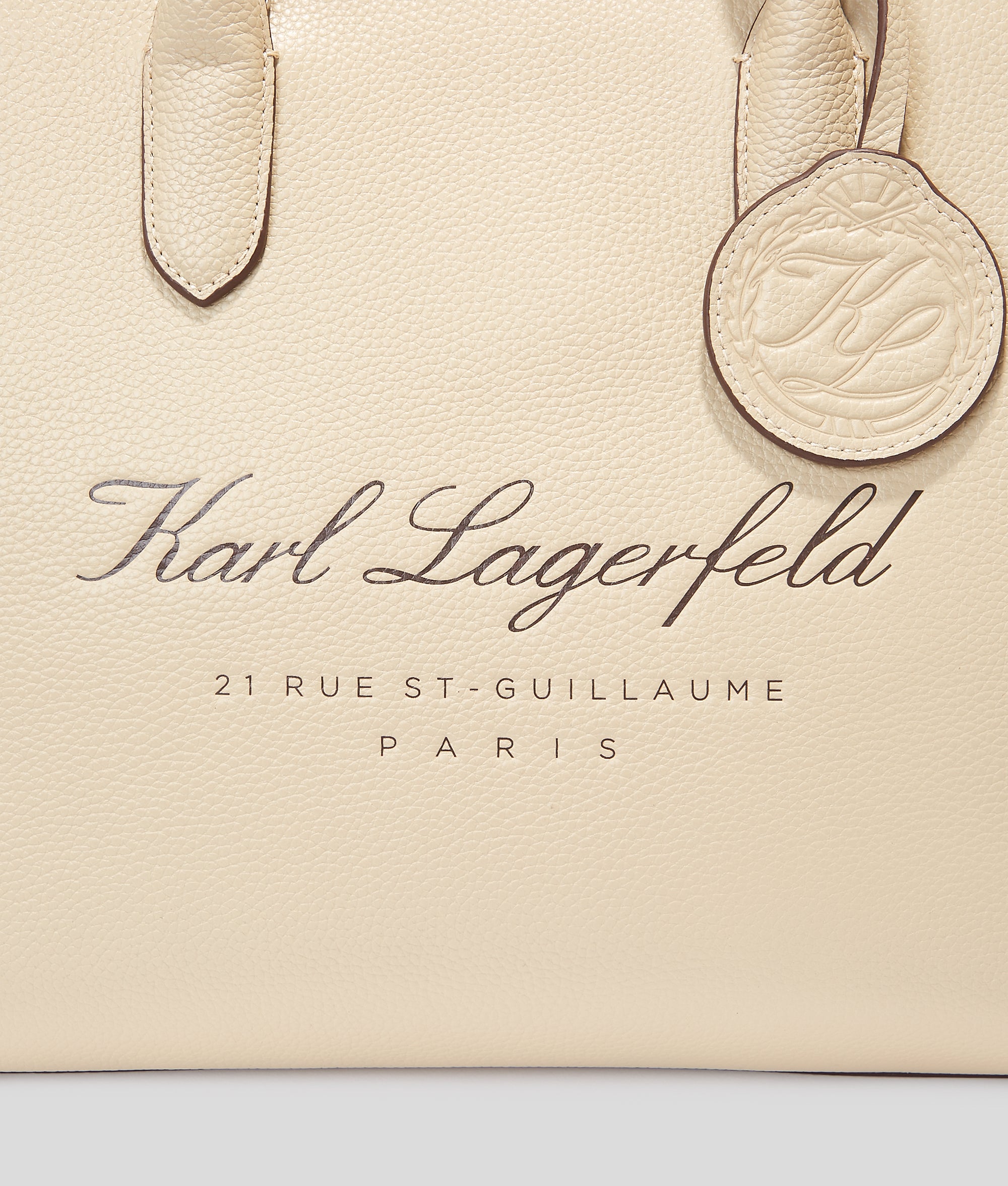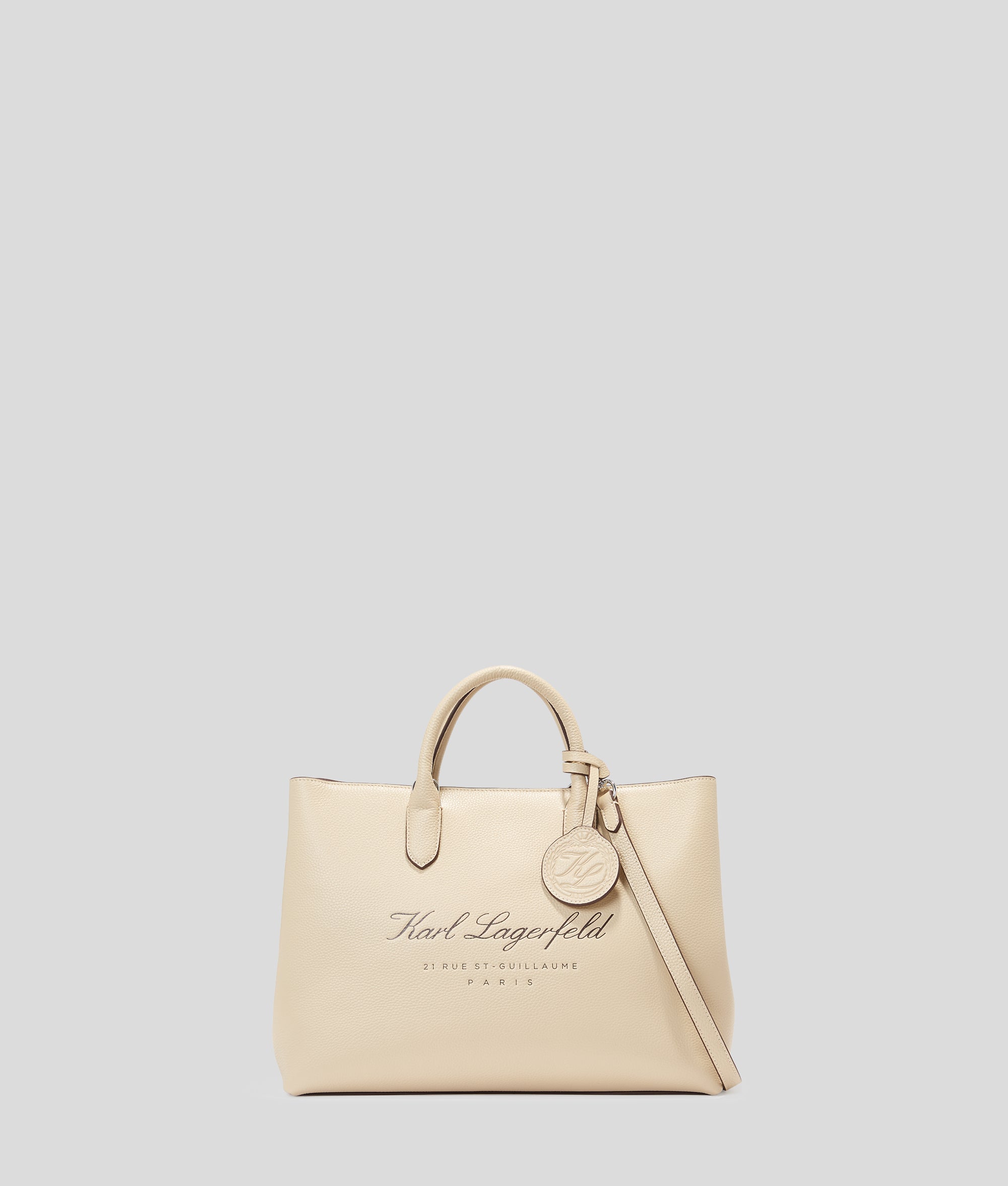 Sculpted in sumptuous pebbled leather, this satchel features a zip-top closure, detachable crossbody strap, and an embossed leather fob. The Hotel KARL motif adds an air of exclusivity.