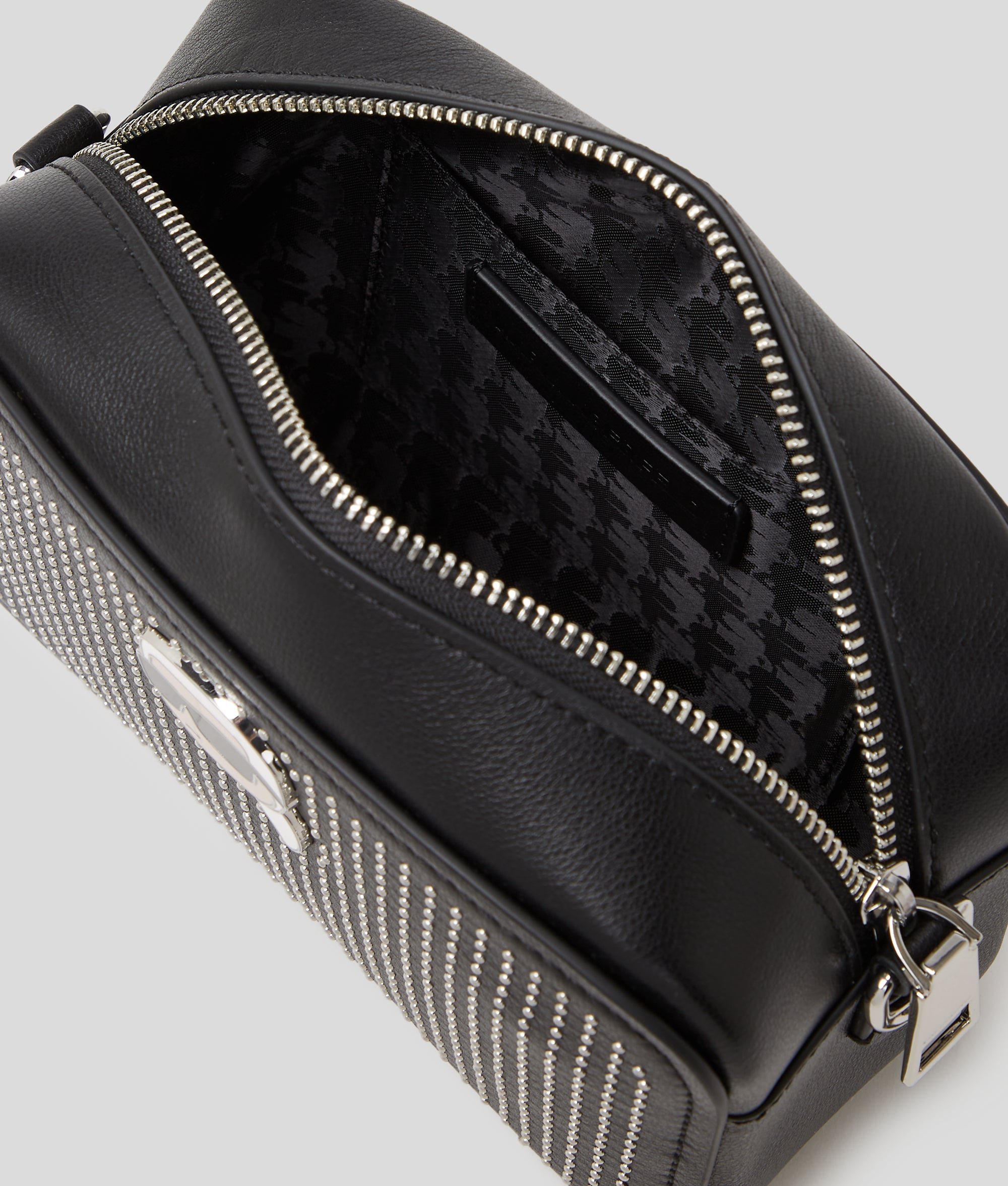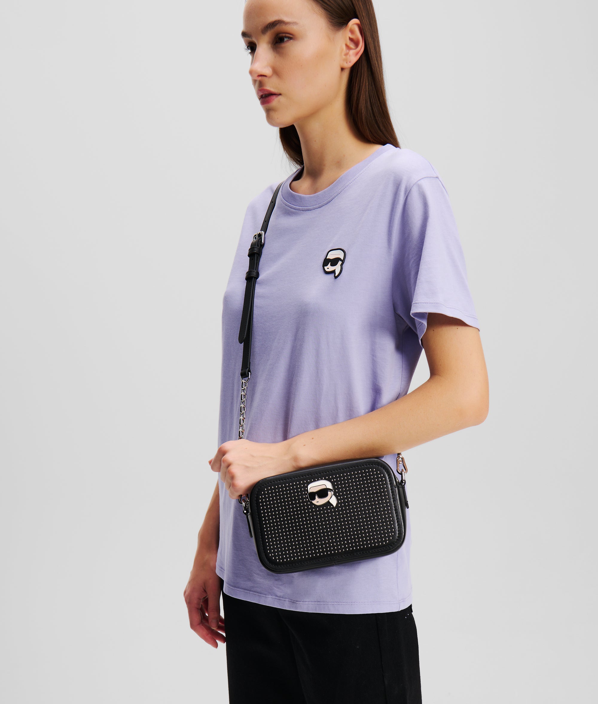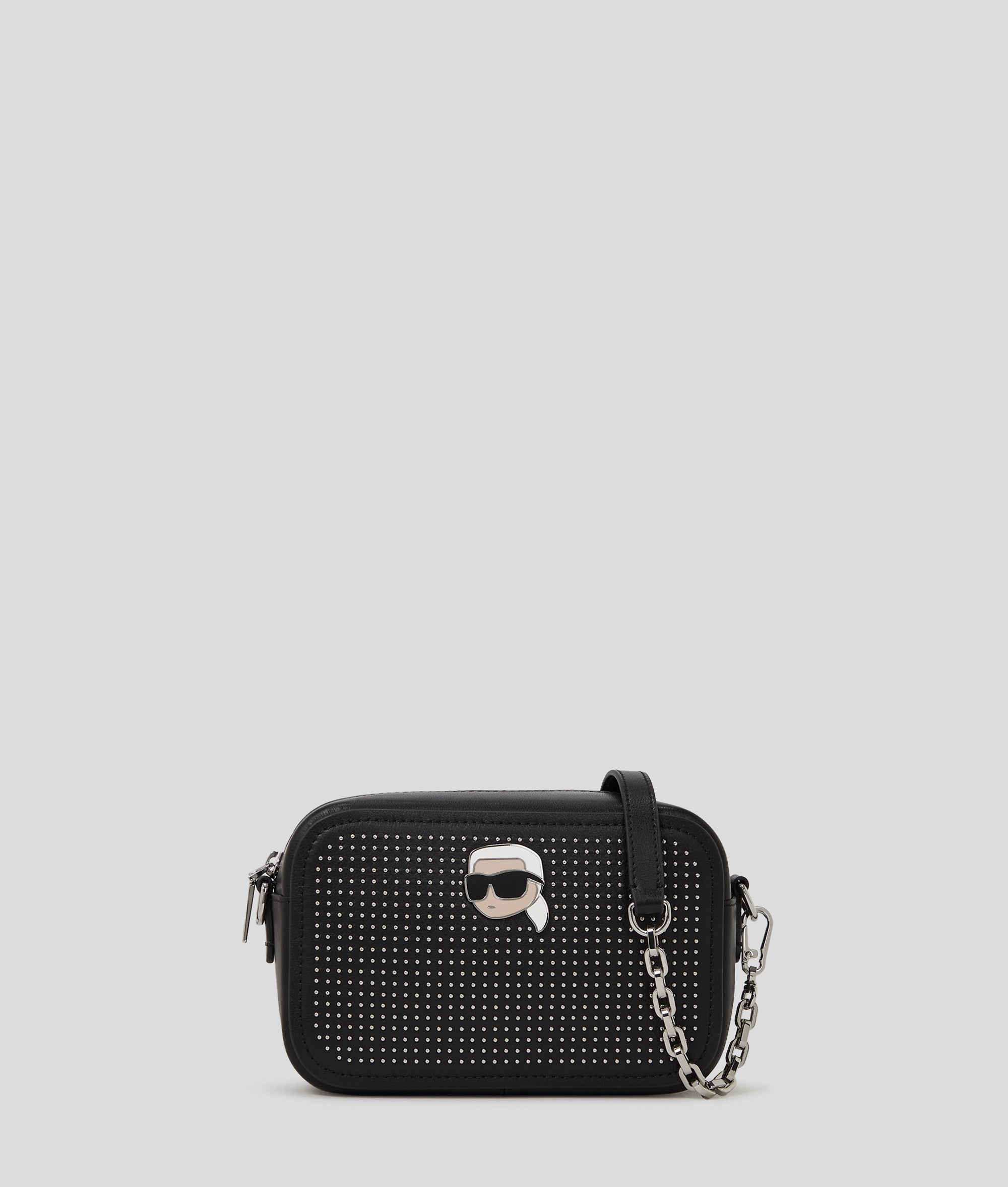 Edgy style and playful sophistication unite in the IKON crossbody bag. Featuring all-over stud detailing and IKON Karl hardware, this piece offers versatile clutch-to-crossbody styling with a detachable leather and chain strap.