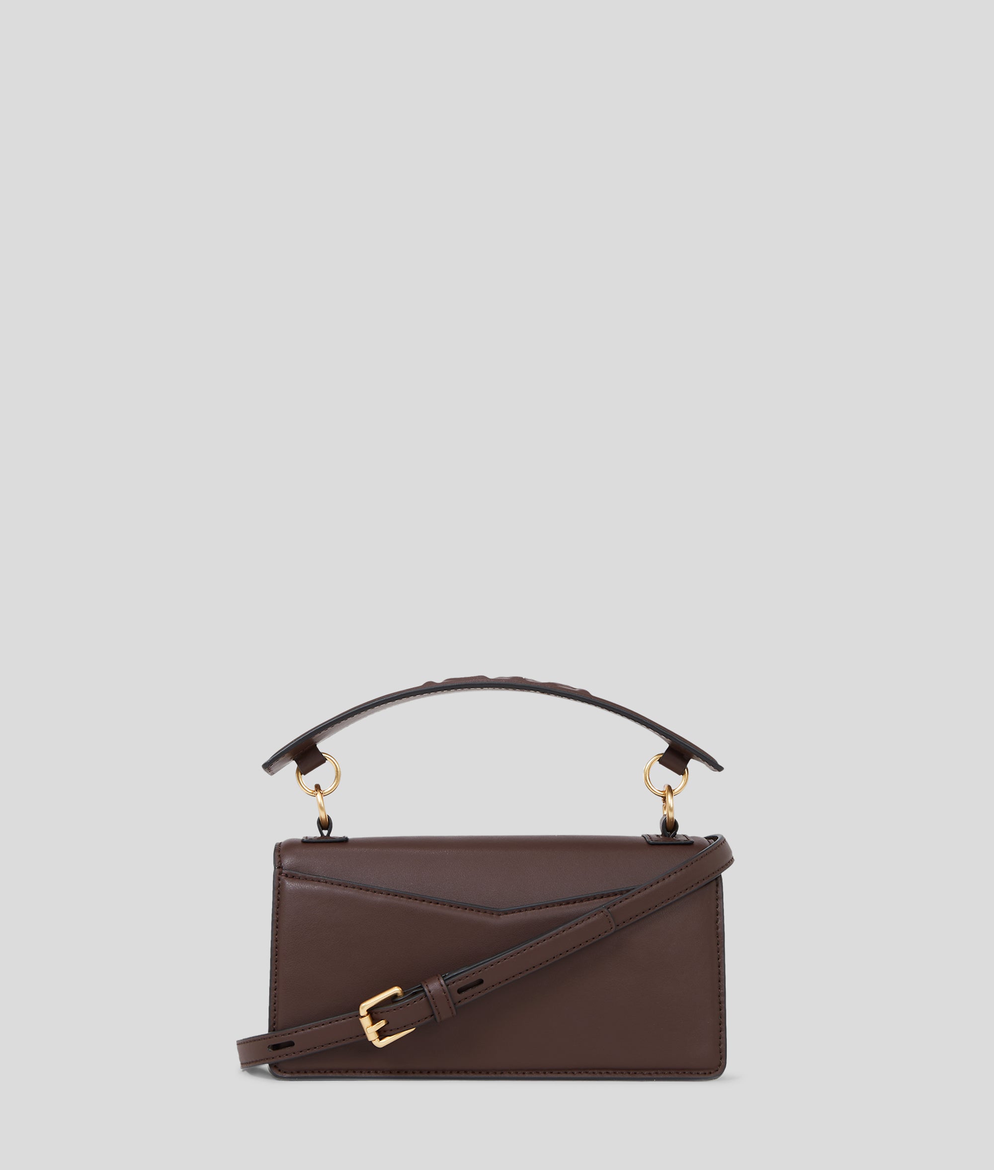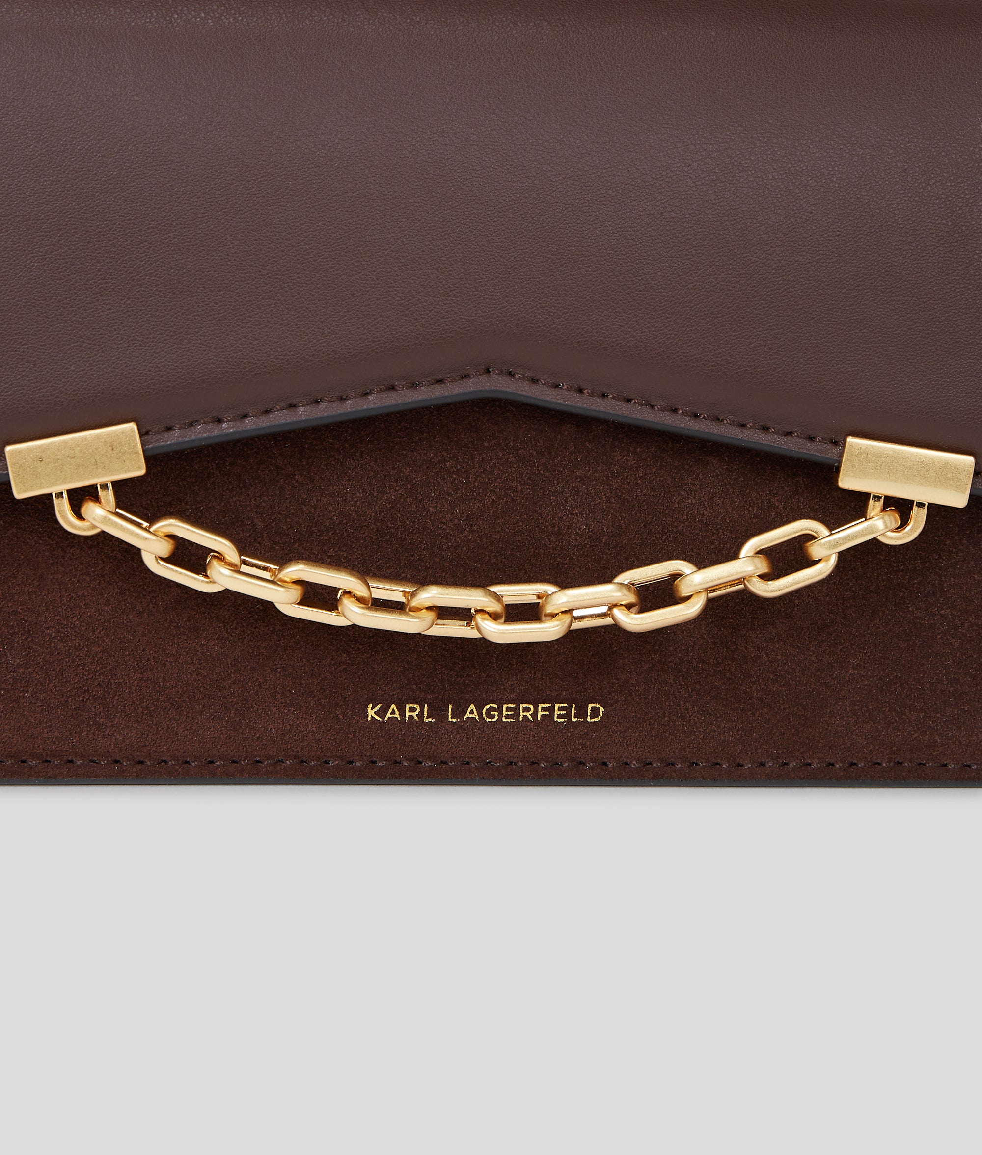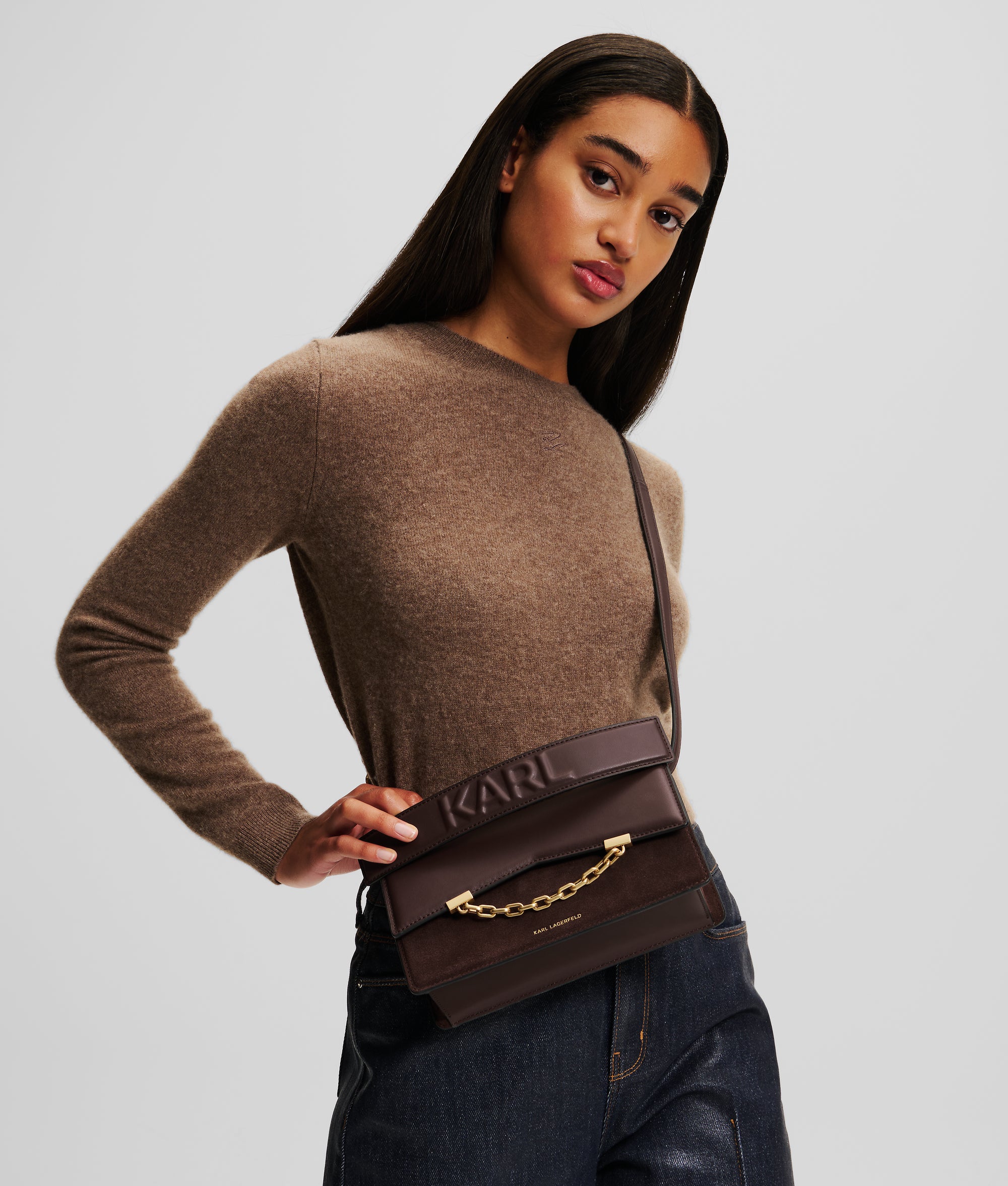 Exquisitely crafted with suede leather accents, the K/SEVEN crossbody bag features a chic flap closure and signature KARL-embossed top handle. Designed with a detachable crossbody strap for versatile styling, chain embellishments further elevate this bag in style.