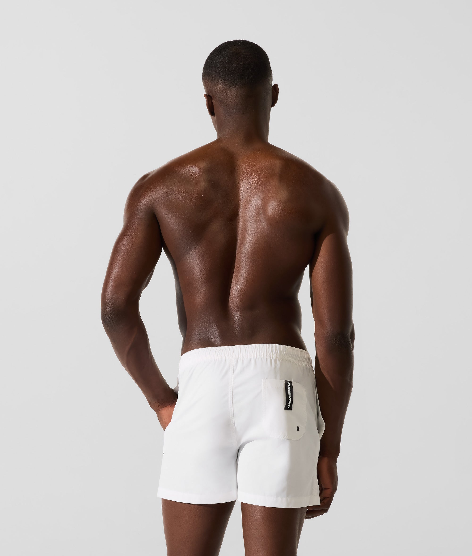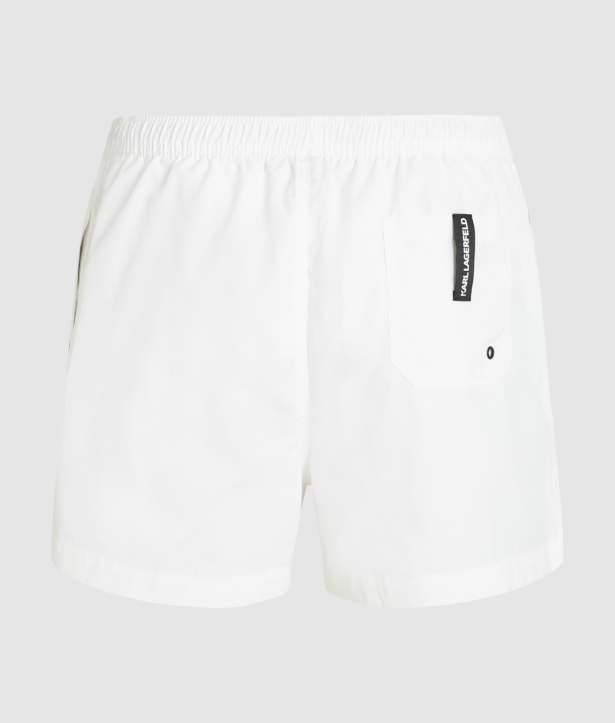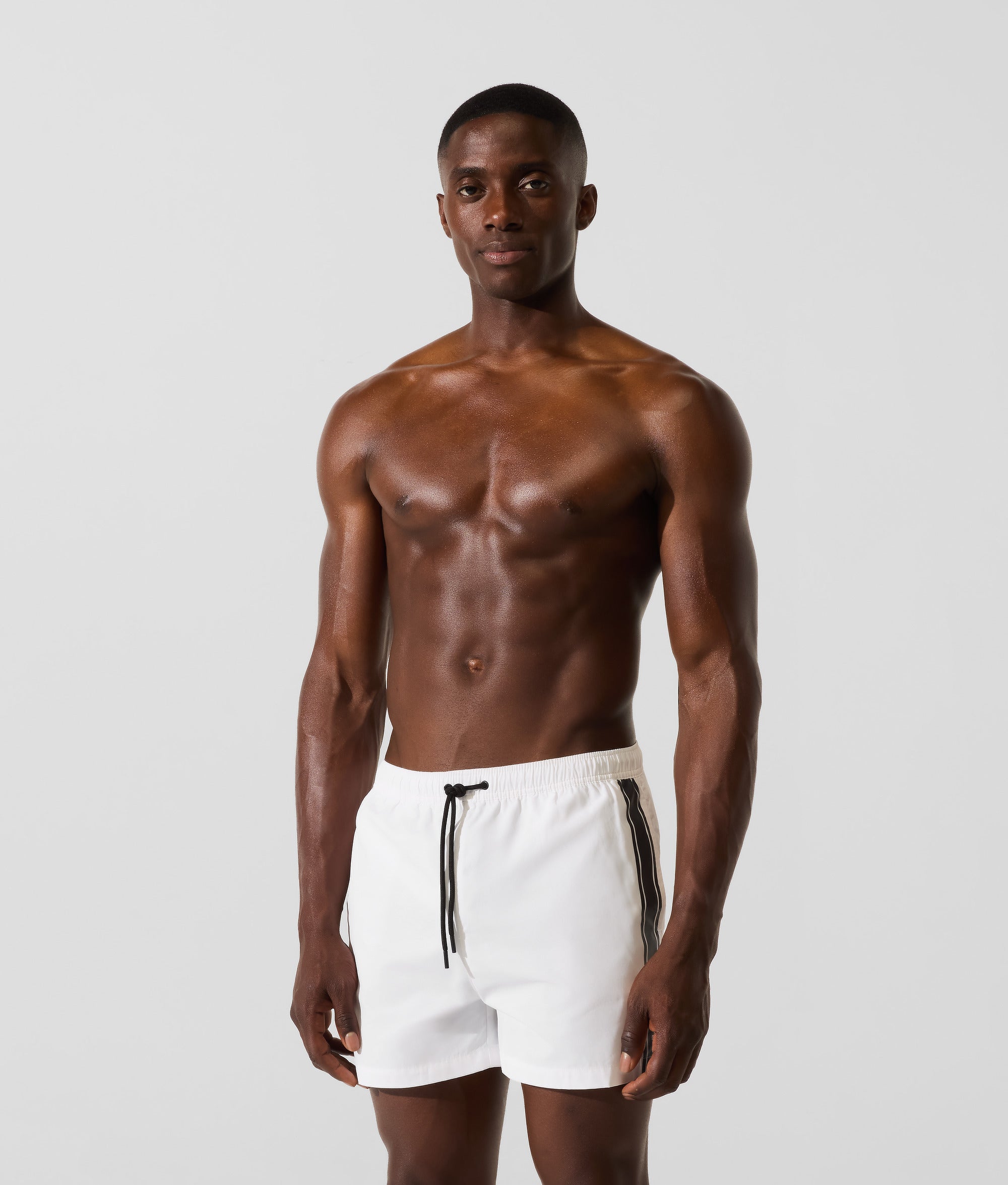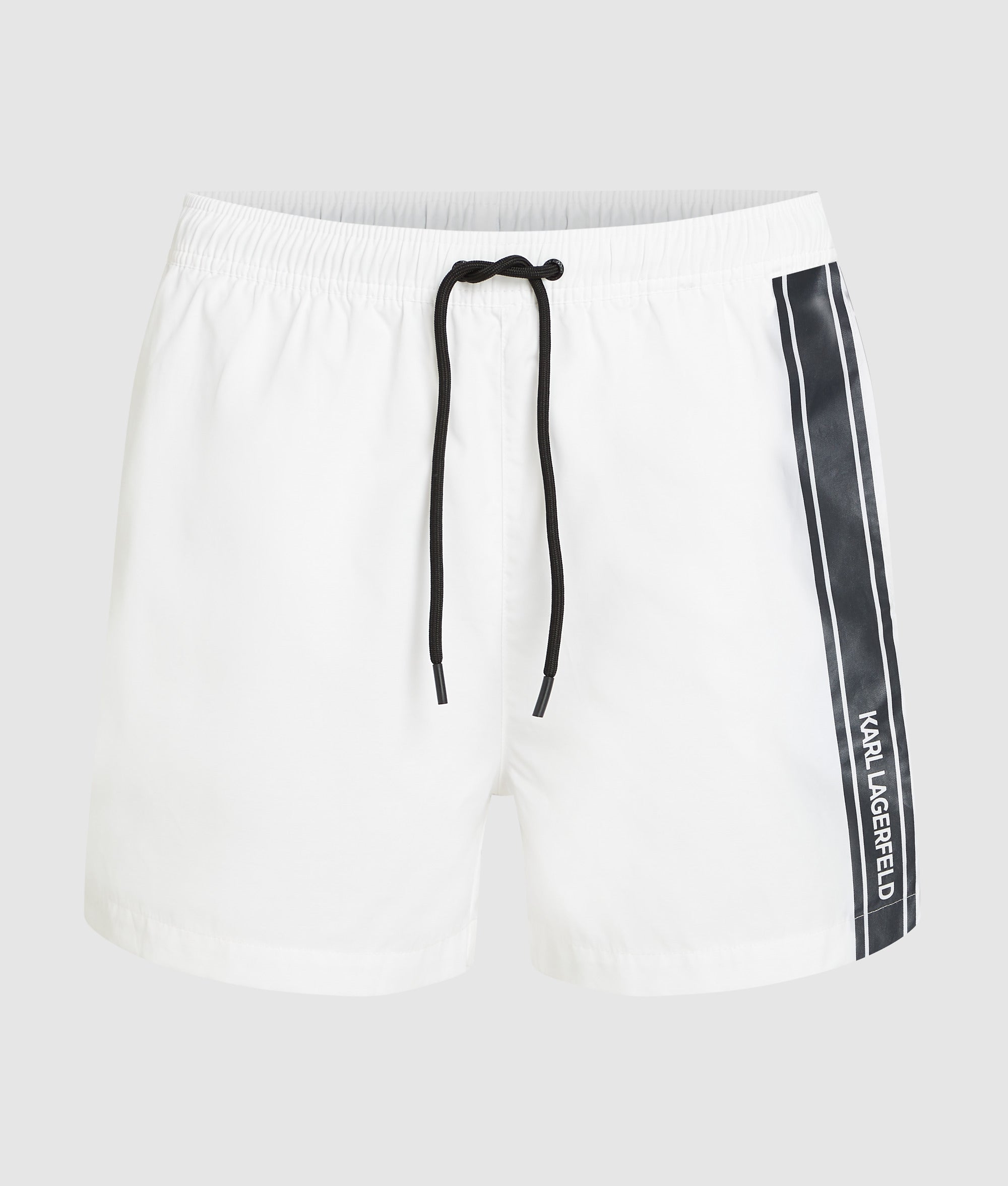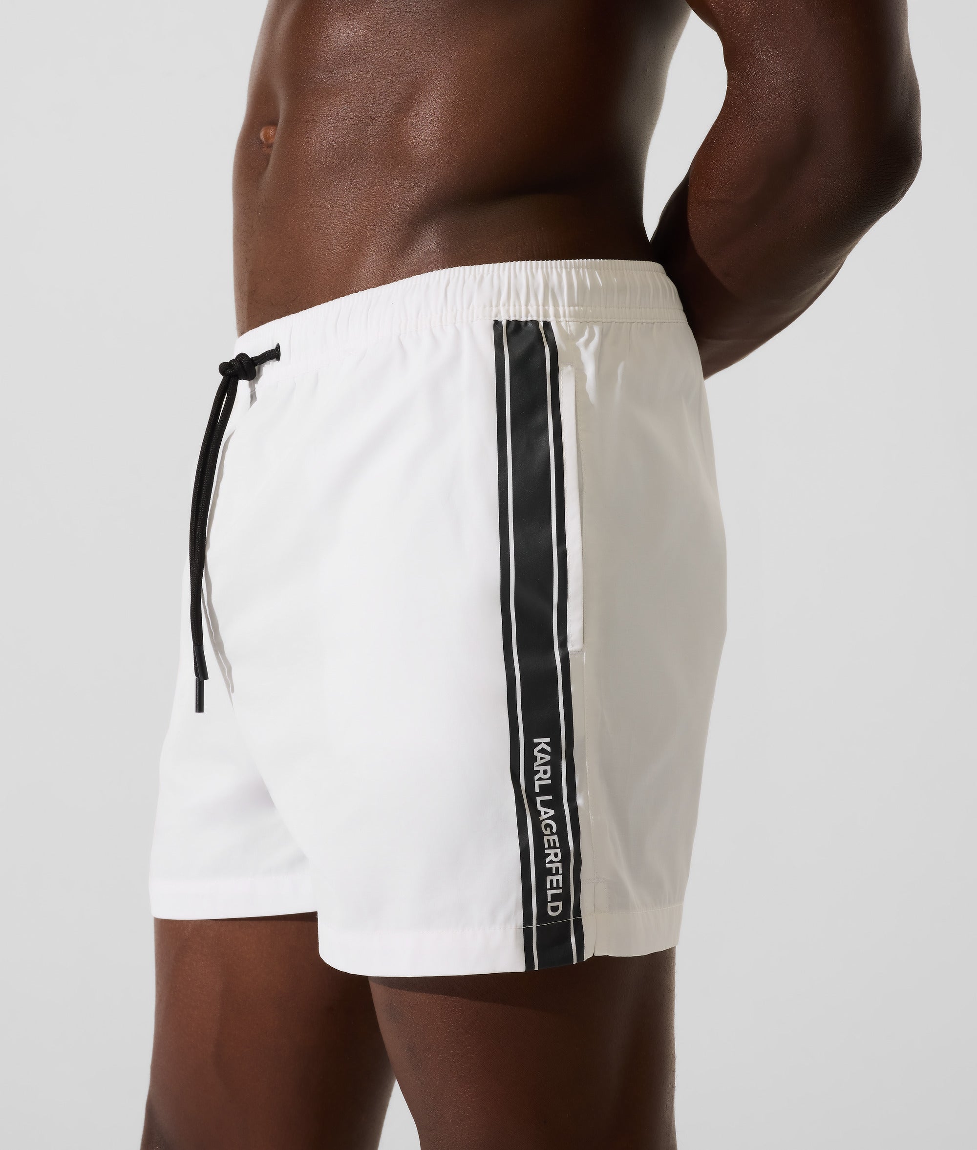For those who appreciate comfort and style, these short length boardshorts are topped with an elasticated drawcord waist for a perfect fit, while an inner mesh brief adds a layer of practicality. A striking stripe detail adorned with the iconic KARL LAGERFELD logo runs elegantly down the side, making these shorts a standout choice for any swim adventure.