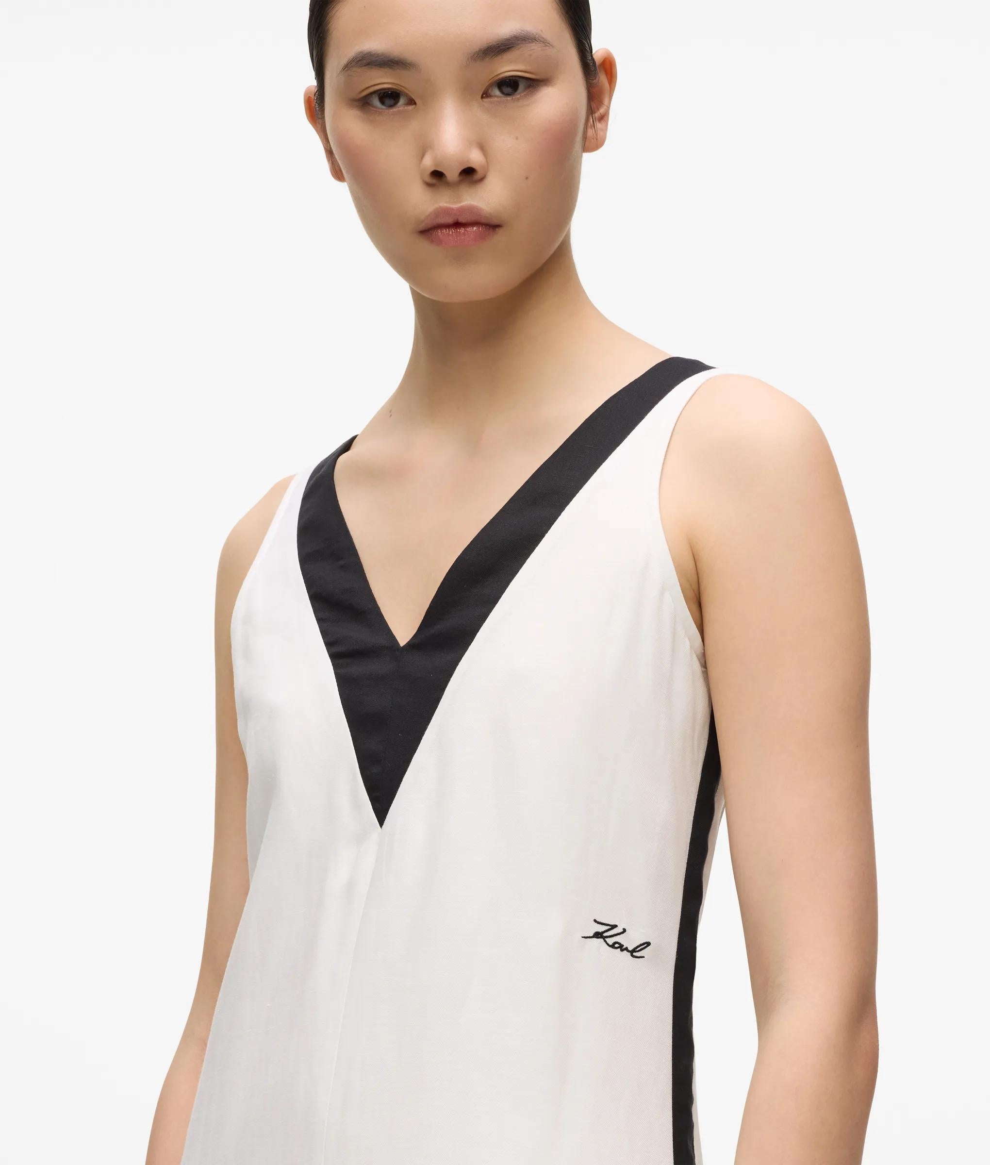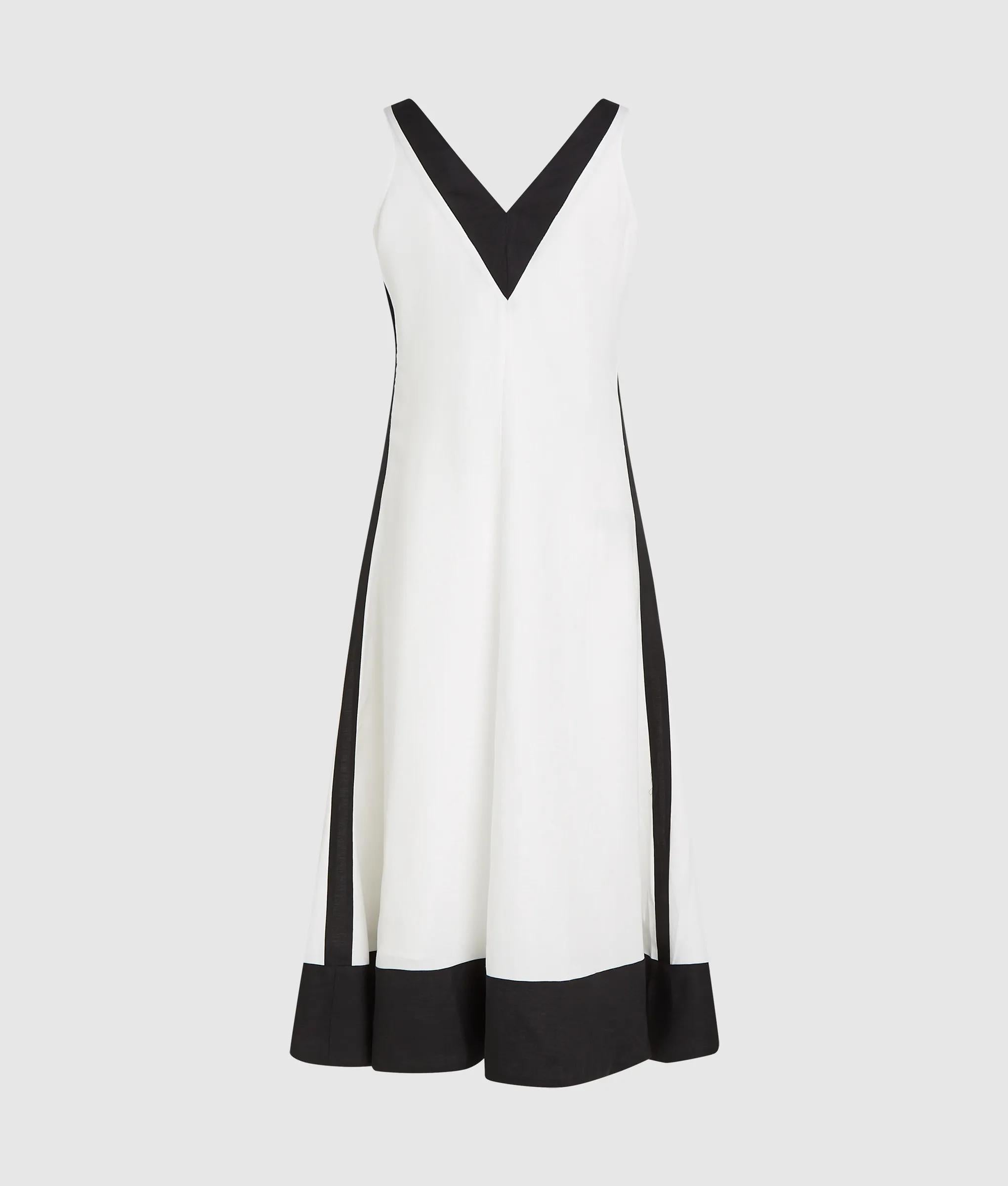 In a fluid linen blend, this sleeveless dress offers easy summer elegance. The V-neckline and contrasting side panels sculpt the shape, with tonal waist embroidery adding subtle definition for warm days from the city to the coast.