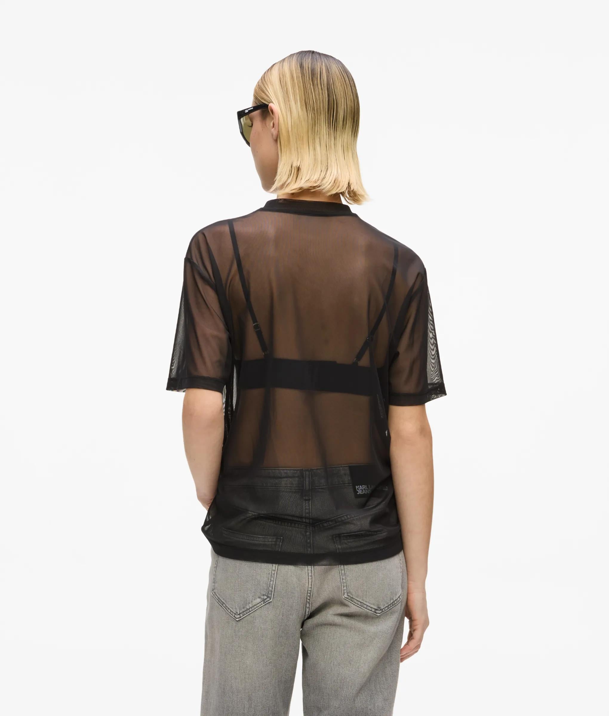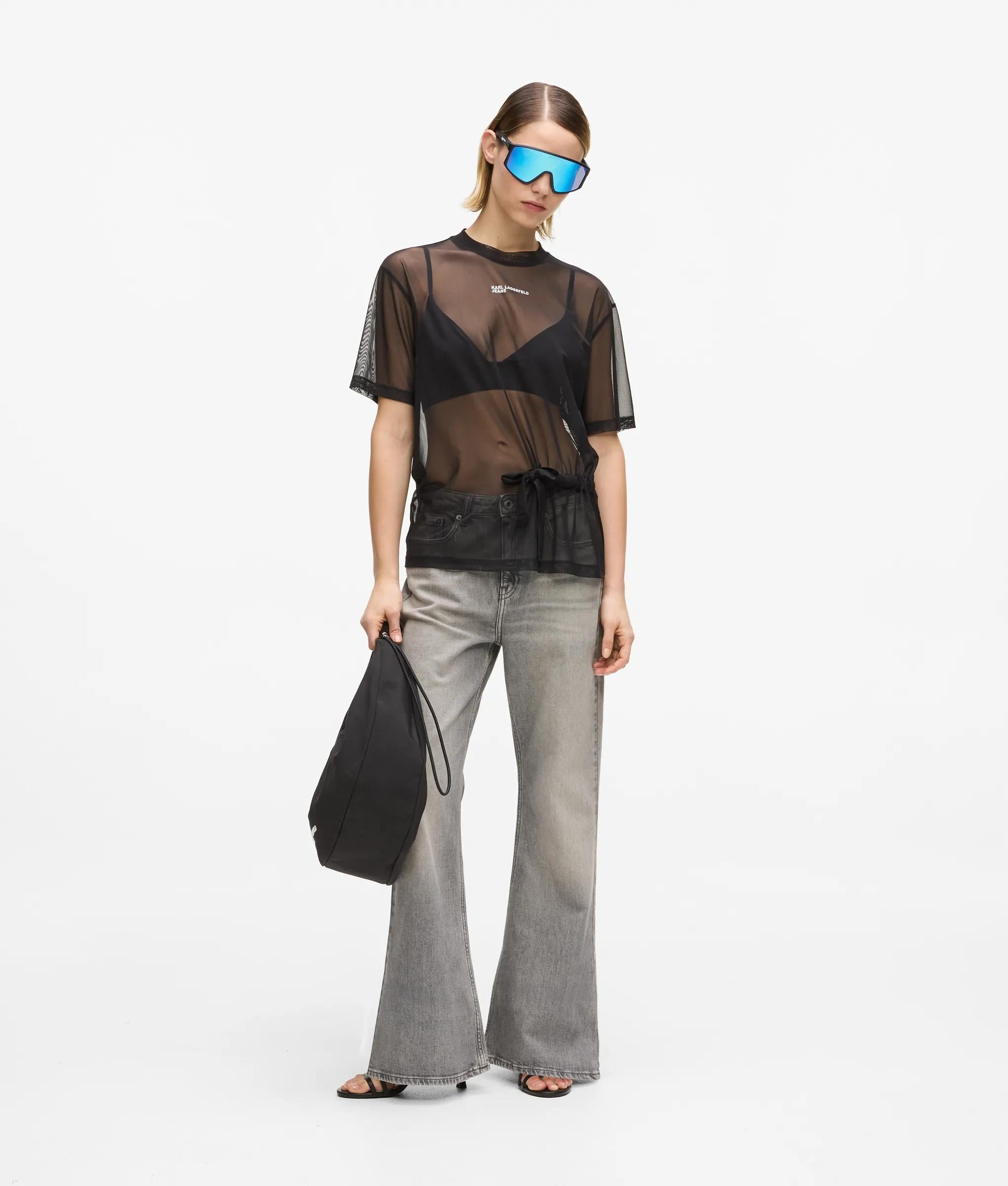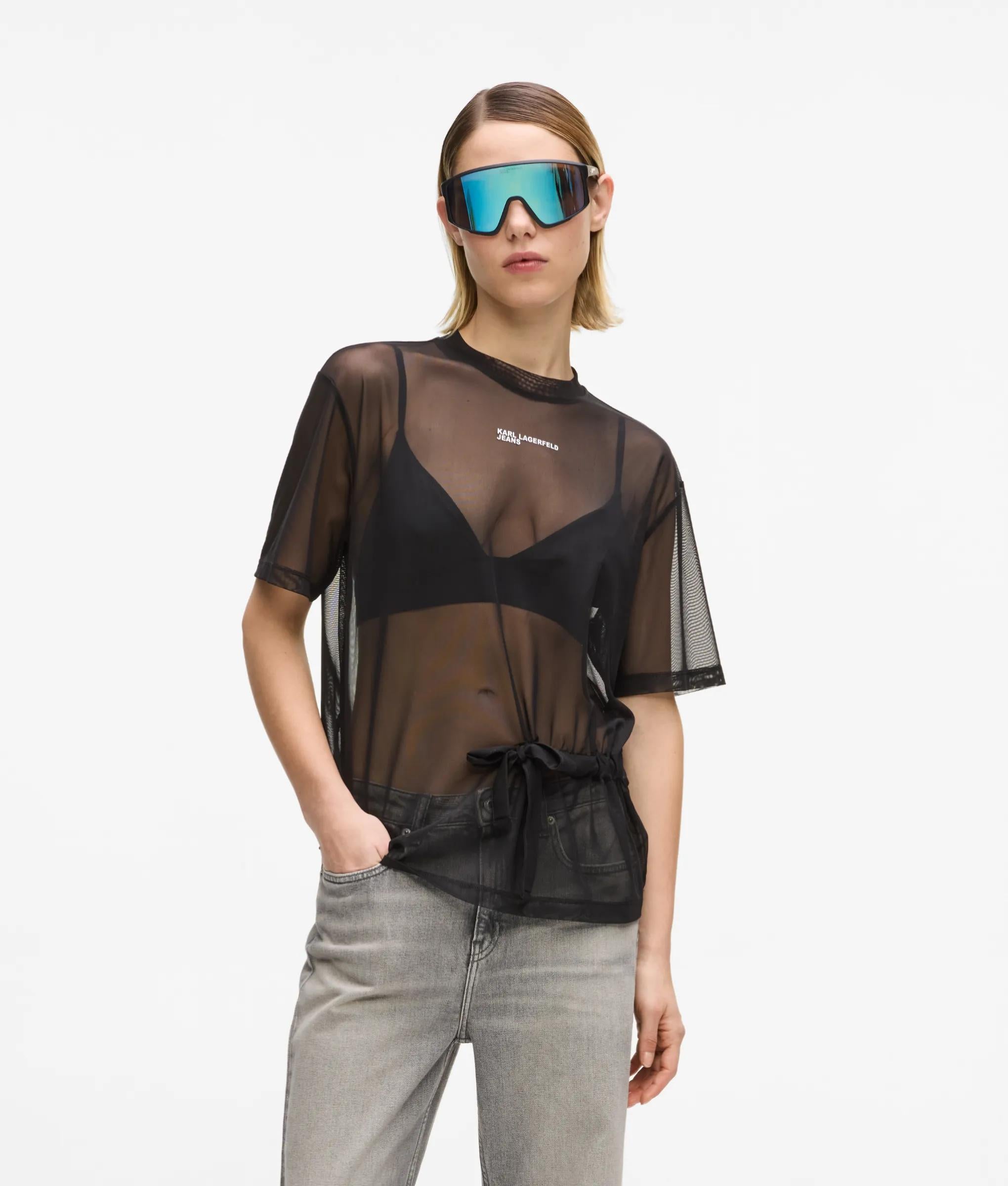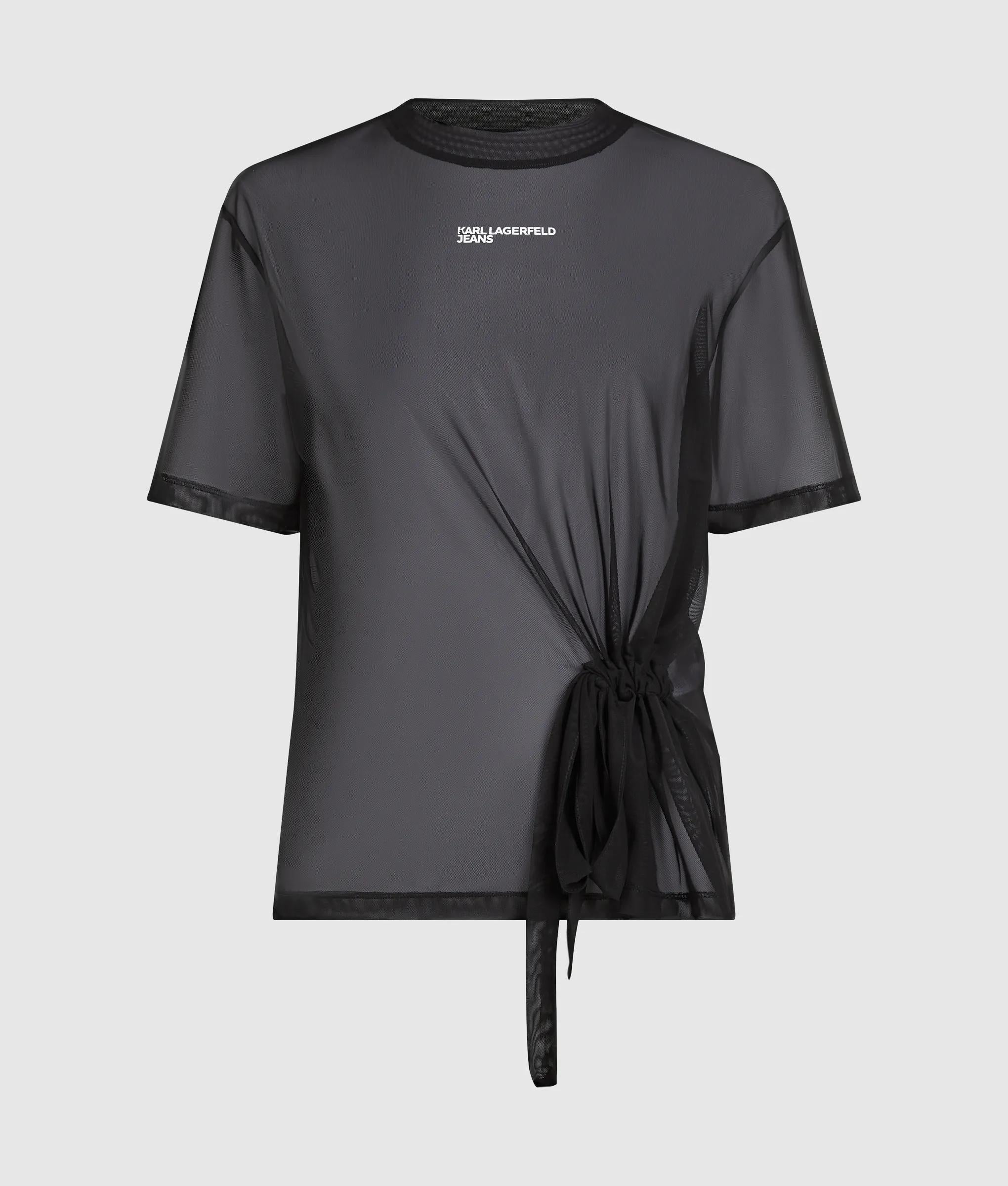Sheer mesh and a cinching tie detail bring a confident twist to the classic crew-neck T-shirt. Team yours with baggy jeans for statement streetstyle.