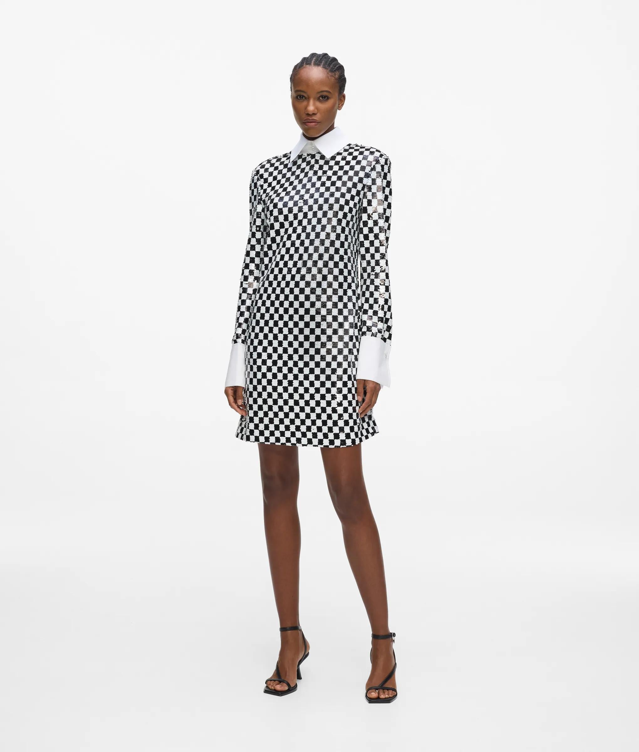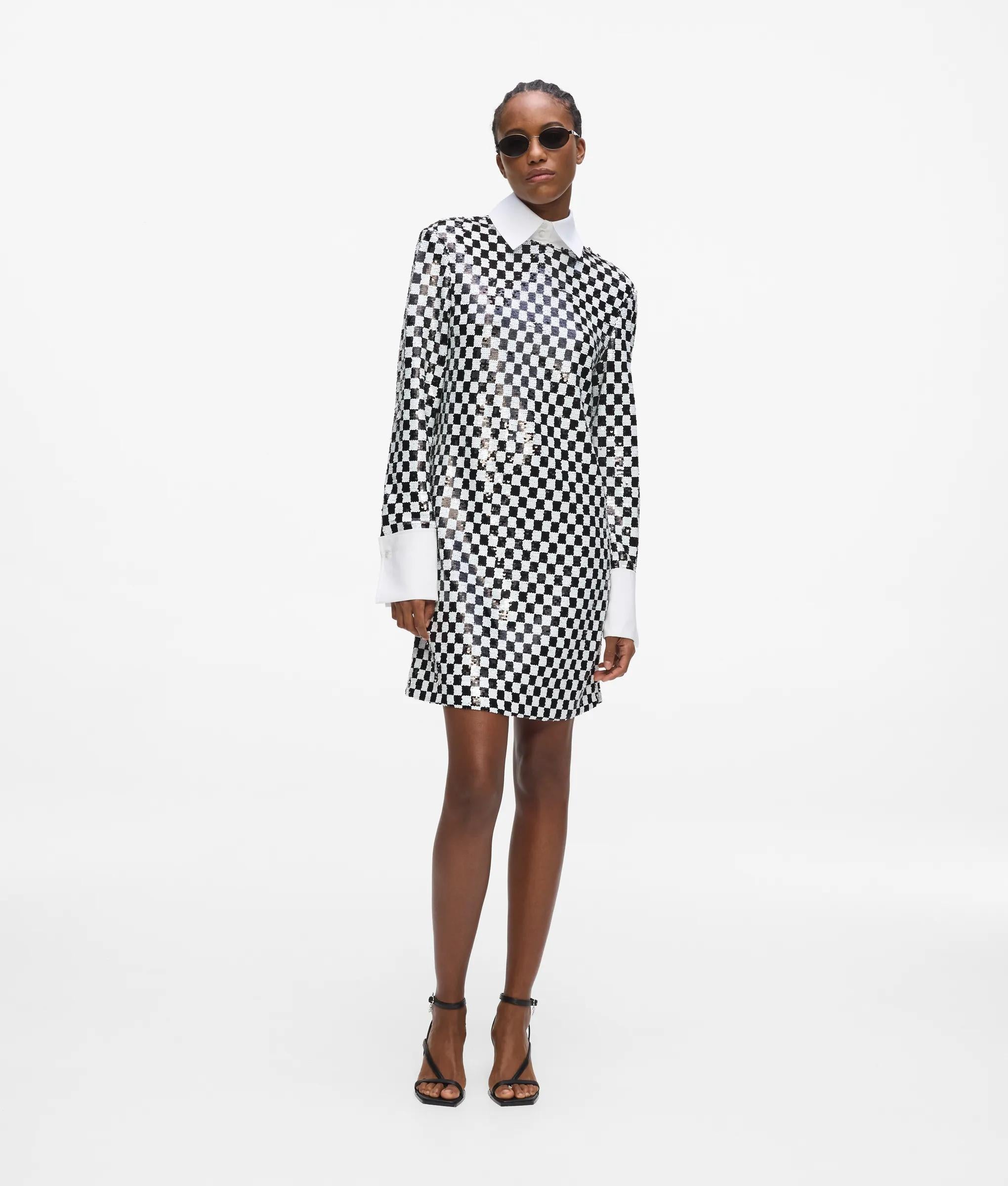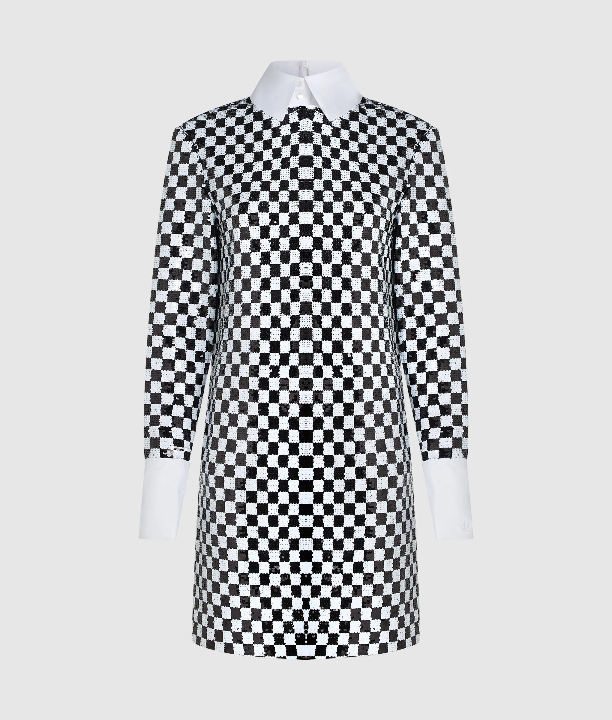 This dazzling checkerboard dress mirrors the stage costumes KARL LAGERFELD created for the Paris Opera Ballet. Sequins bring head-turning impact, while the detachable high-stand collar adds a masculine edge.